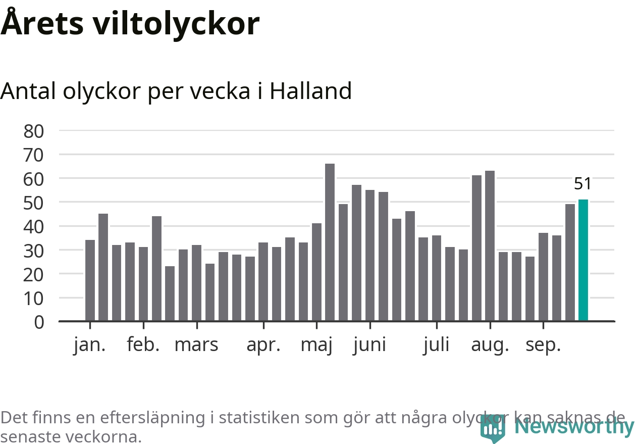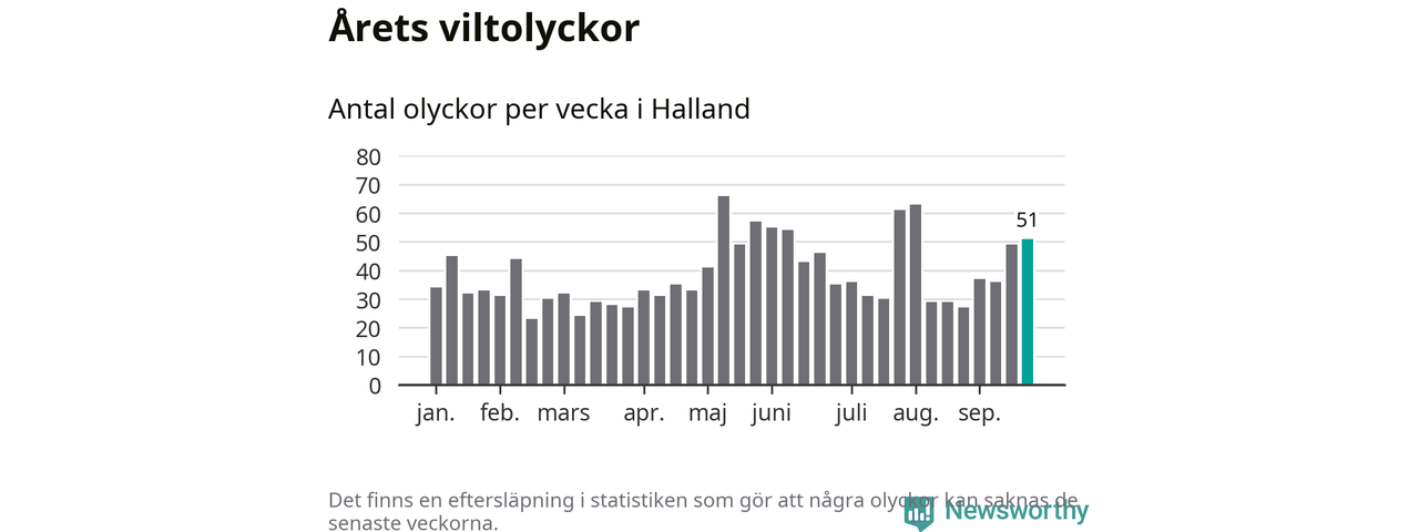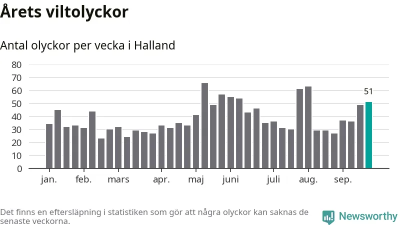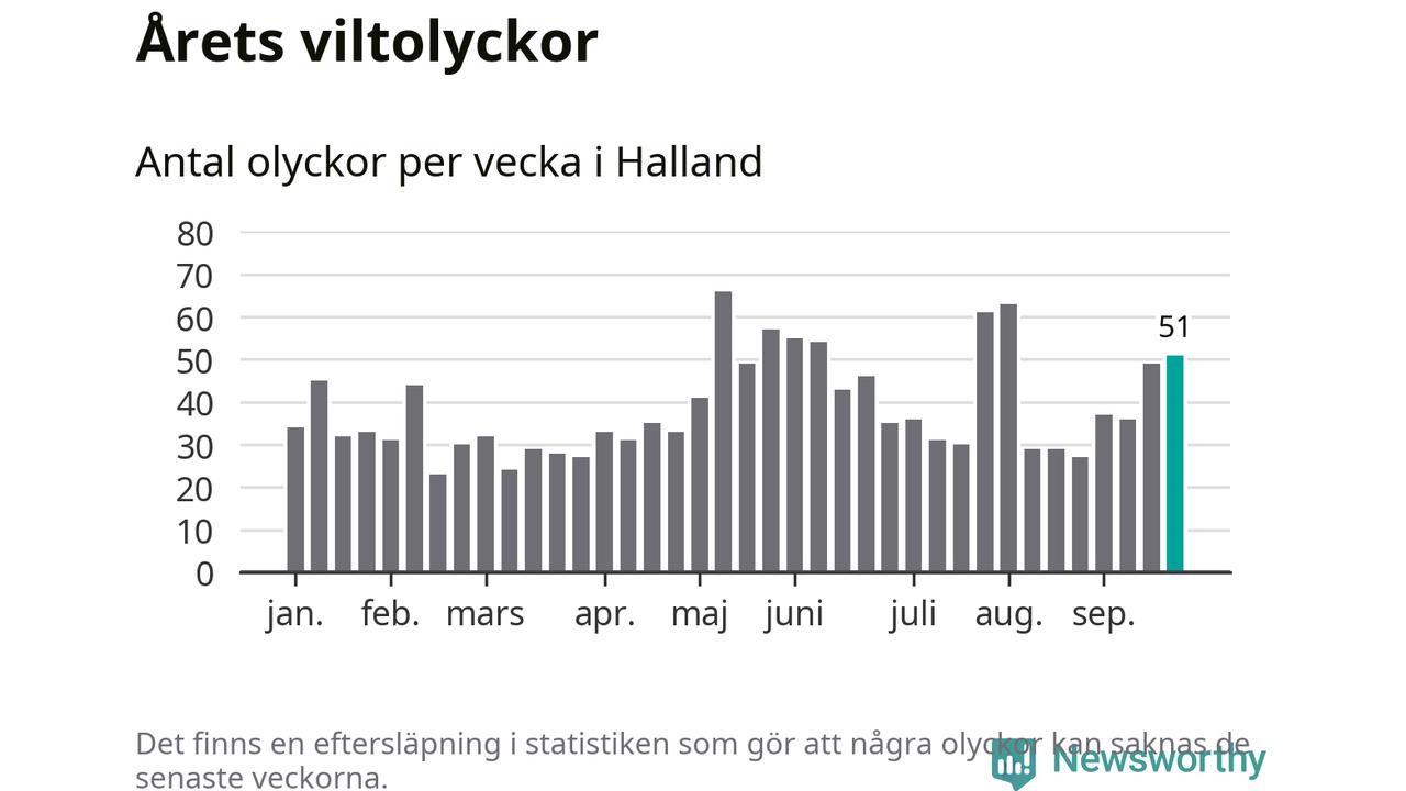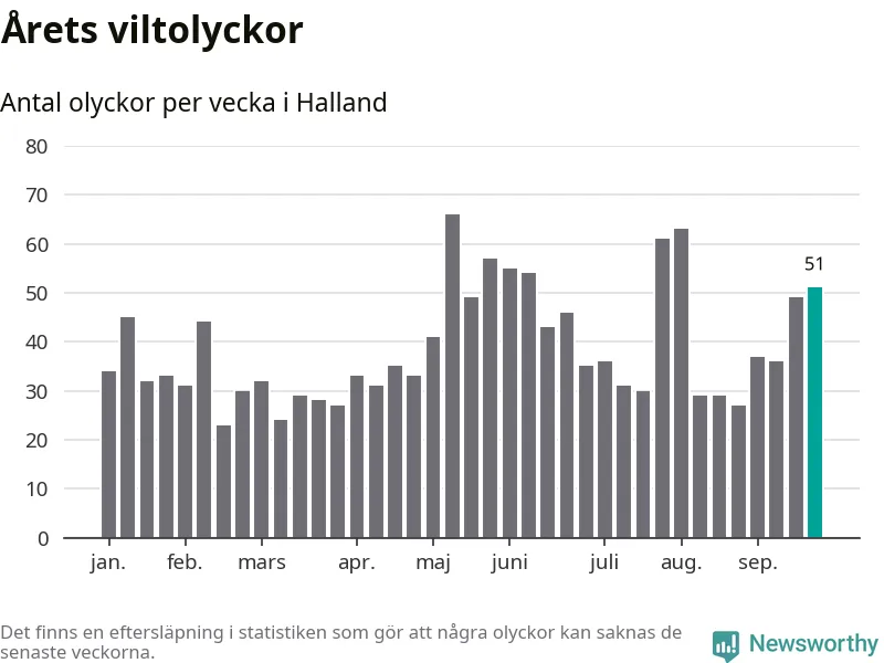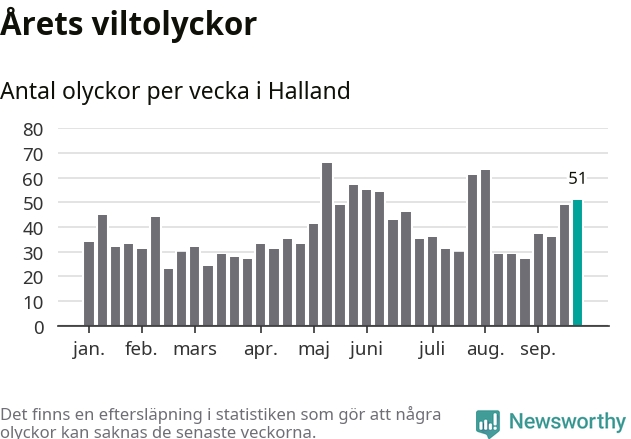 Hittills har 51 viltolyckor rapporterats in i Hallands län från vecka 39. Se listan här.