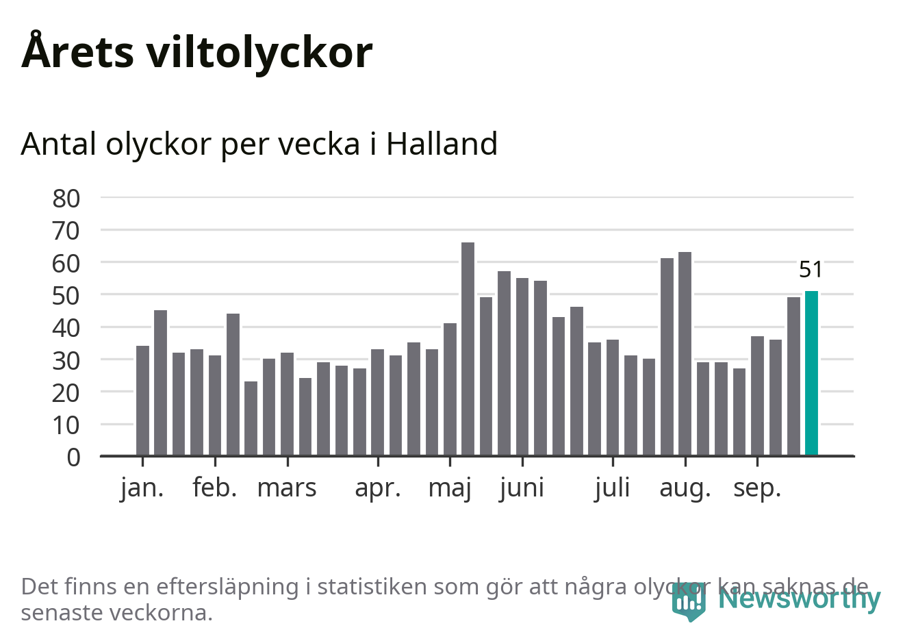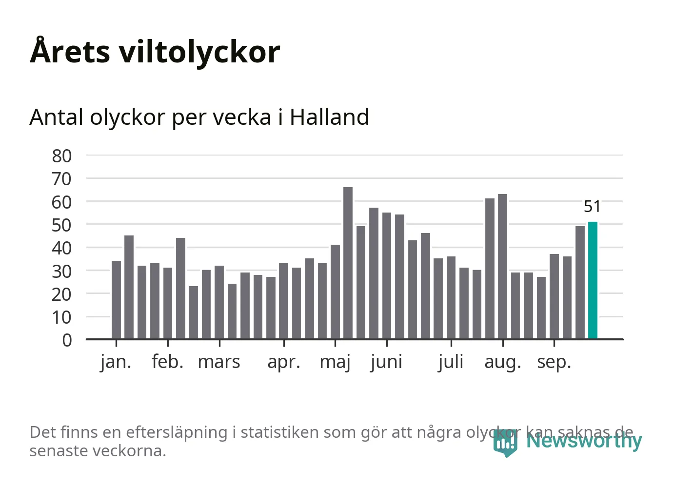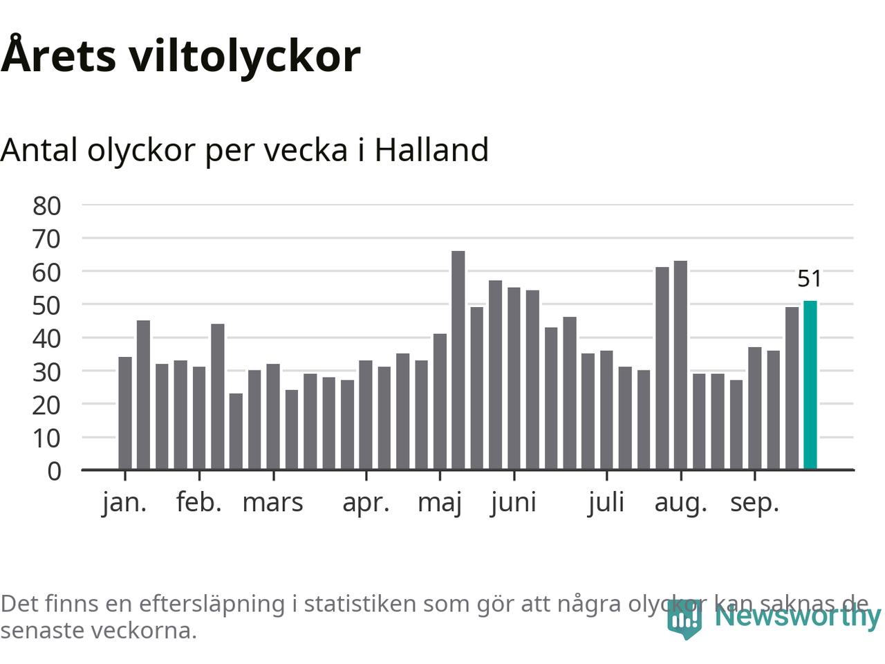 Hittills har 51 viltolyckor rapporterats in i Hallands län från vecka 39. Se listan här.