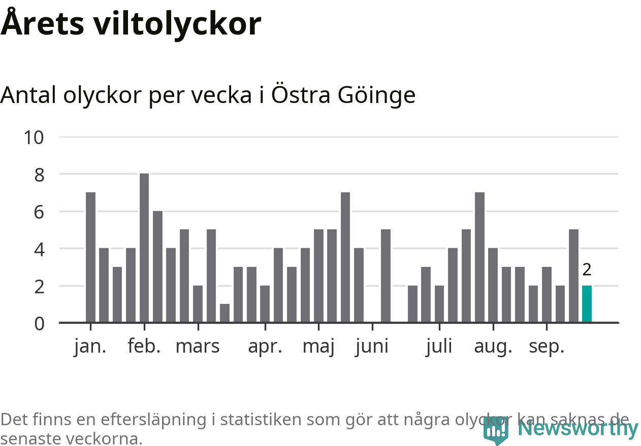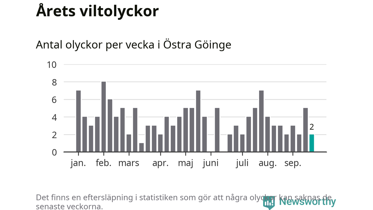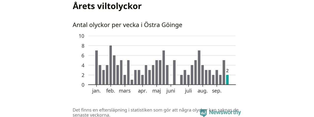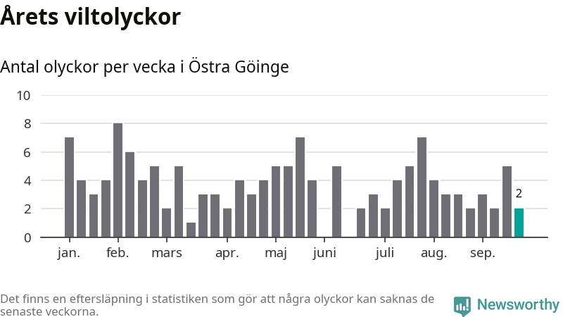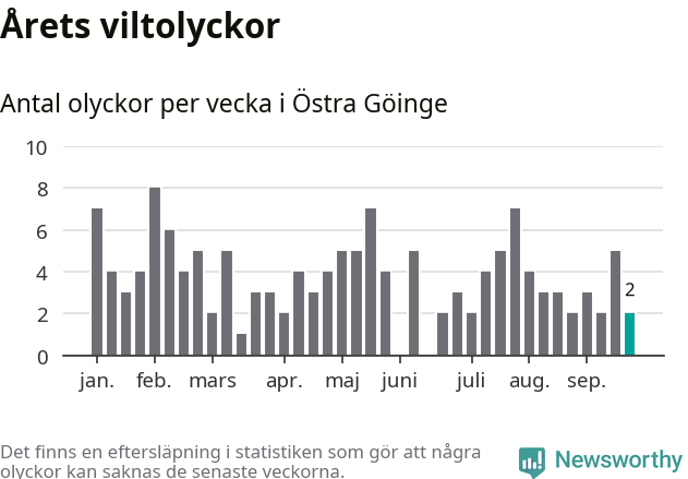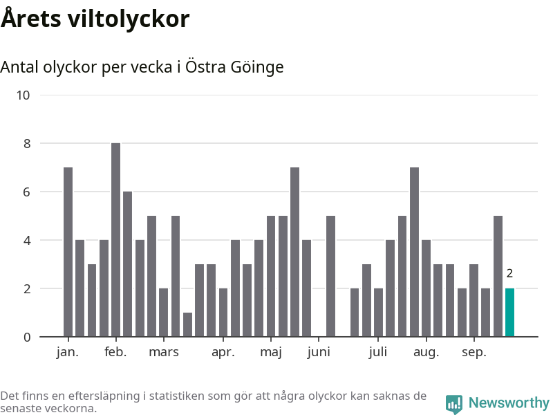 Hittills har två viltolyckor rapporterats in i Östra Göinge kommun från vecka 39. Se listan här.