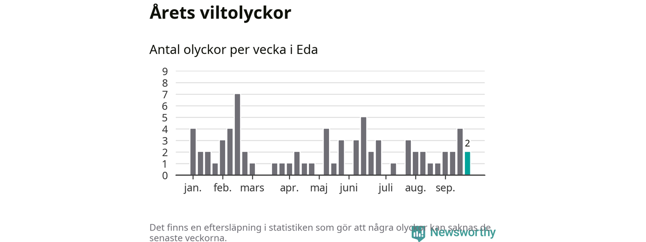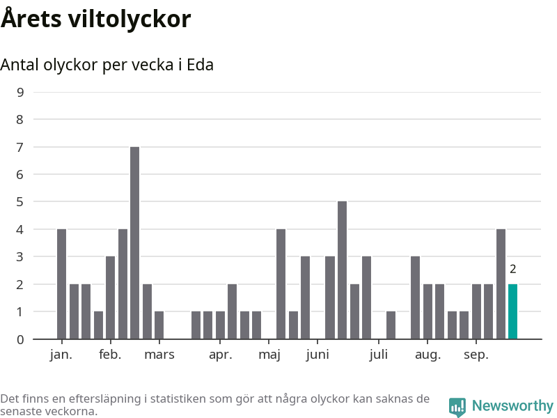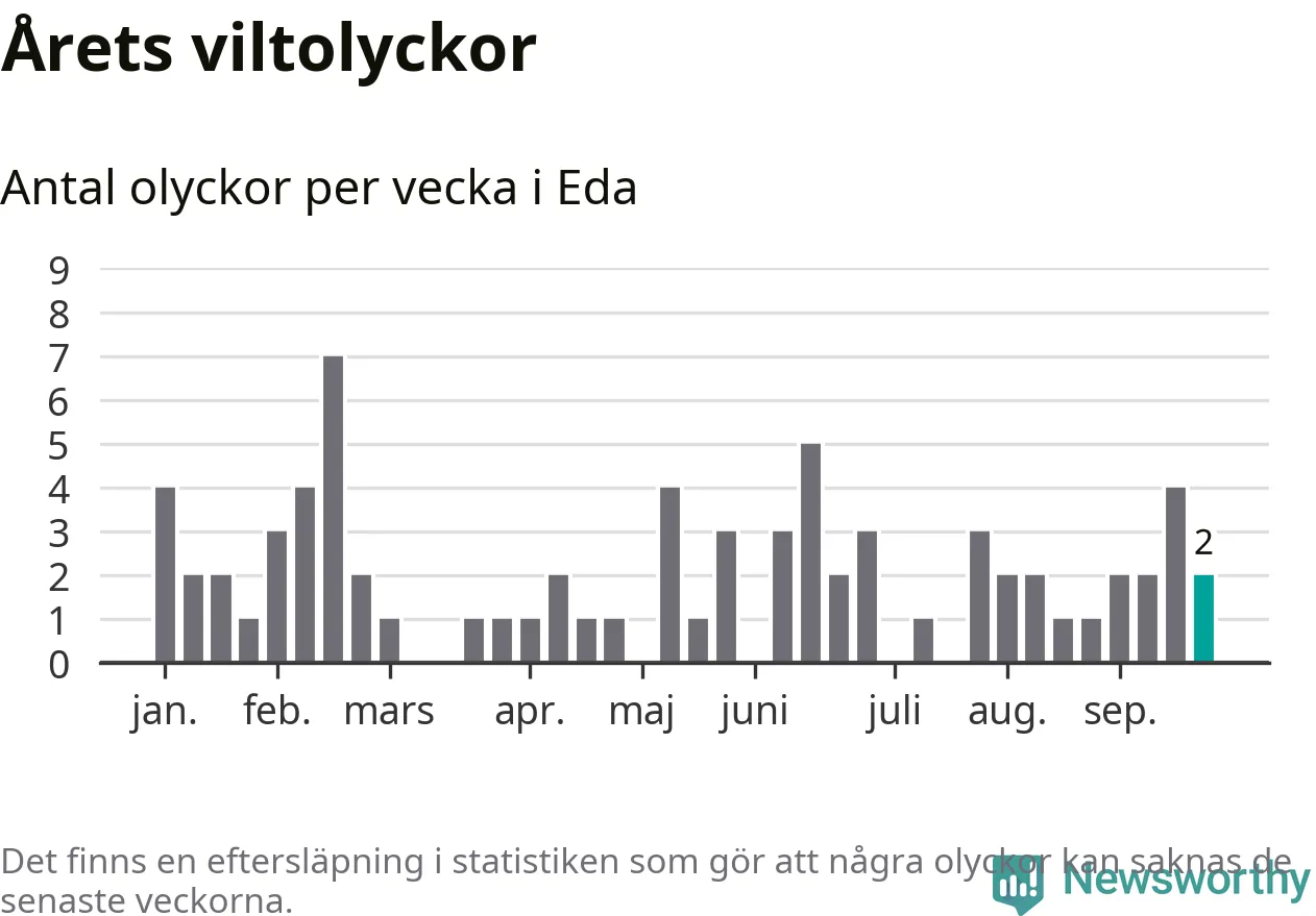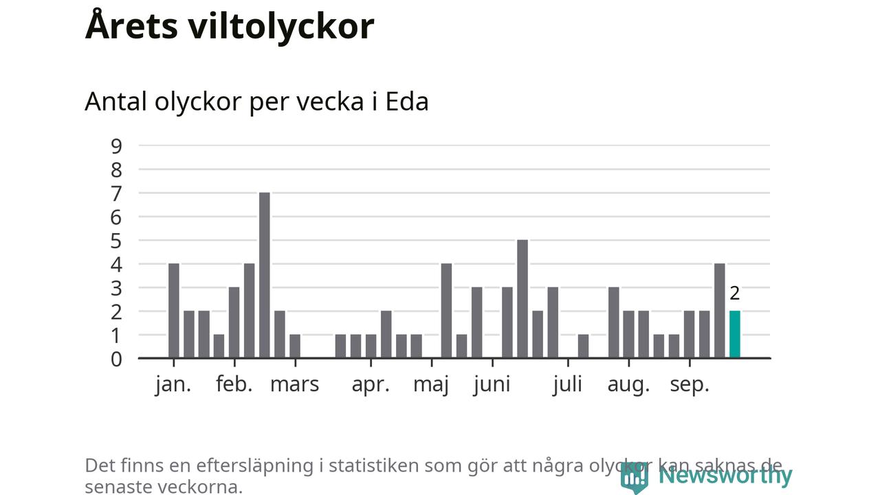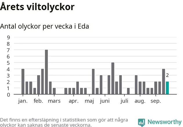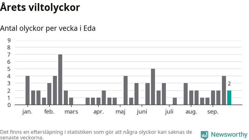 Hittills har två viltolyckor rapporterats in i Eda kommun från vecka 39. Se listan här.
