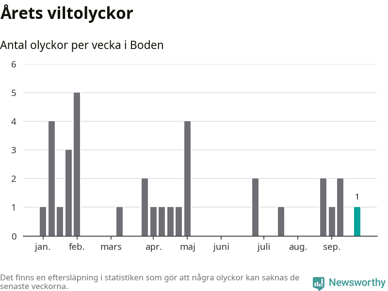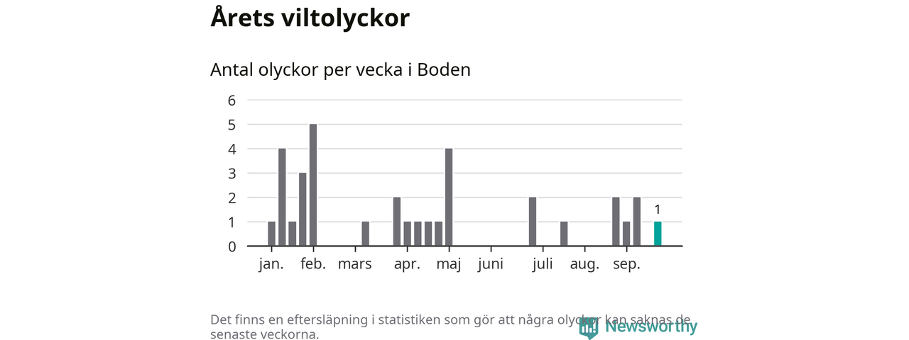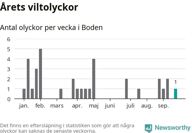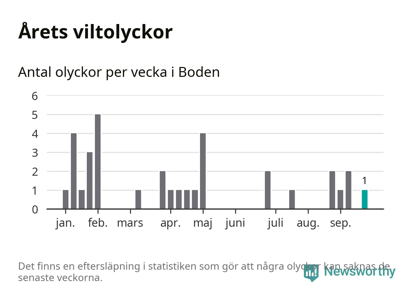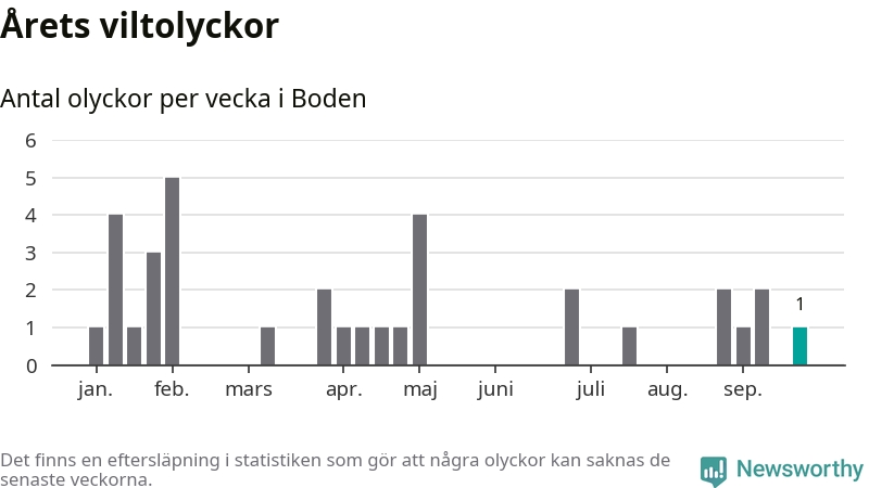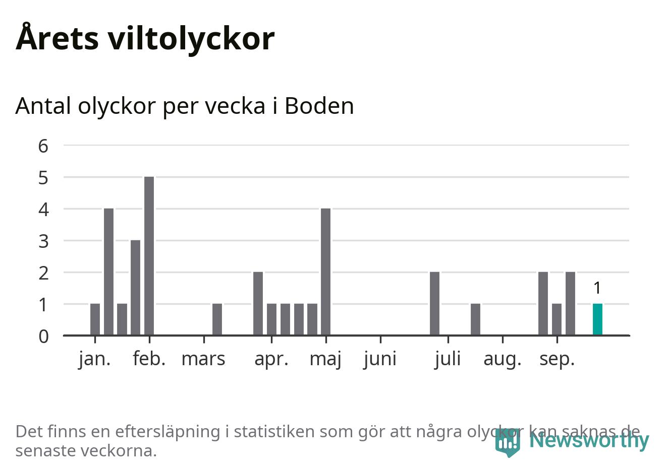 Från förra veckan (vecka 39) har hittills en viltolycka rapporterats in i Bodens kommun.