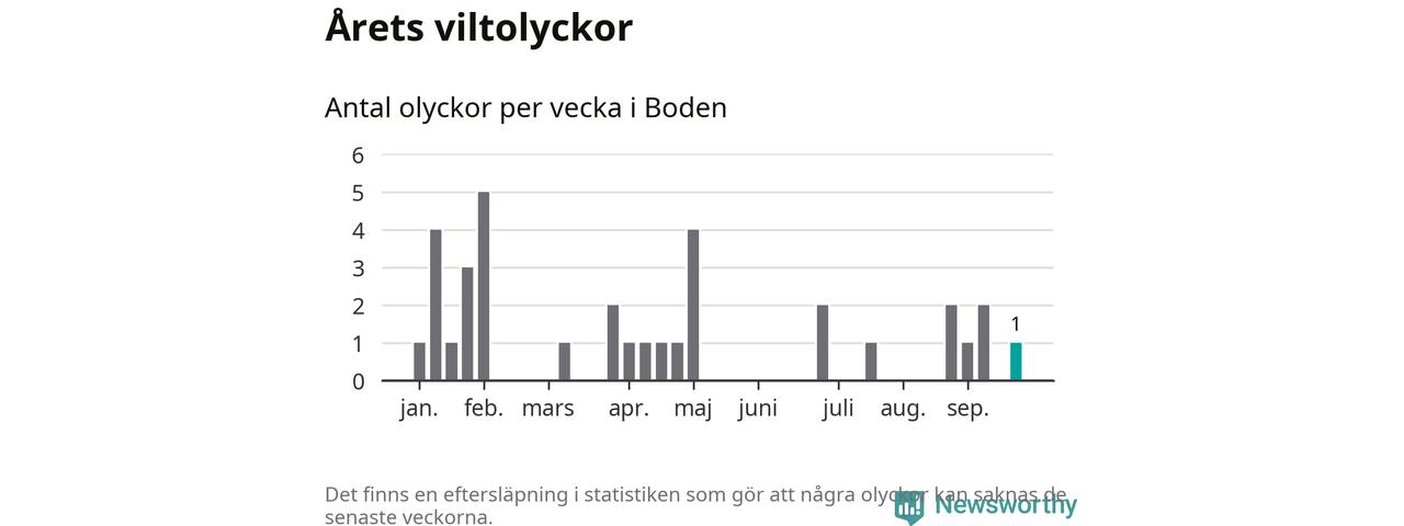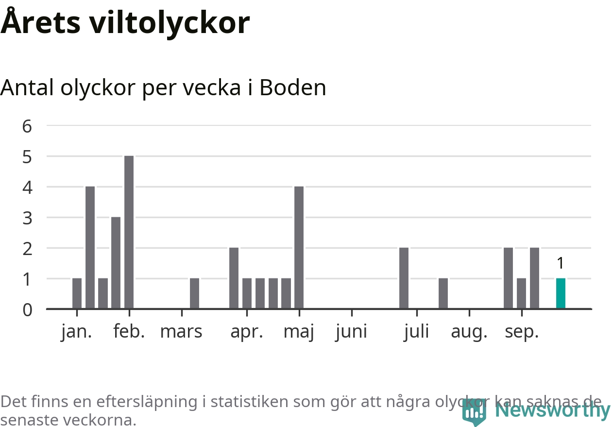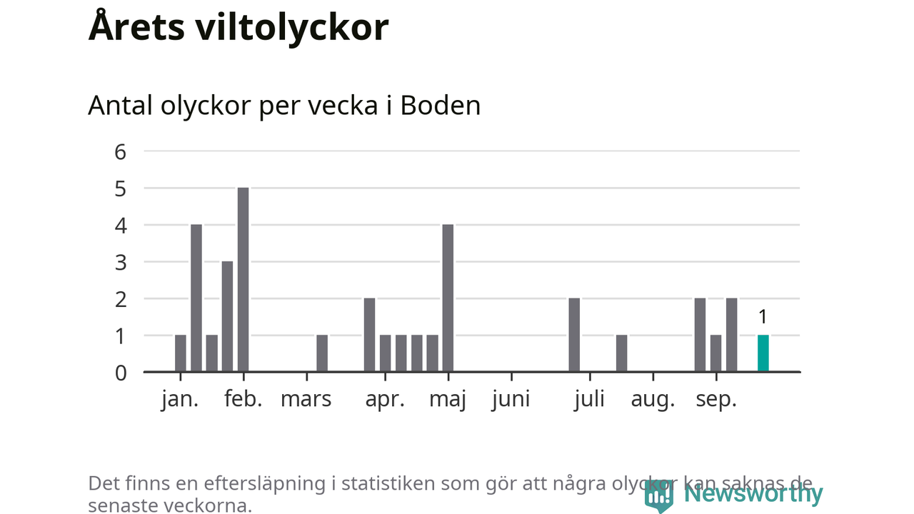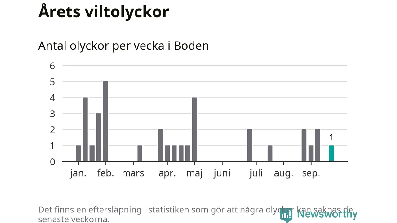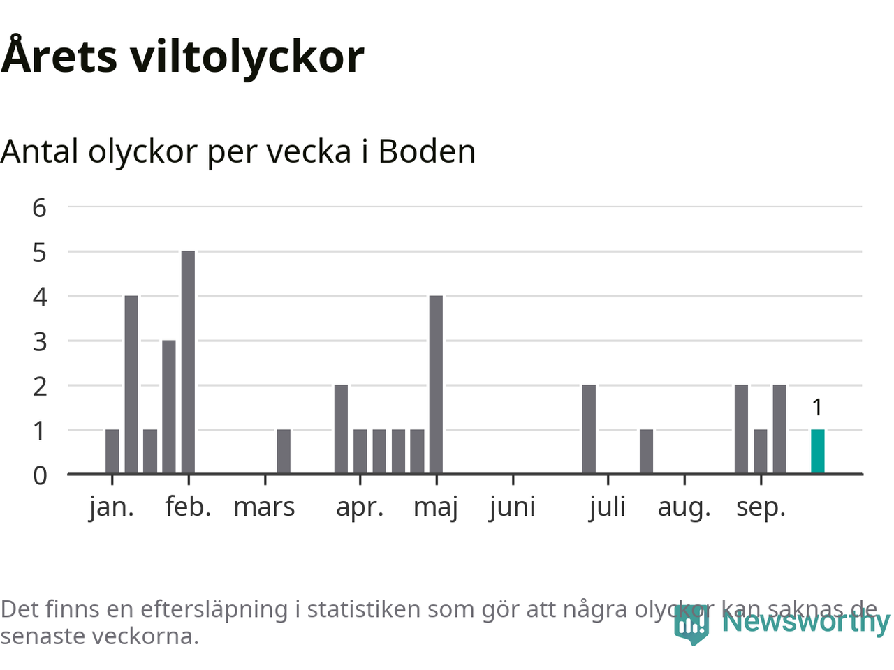 Från förra veckan (vecka 39) har hittills en viltolycka rapporterats in i Bodens kommun.