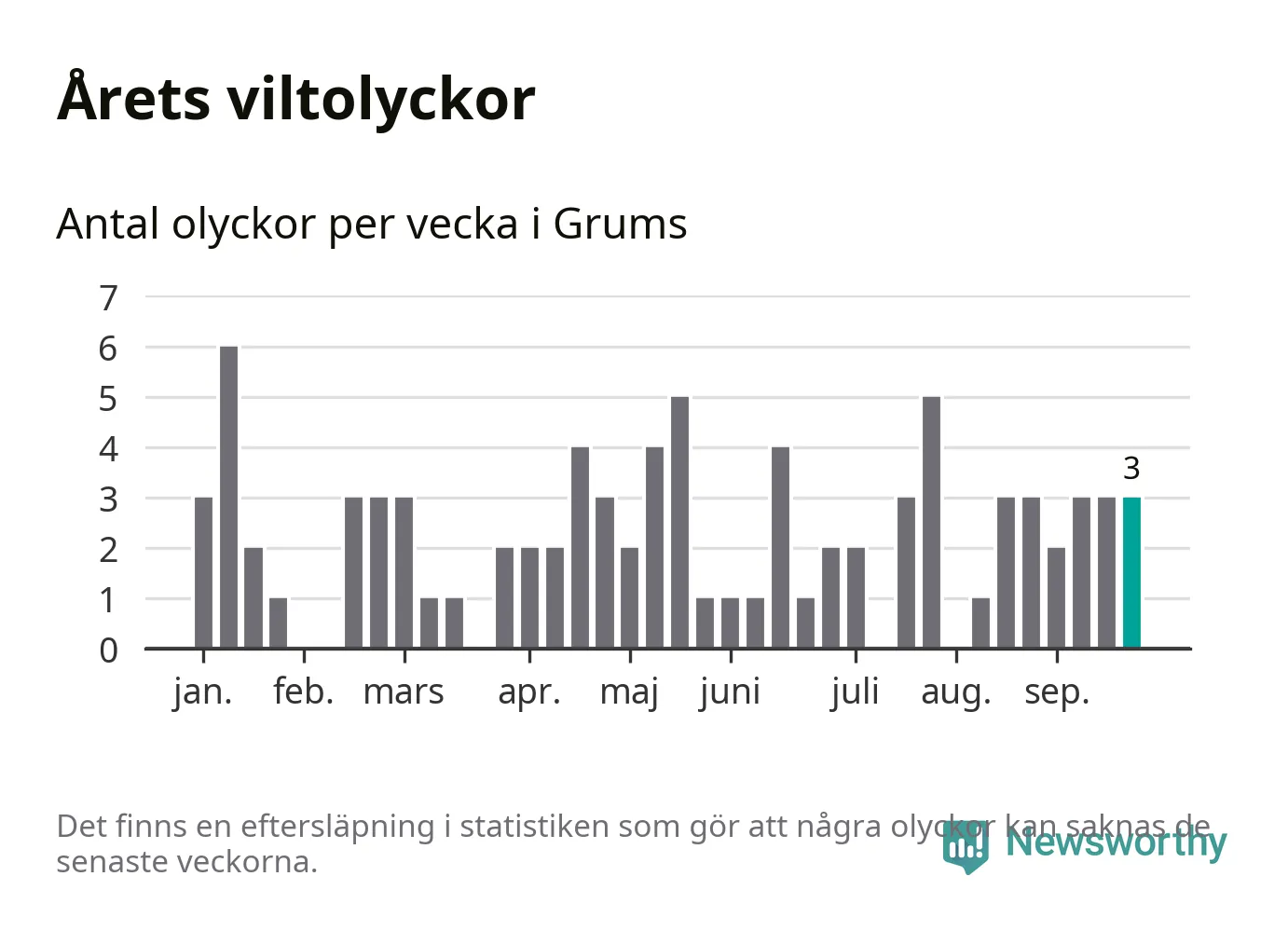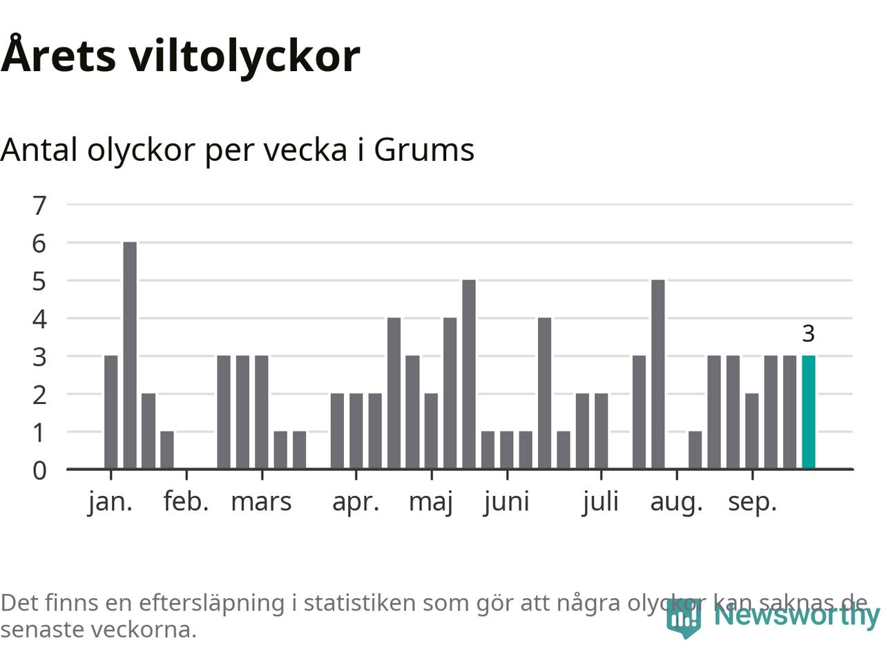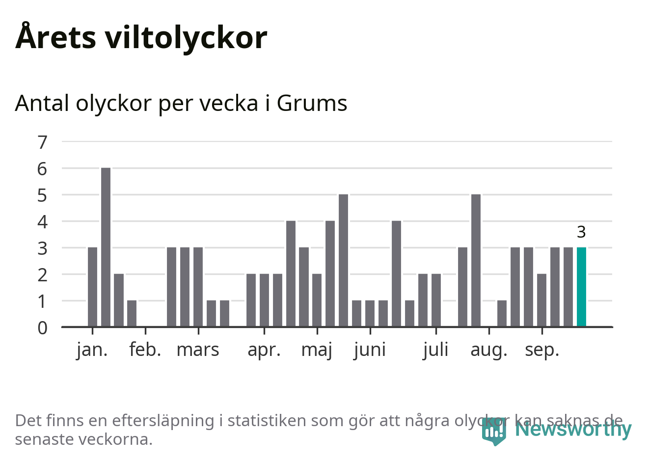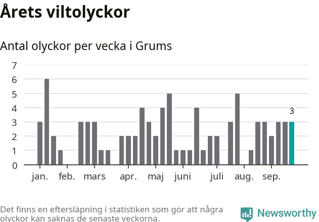Hittills har tre viltolyckor rapporterats in i Grums kommun från vecka 39. Se listan här.