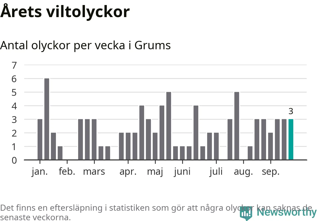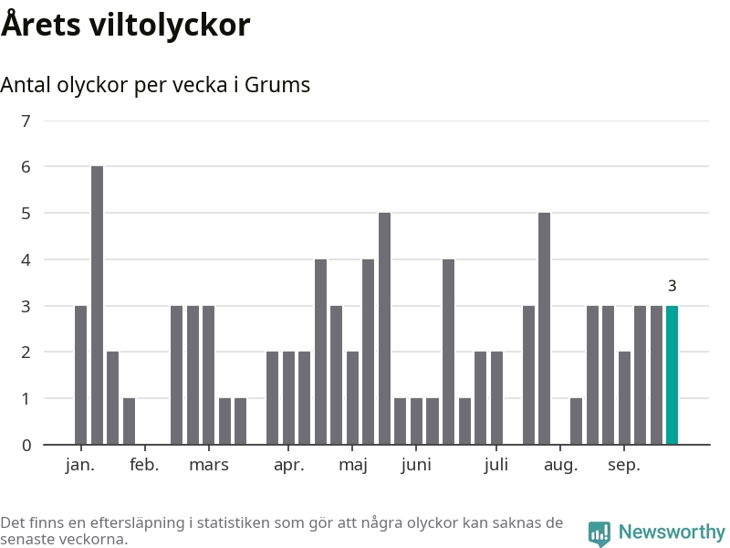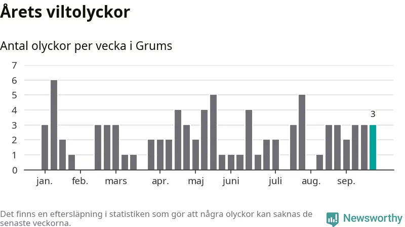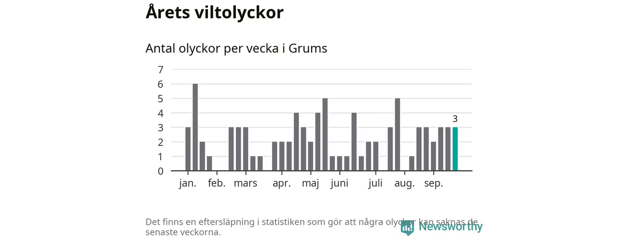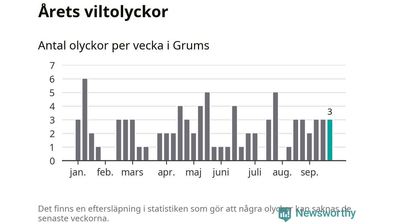 Hittills har tre viltolyckor rapporterats in i Grums kommun från vecka 39. Se listan här.