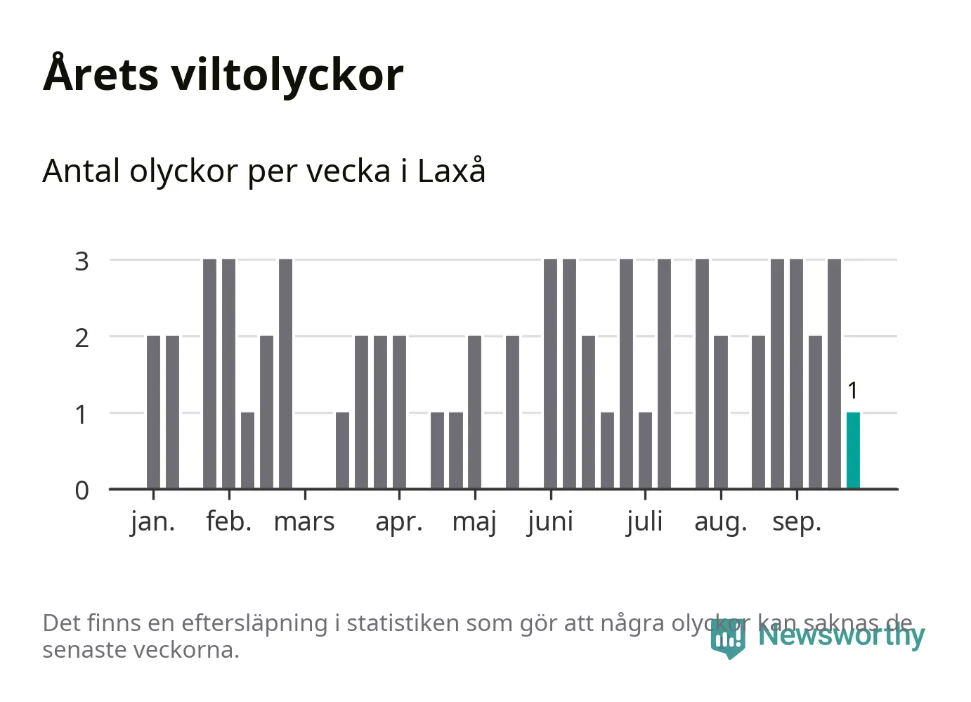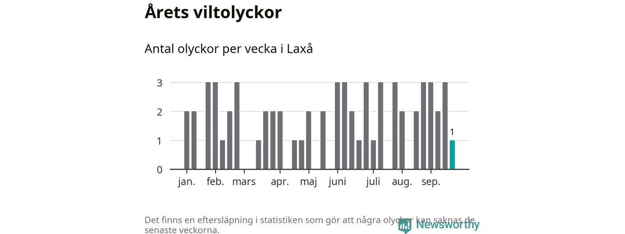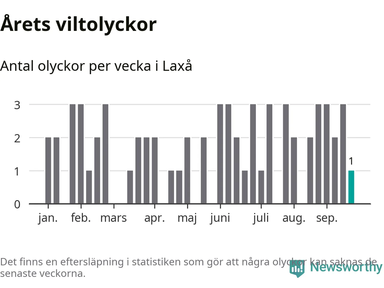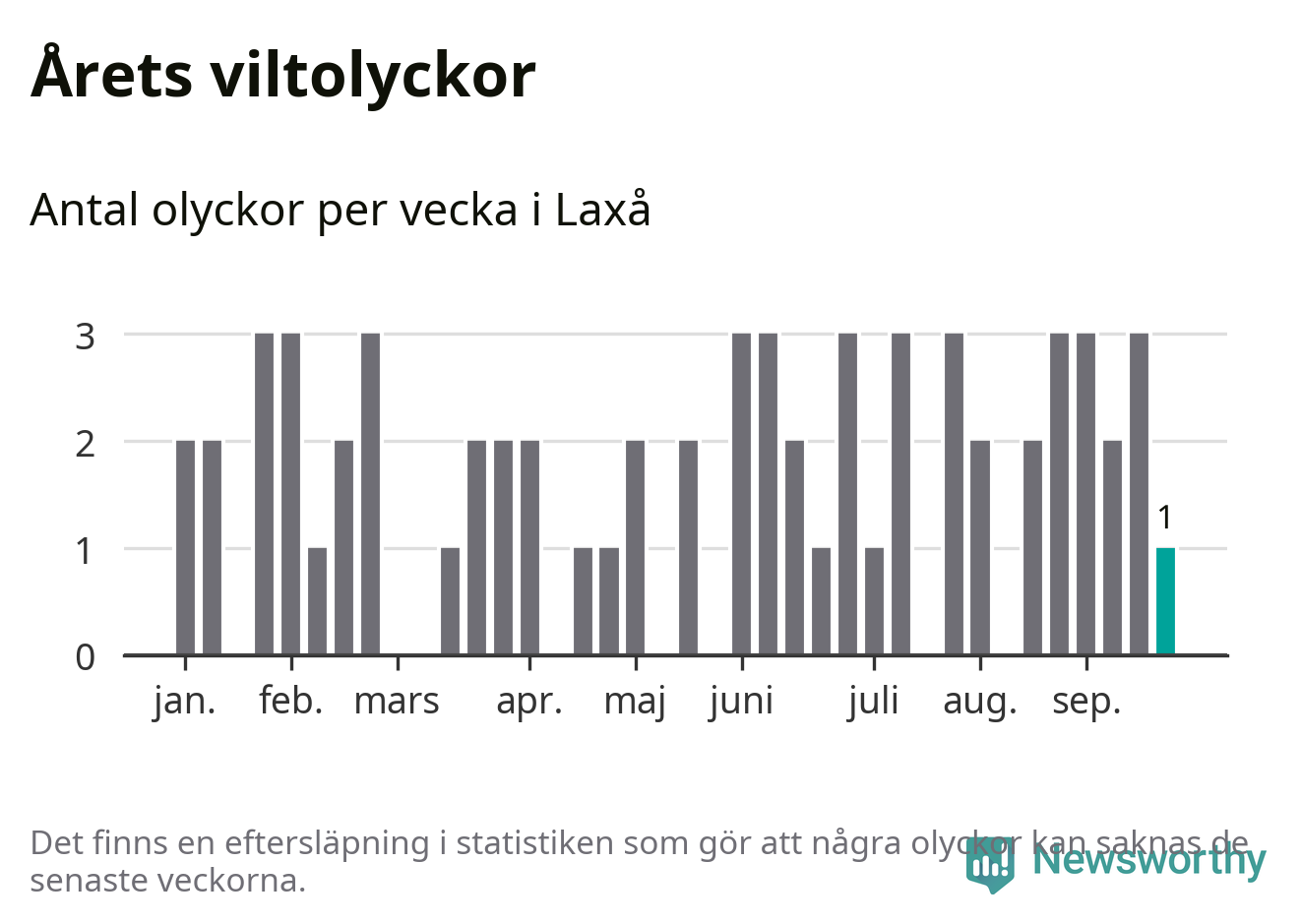 Från förra veckan (vecka 39) har hittills en viltolycka rapporterats in i Laxå kommun.