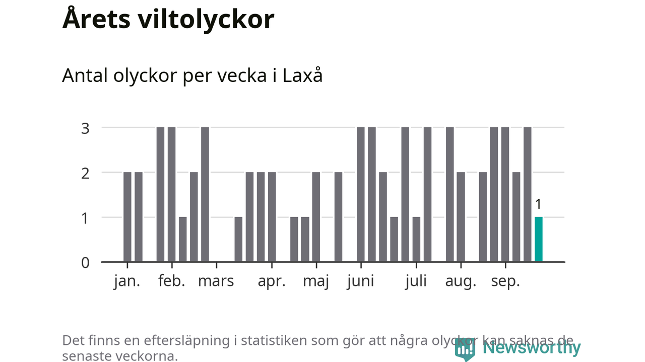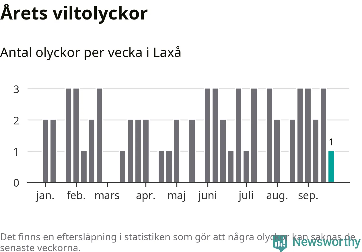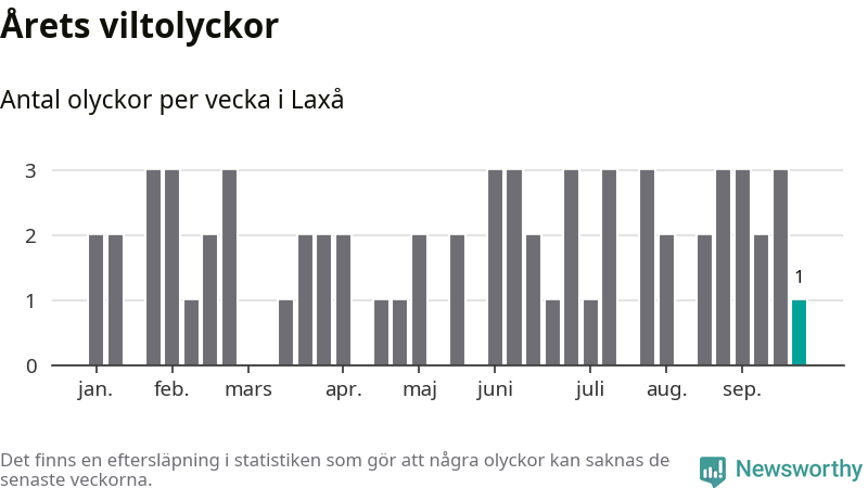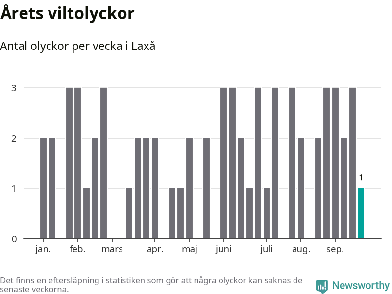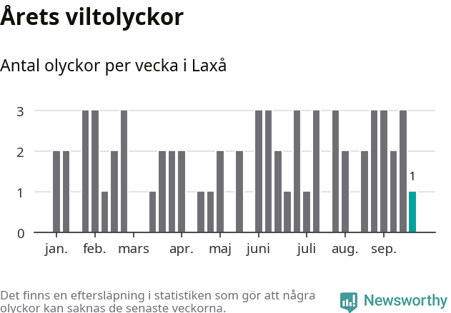 Från förra veckan (vecka 39) har hittills en viltolycka rapporterats in i Laxå kommun.