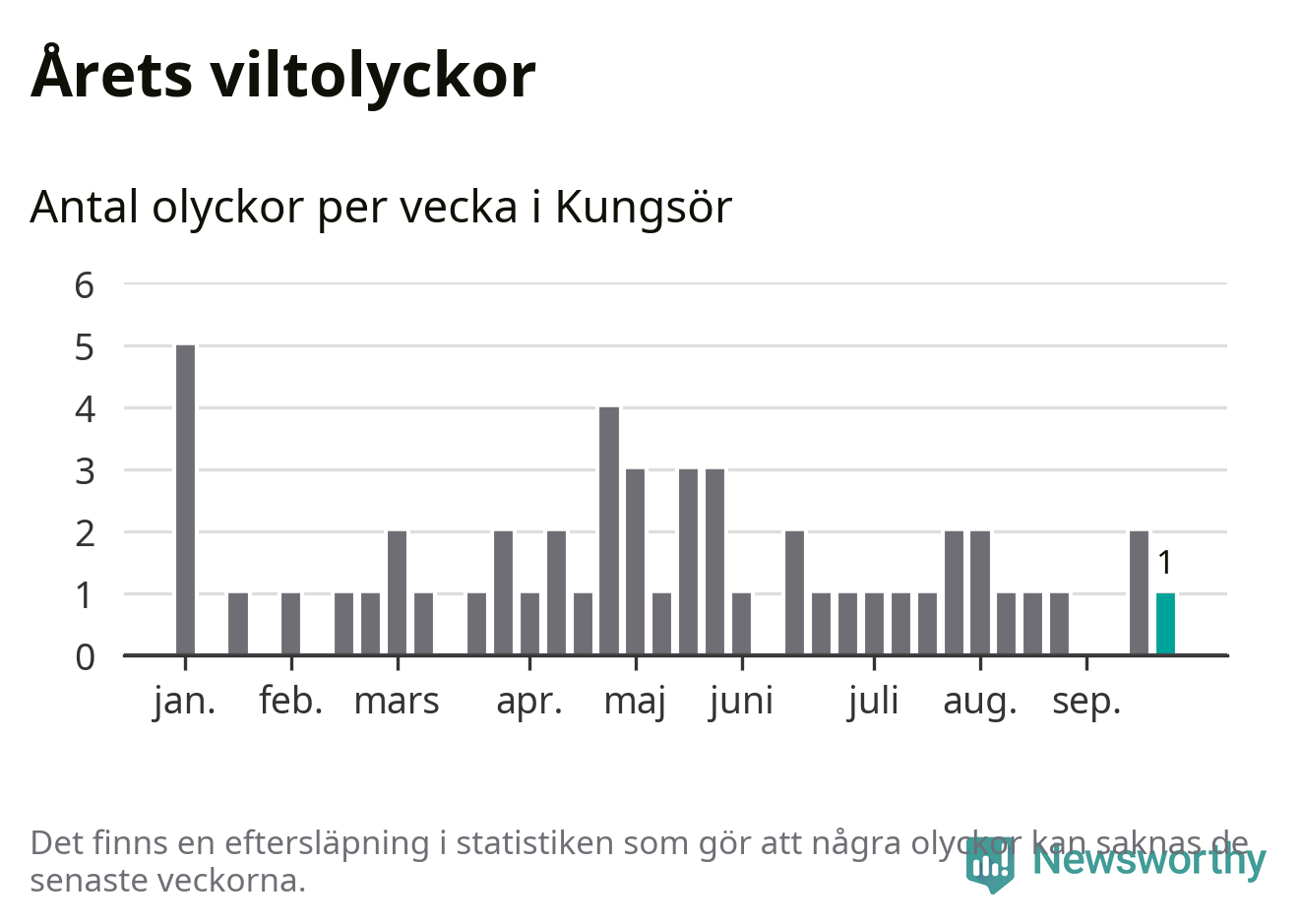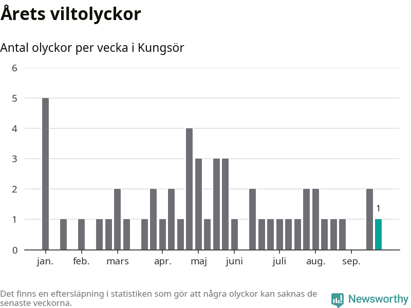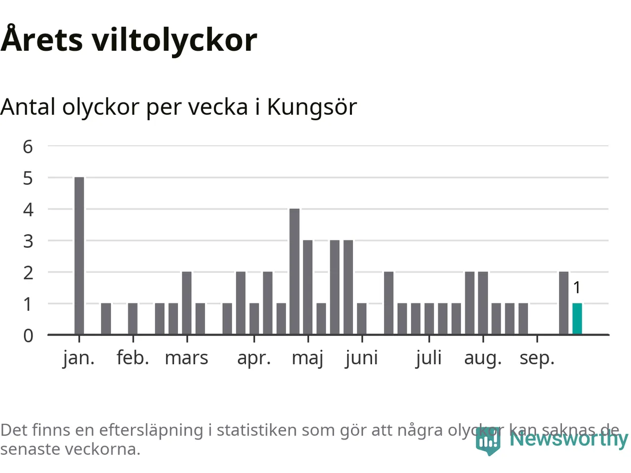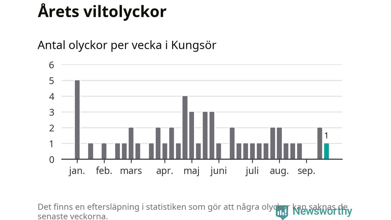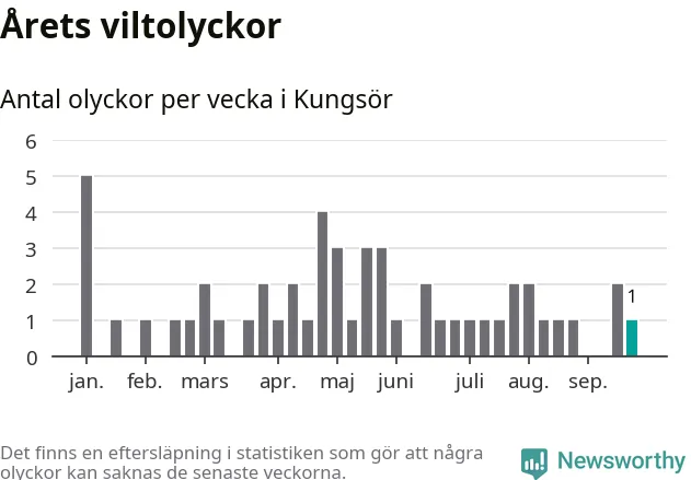 Från förra veckan (vecka 39) har hittills en viltolycka rapporterats in i Kungsörs kommun.