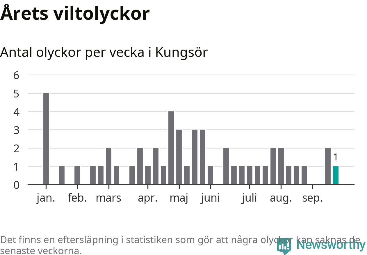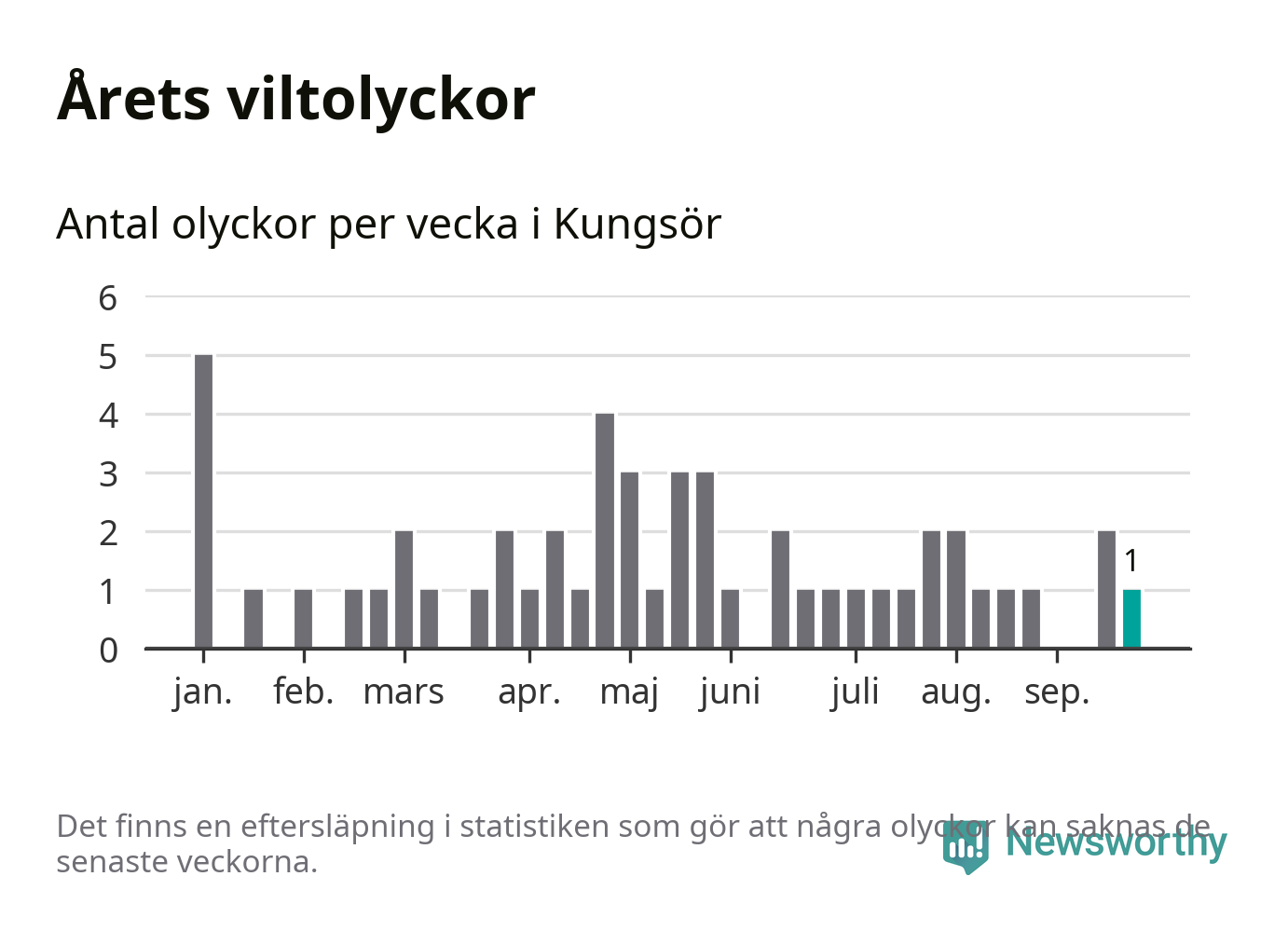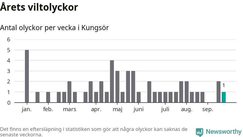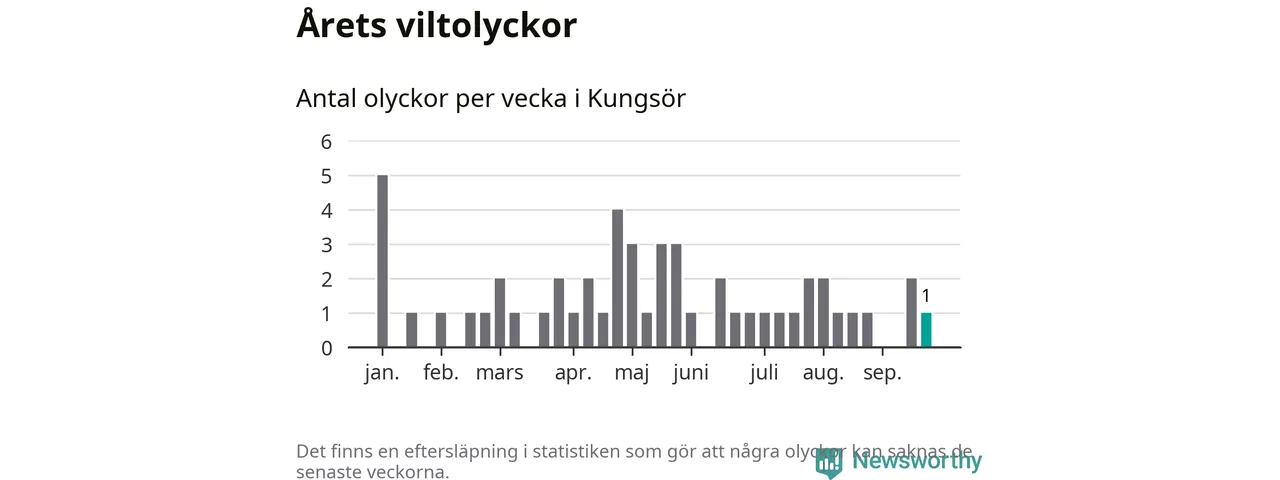 Från förra veckan (vecka 39) har hittills en viltolycka rapporterats in i Kungsörs kommun.