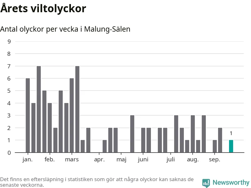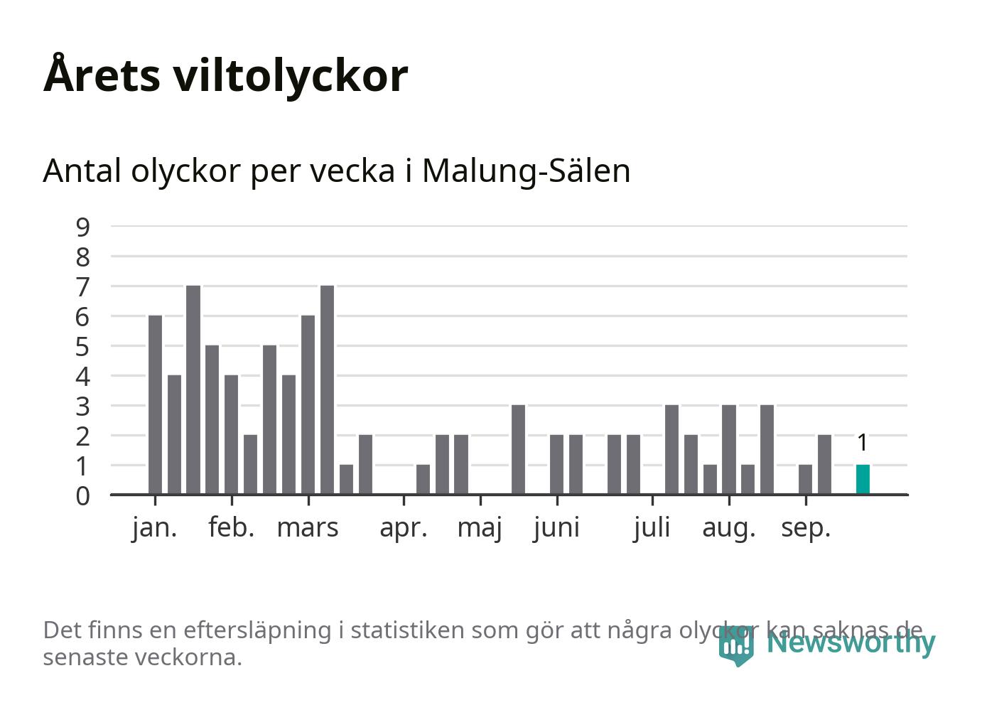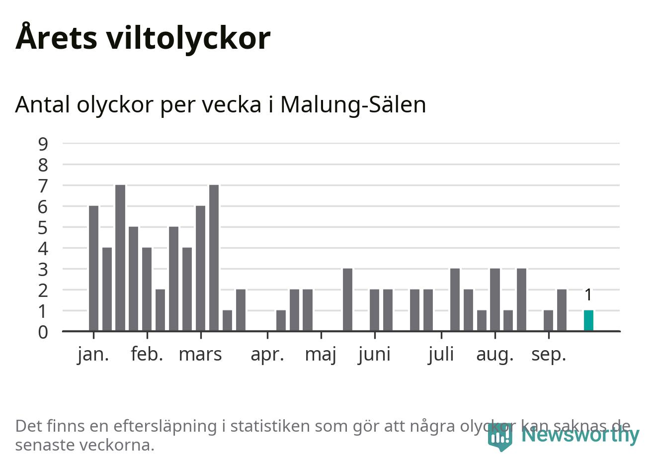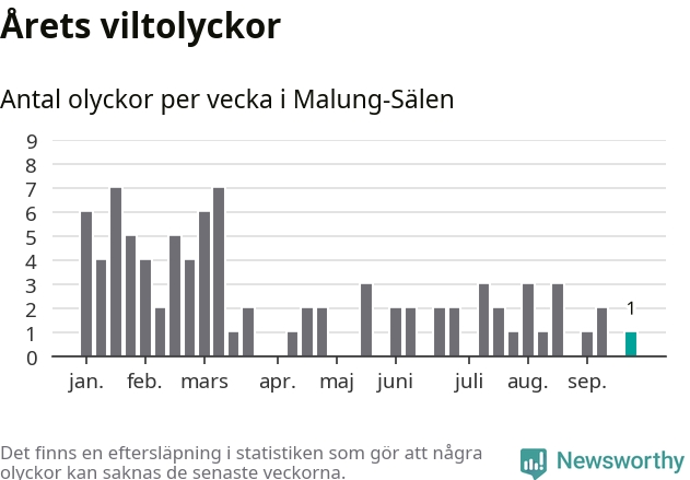 Från förra veckan (vecka 39) har hittills en viltolycka rapporterats in i Malung-Sälens kommun.