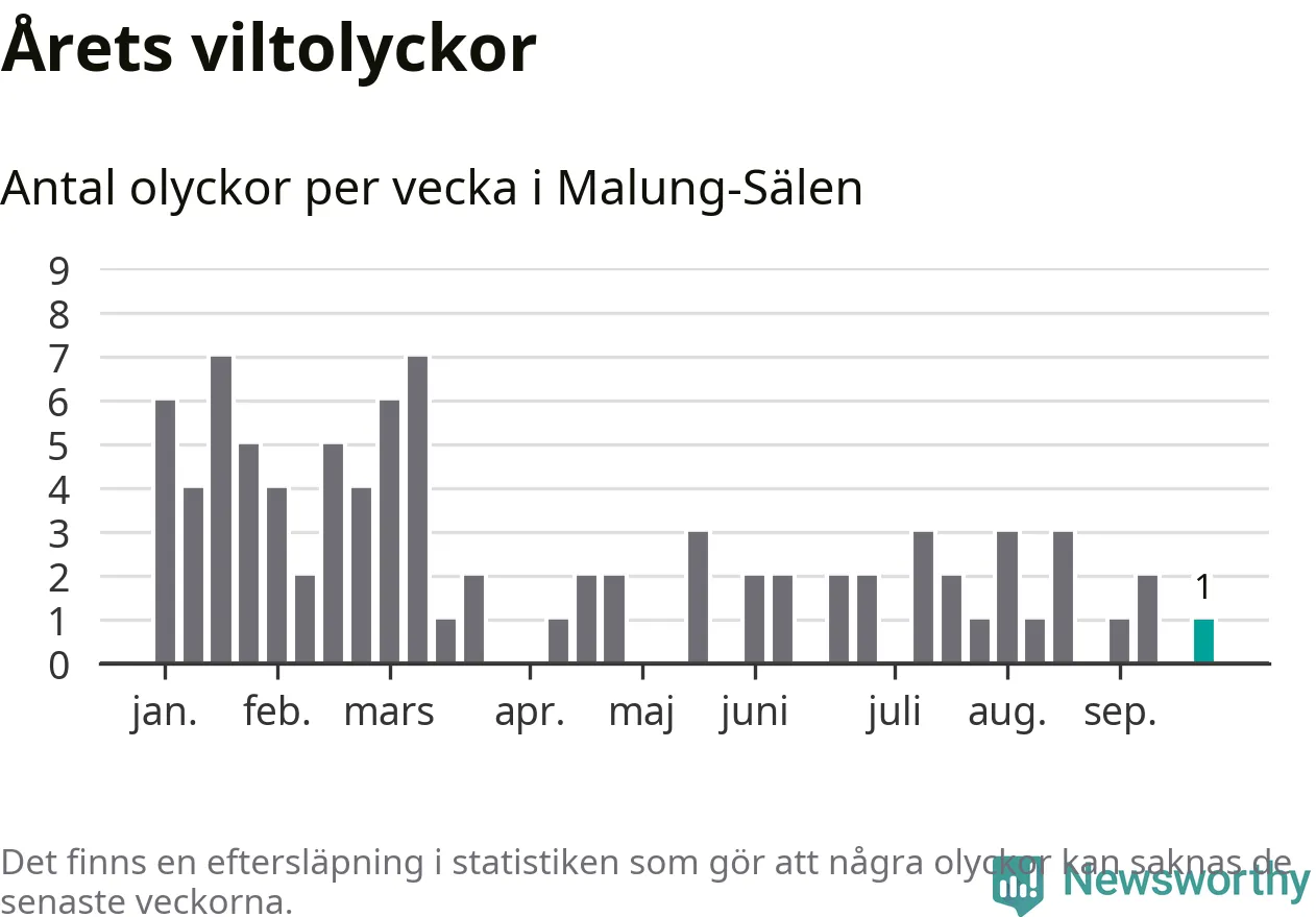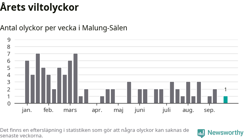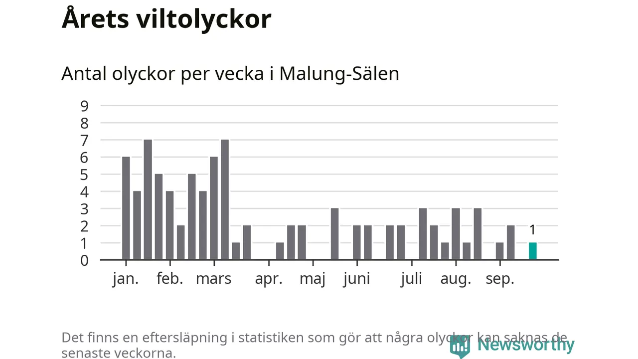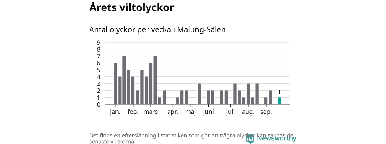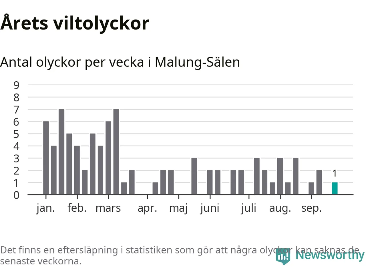 Från förra veckan (vecka 39) har hittills en viltolycka rapporterats in i Malung-Sälens kommun.
