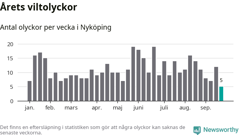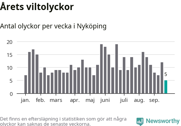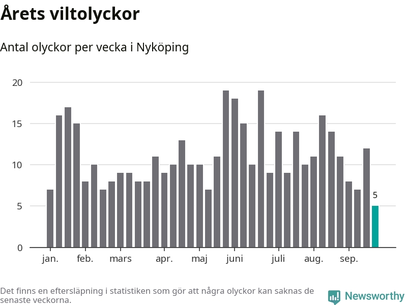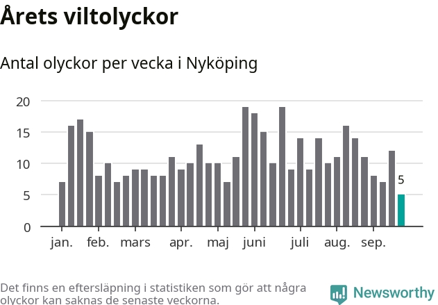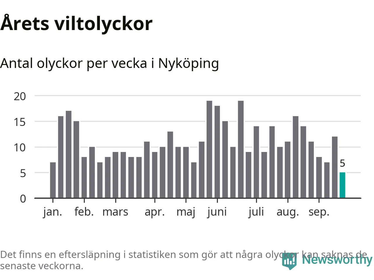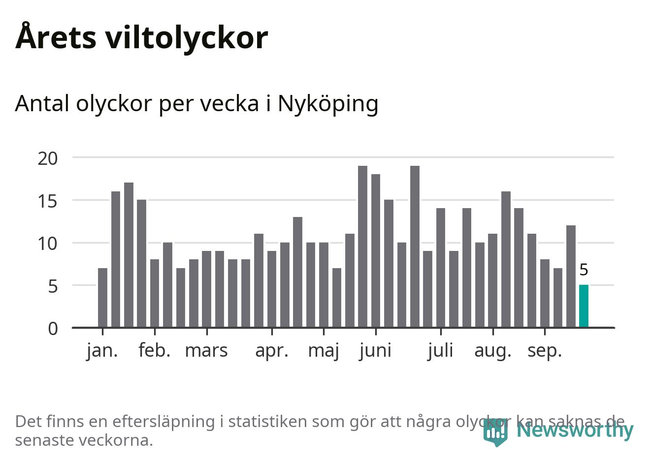 Hittills har fem viltolyckor rapporterats in i Nyköpings kommun från vecka 39. Se listan här.