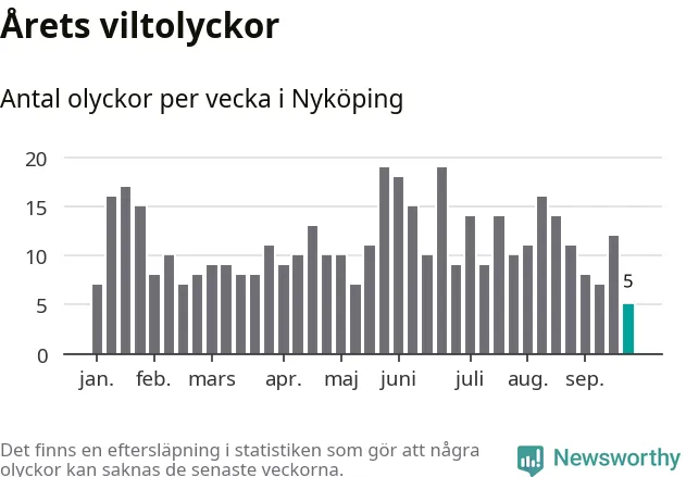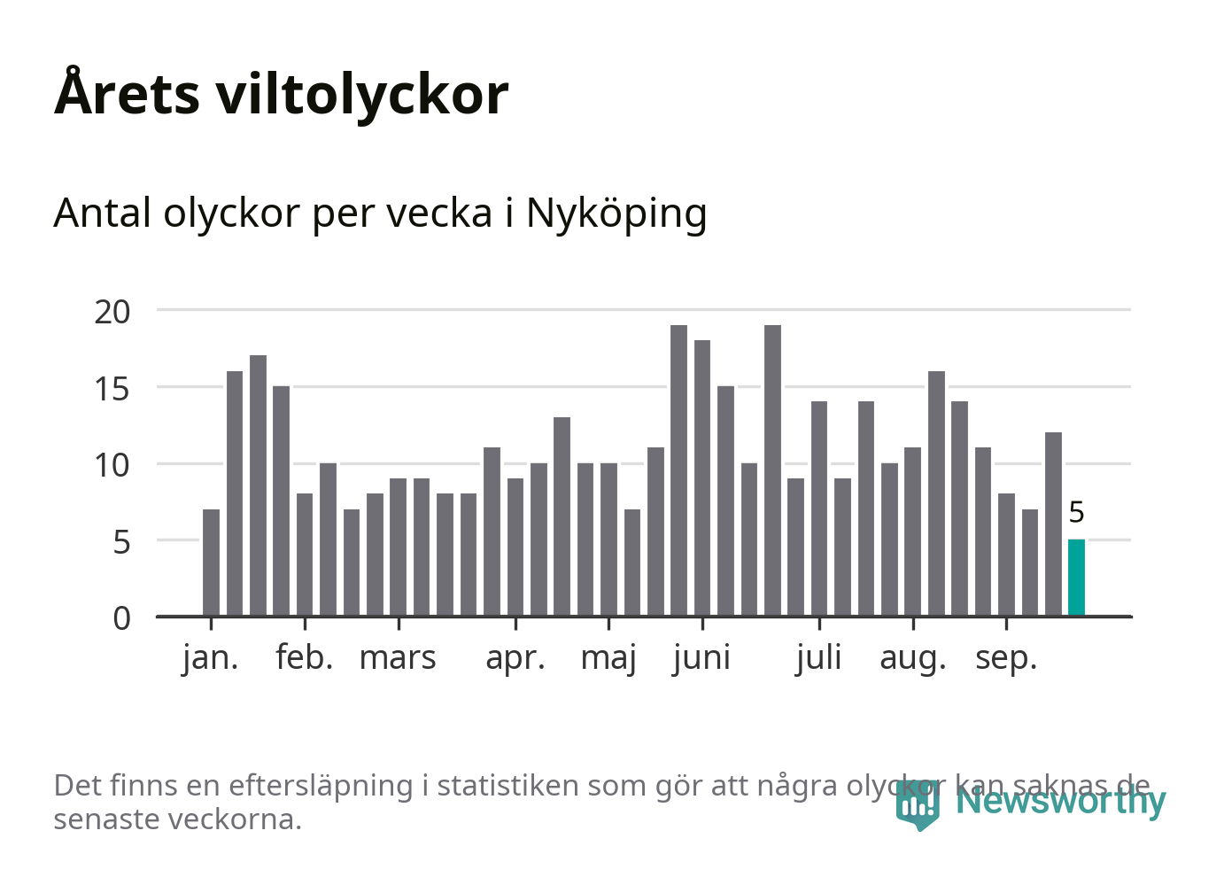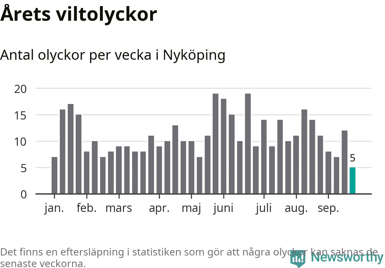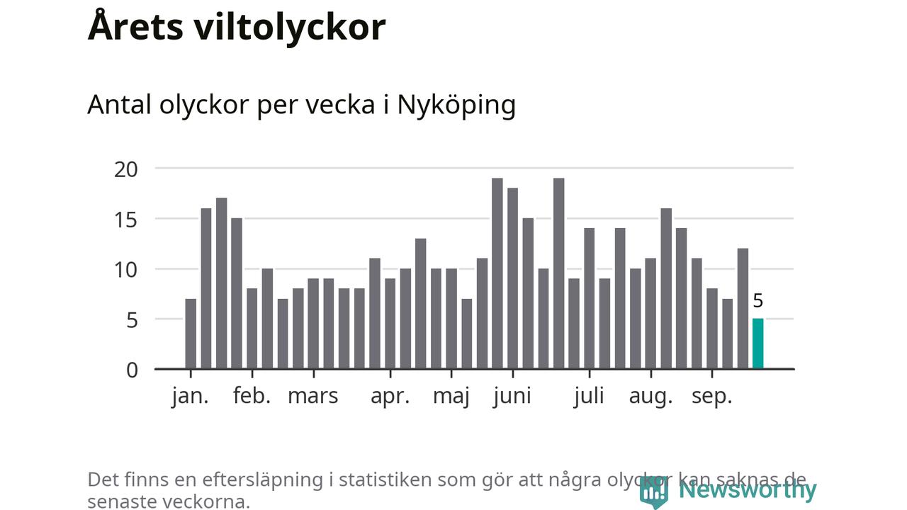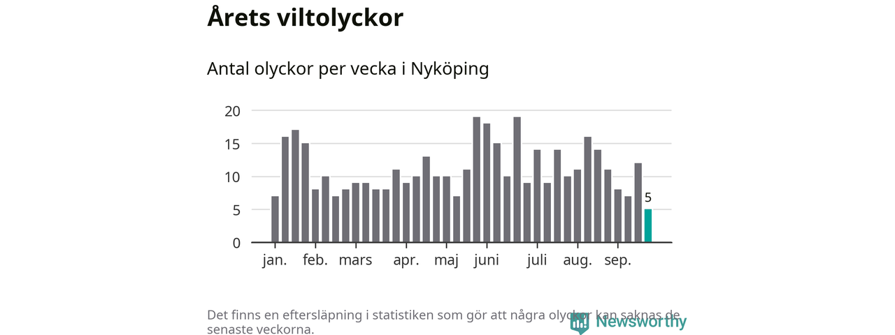 Hittills har fem viltolyckor rapporterats in i Nyköpings kommun från vecka 39. Se listan här.