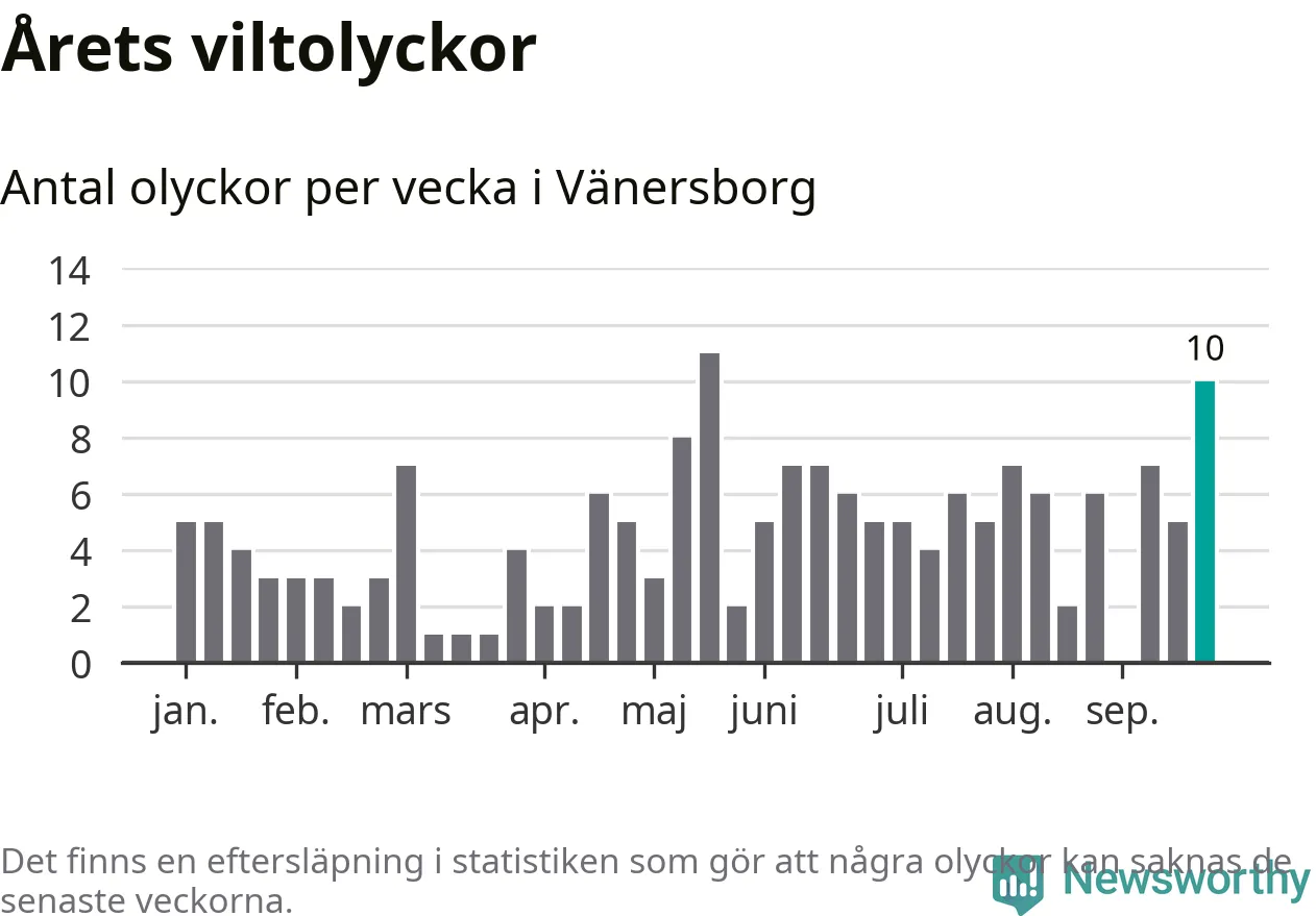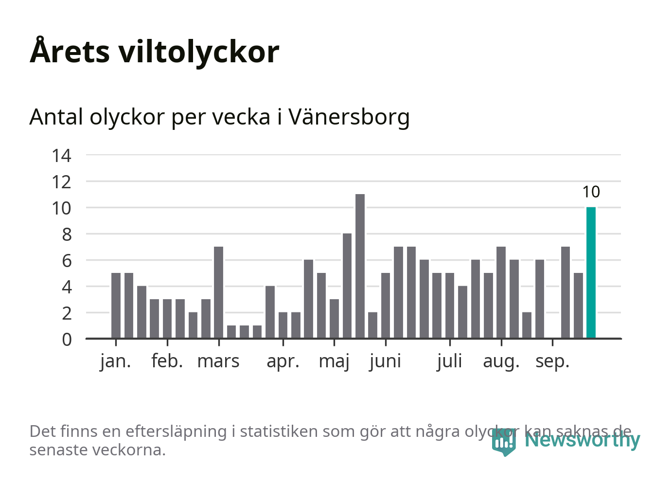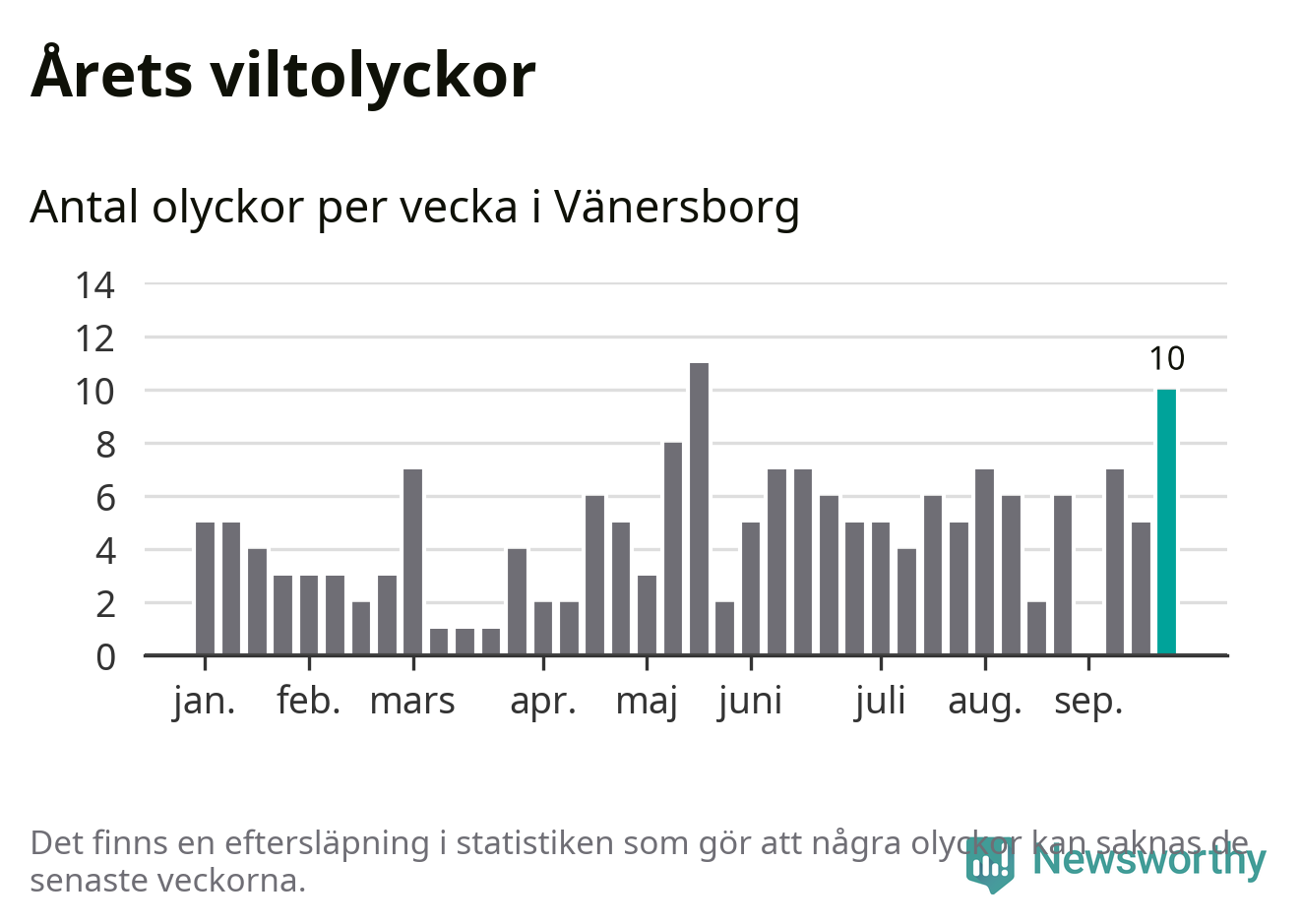 Tio olyckor på en enda vecka är däremot ovanligt många. Bara sju gånger tidigare sedan 2015 har det skett så många viltolyckor på en vecka i Vänersborgs kommun.