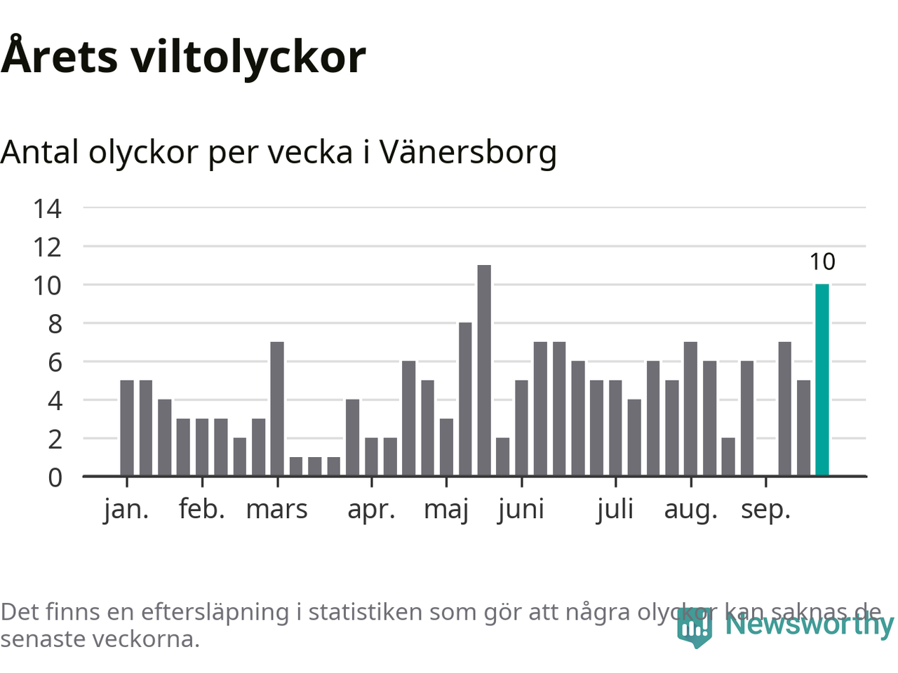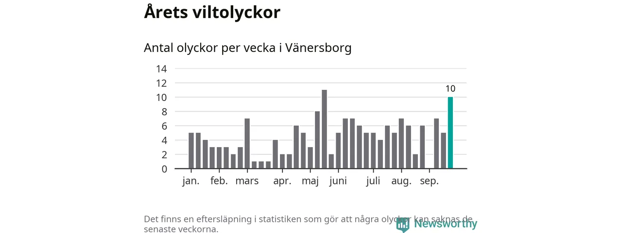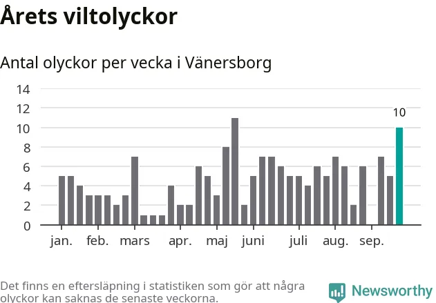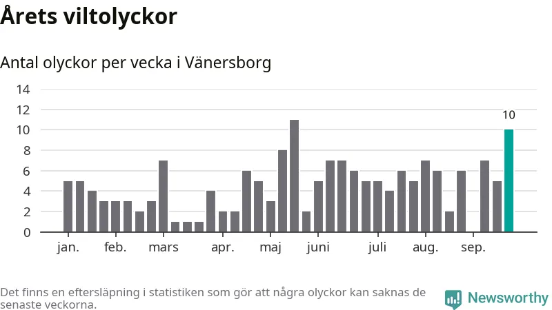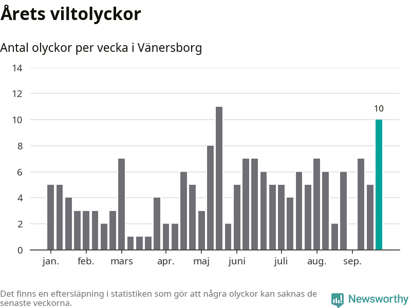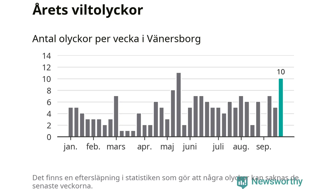 Tio olyckor på en enda vecka är däremot ovanligt många. Bara sju gånger tidigare sedan 2015 har det skett så många viltolyckor på en vecka i Vänersborgs kommun.