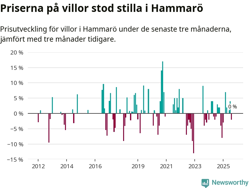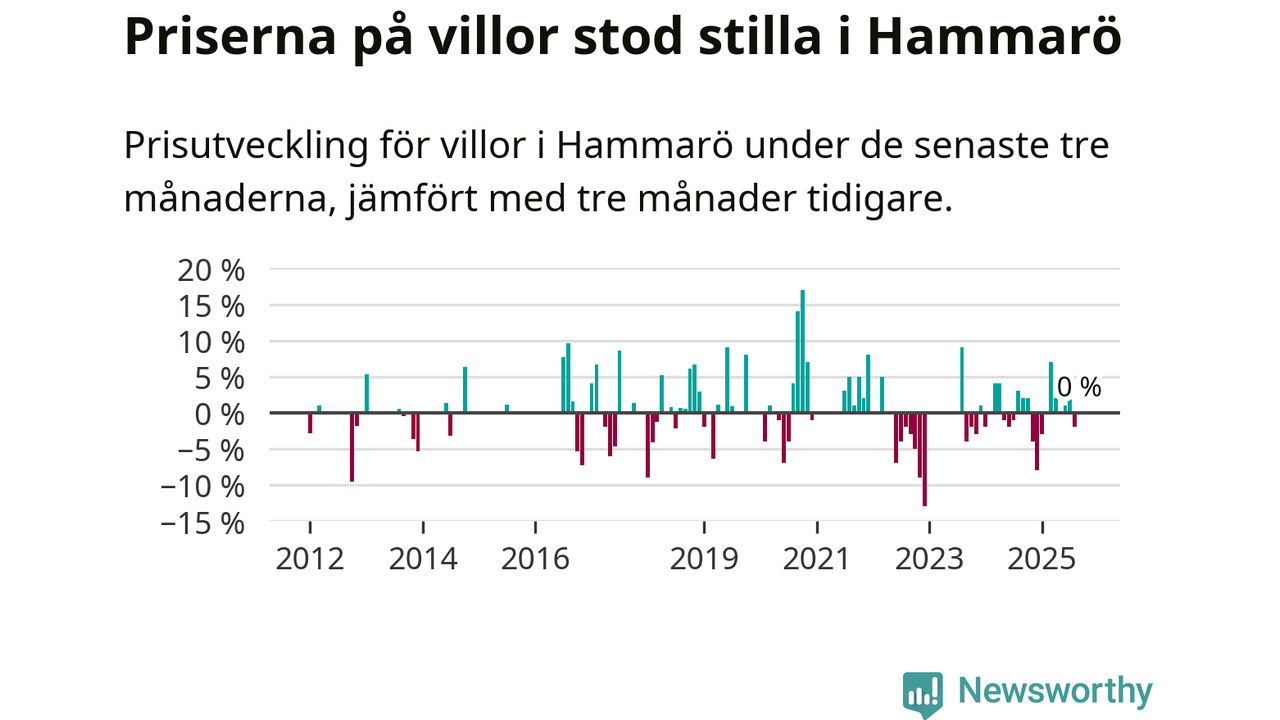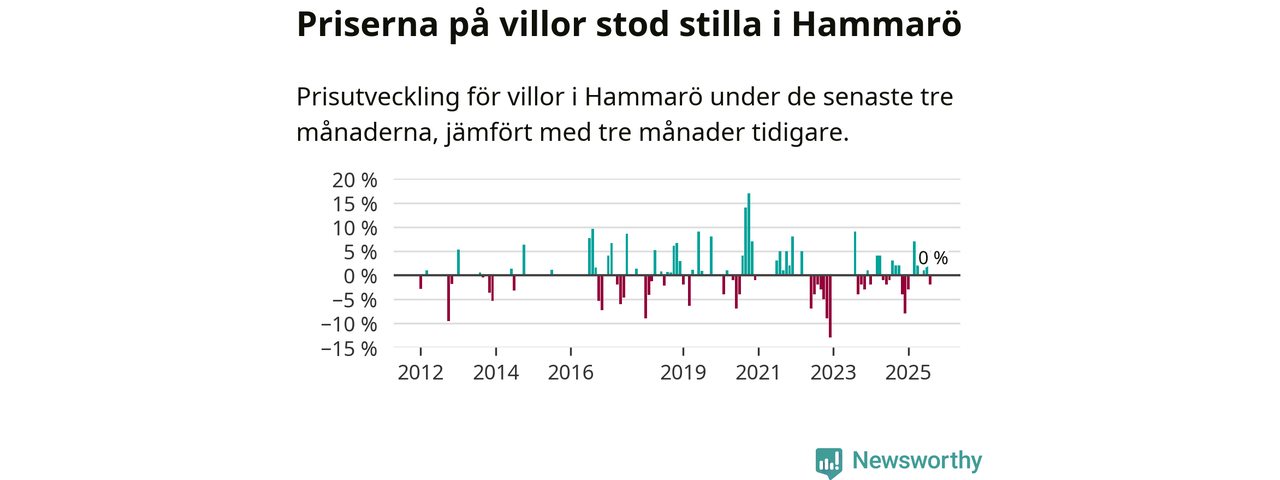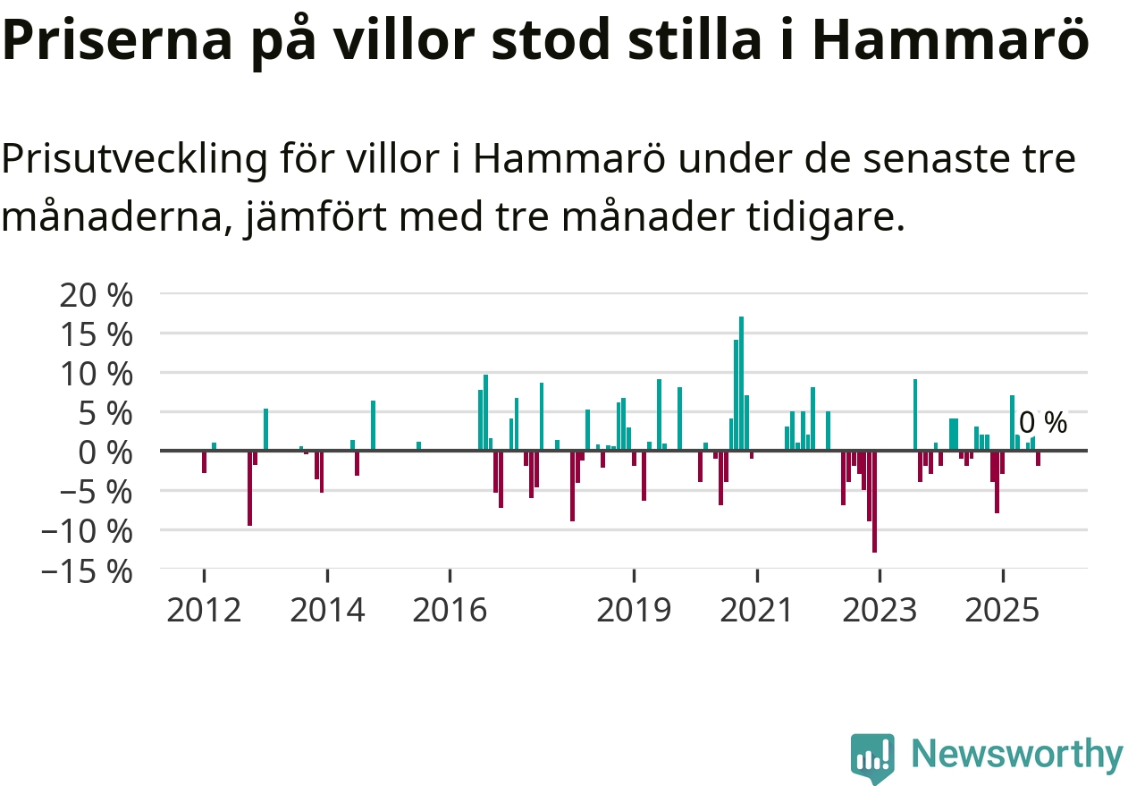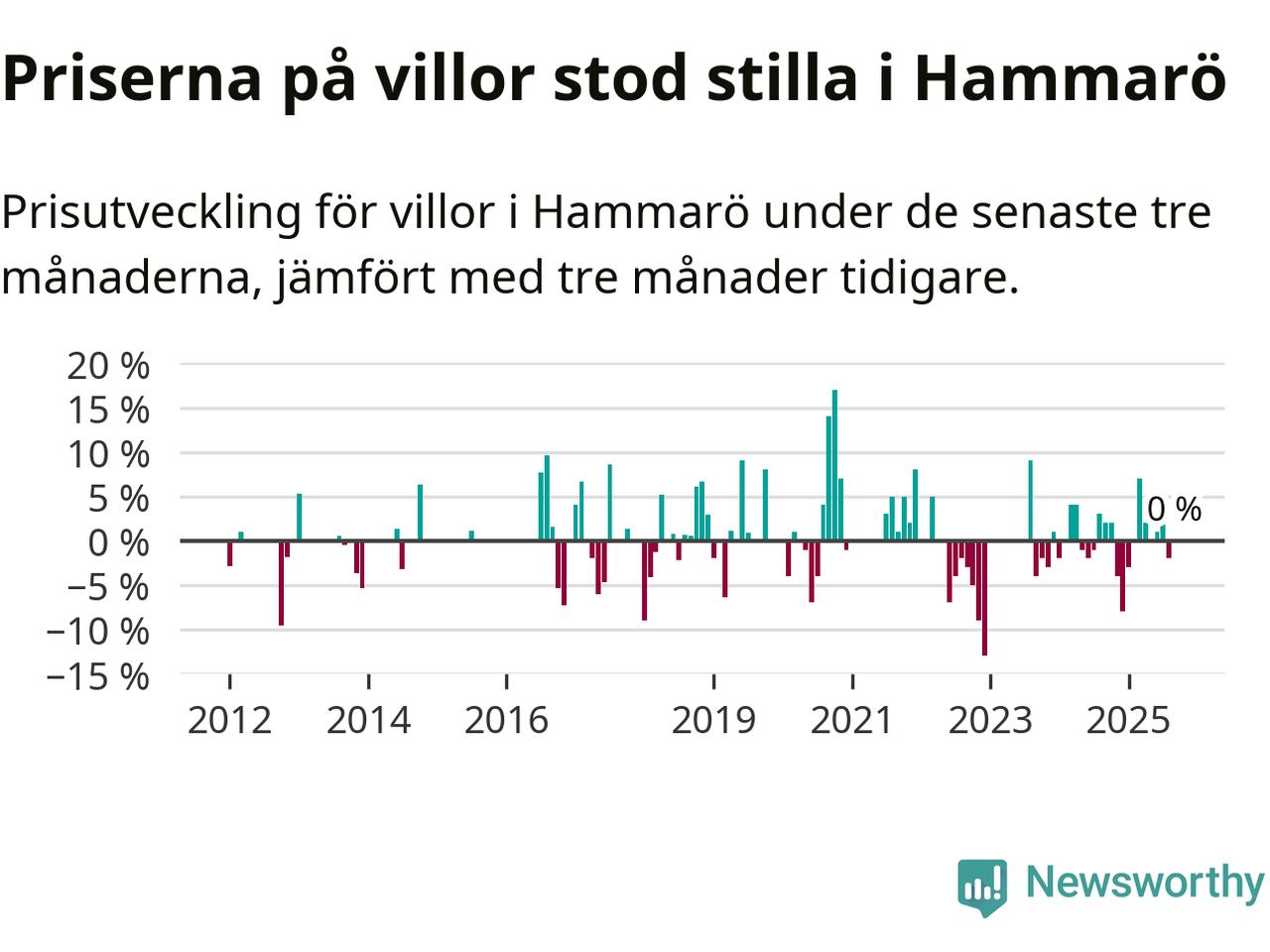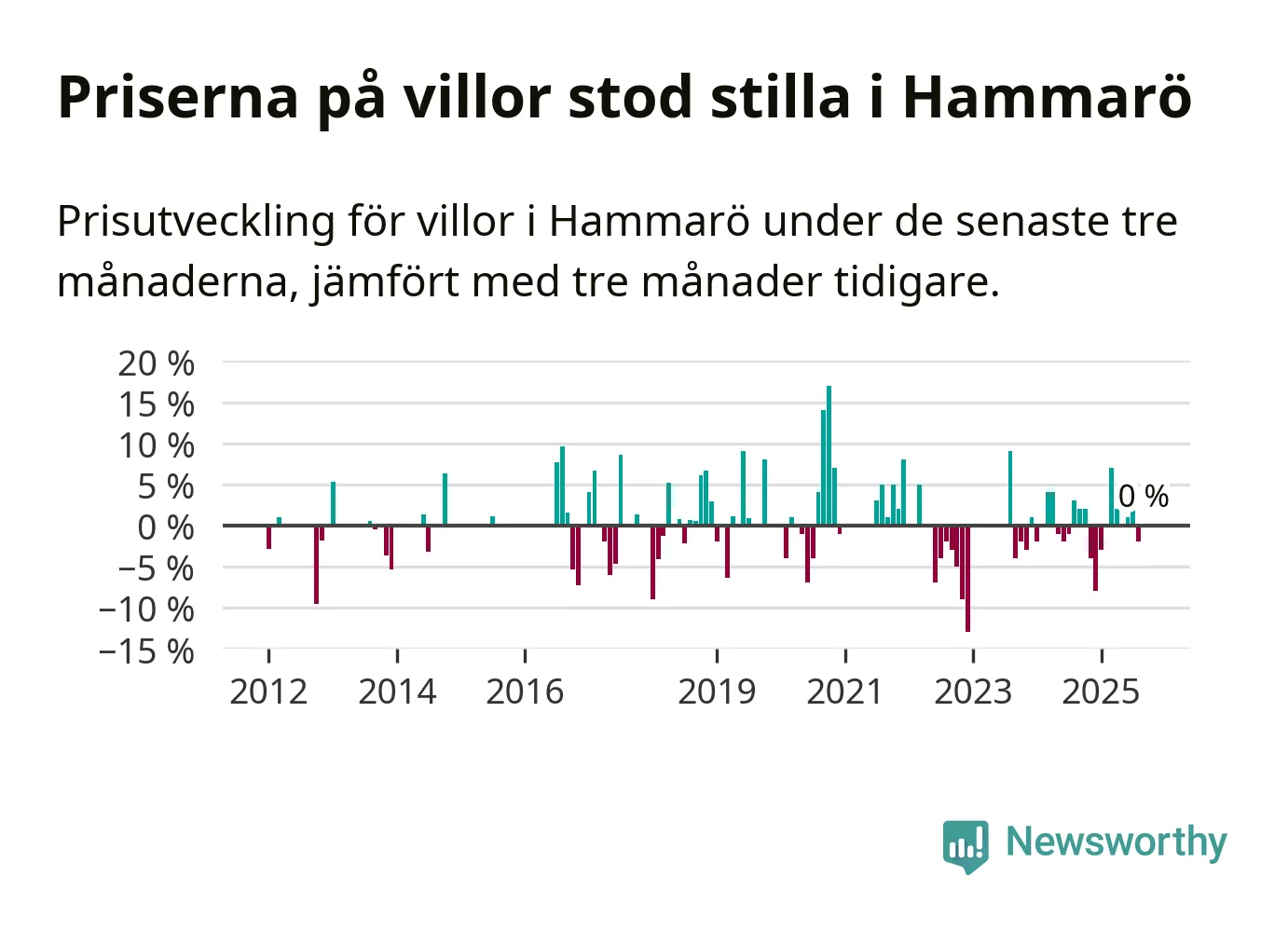 Medelpriset på försäljningarna i Hammarö kommun låg på i stort sett samma nivå som för tre månader sedan. I hela Värmland däremot sjunker villapriserna. I hela länet noterades en prisnedgång på 1 procent.