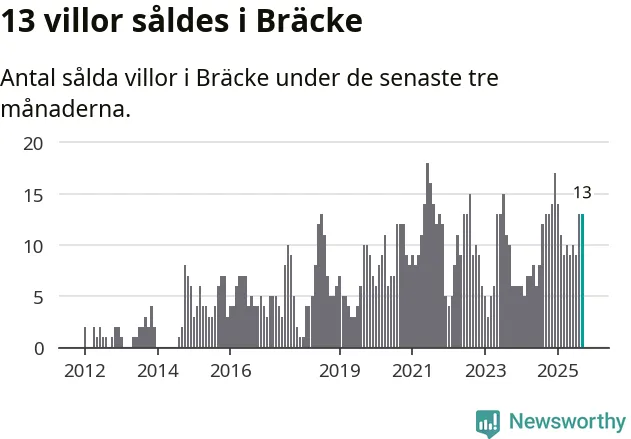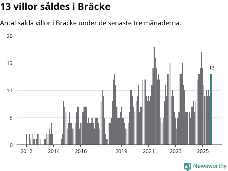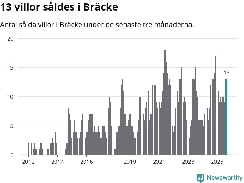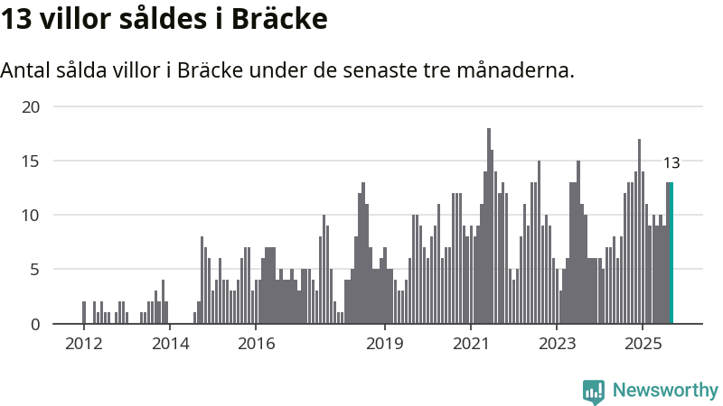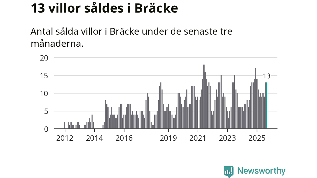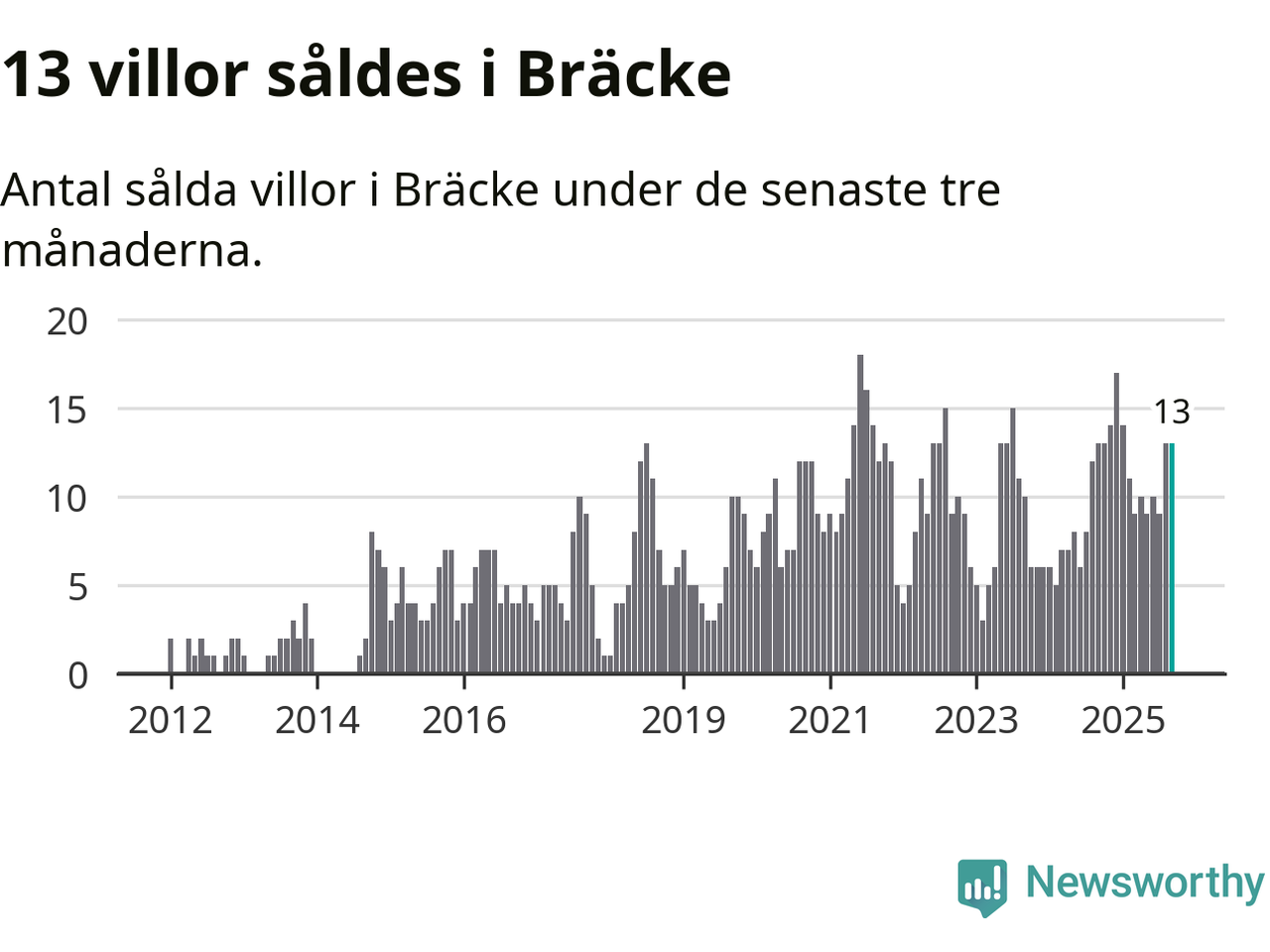 Mellan juli och september gjordes sammanlagt 13 affärer med villor i Bräcke kommun. Det är lika många affärer som vid motsvarande tid i fjol.