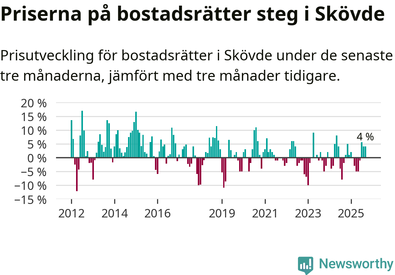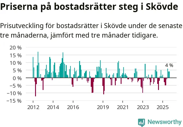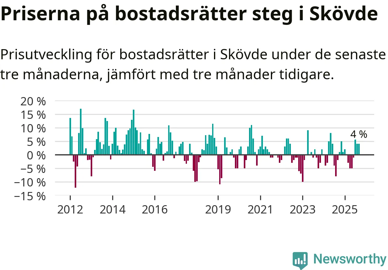 Priserna på bostadsrätter har gått upp i Skövde kommun. Medelpriset på försäljningarna under de senaste tre månaderna visar på en uppgång med 4 procent.