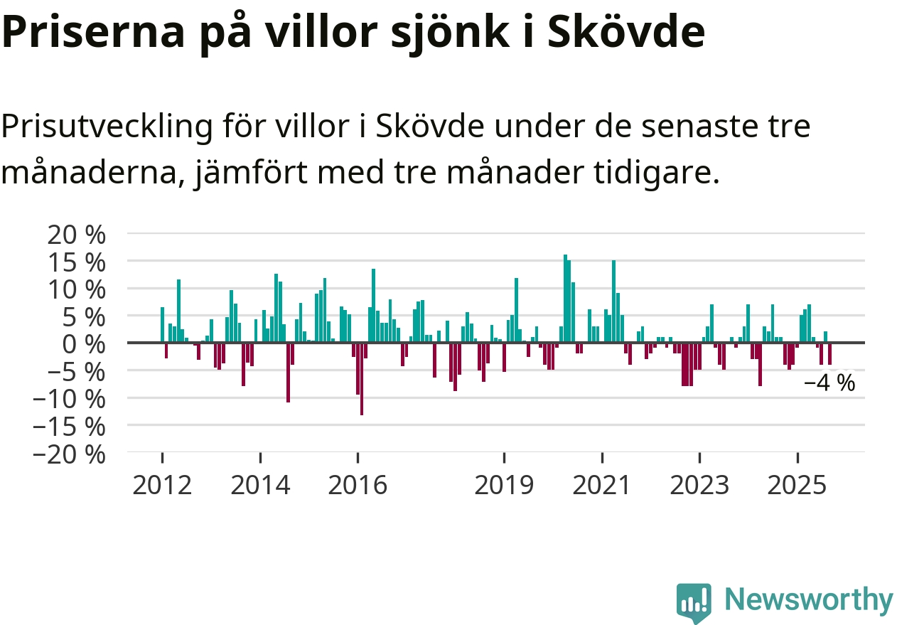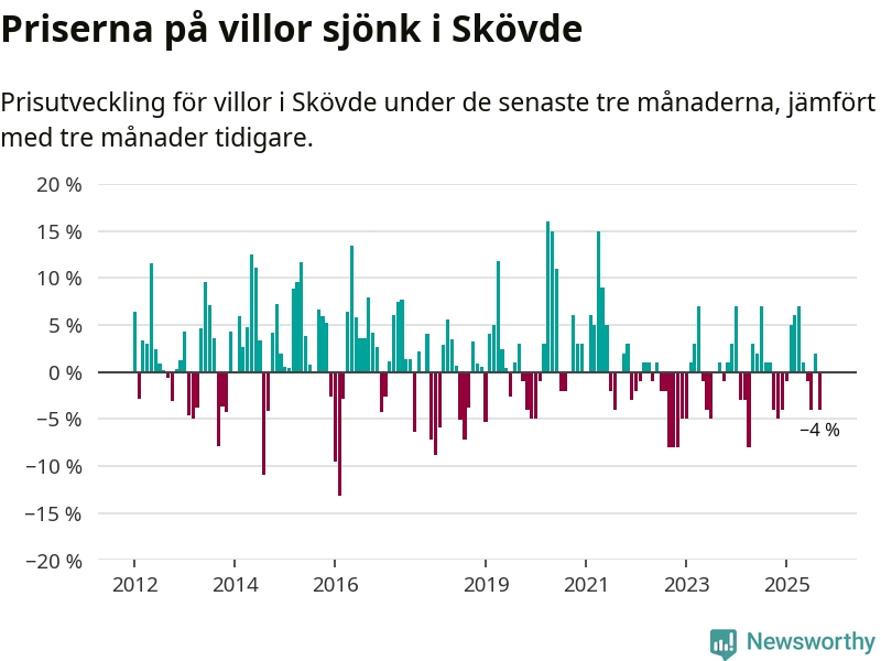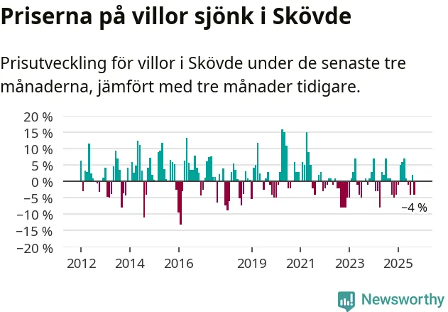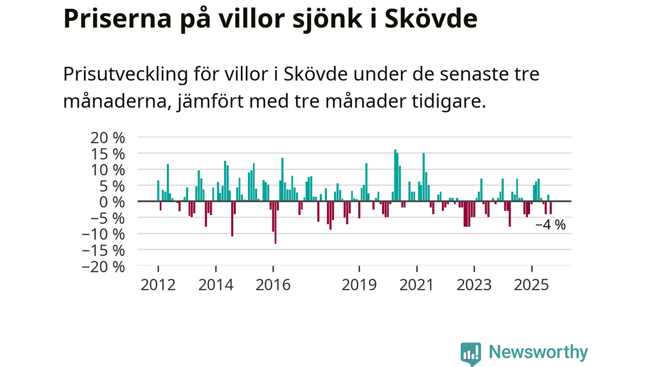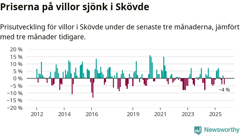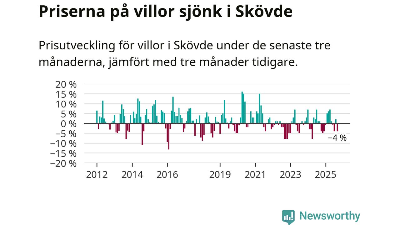 Villapriserna har gått ner i Skövde kommun. Medelpriset på försäljningarna under de senaste tre månaderna visar på en nedgång med 4 procent.