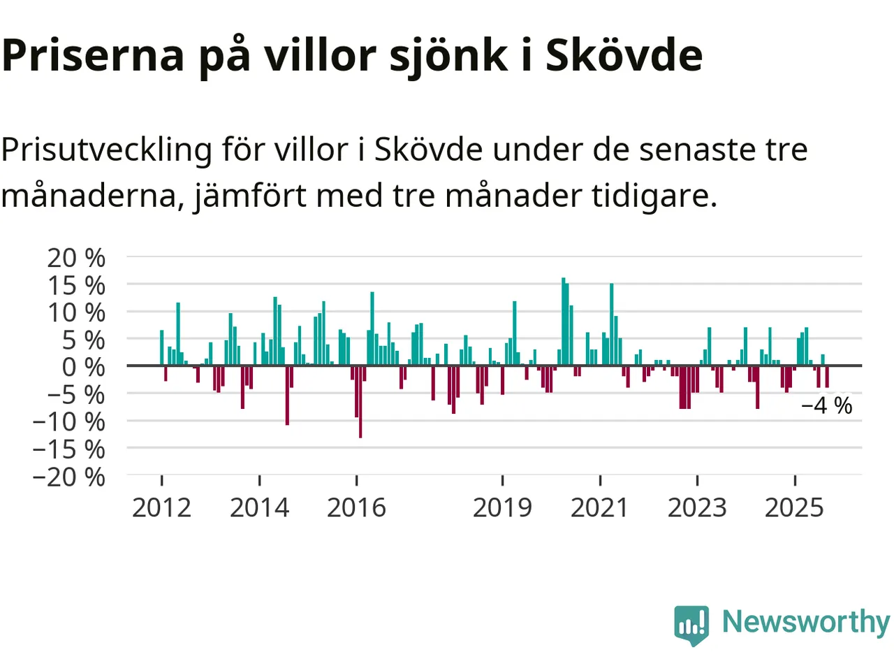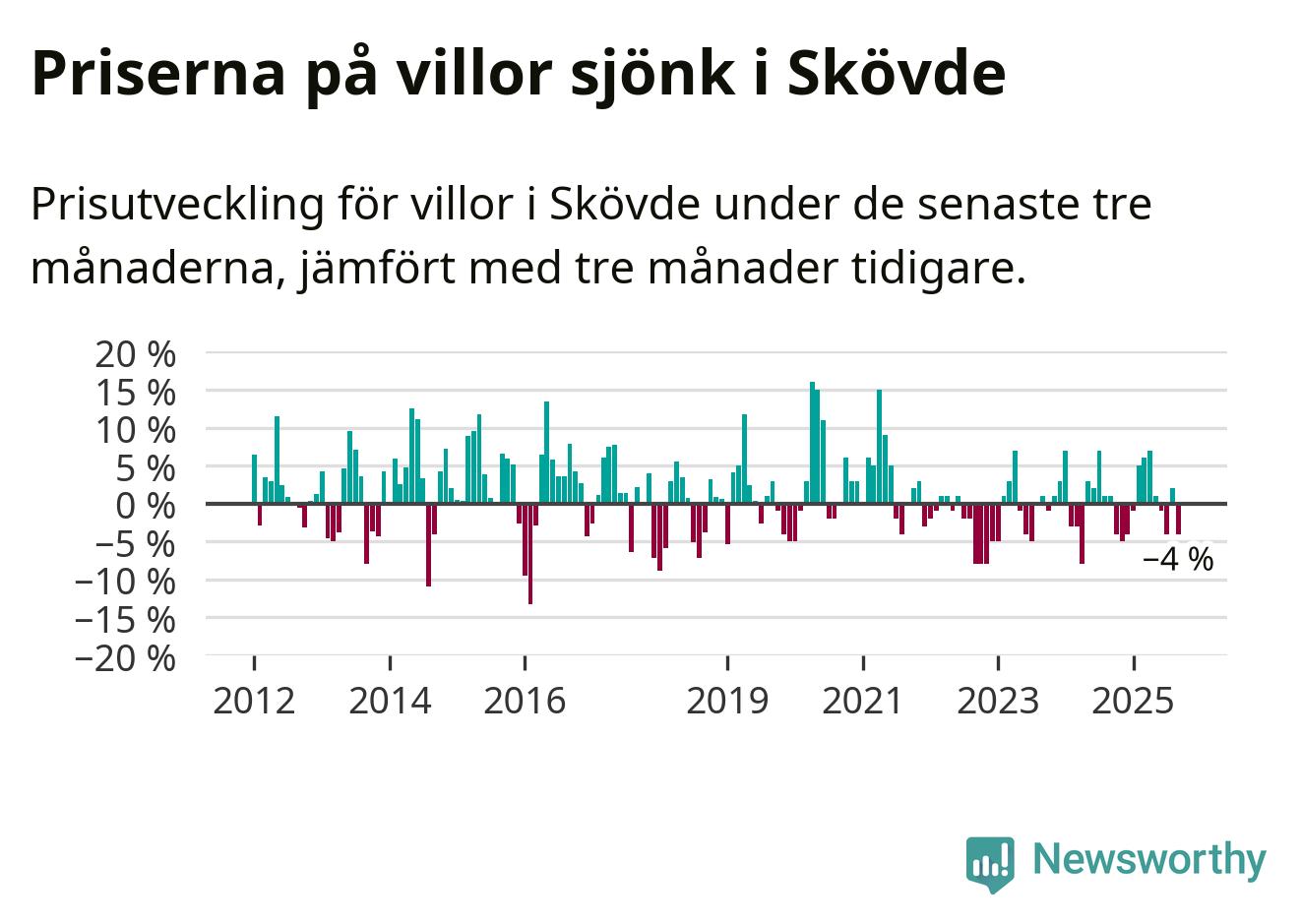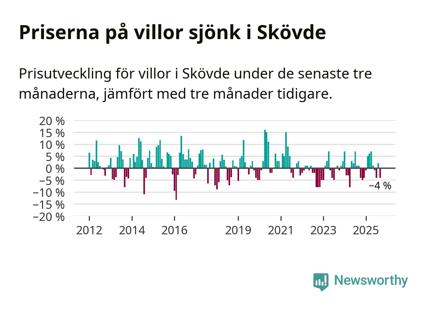 Villapriserna har gått ner i Skövde kommun. Medelpriset på försäljningarna under de senaste tre månaderna visar på en nedgång med 4 procent.