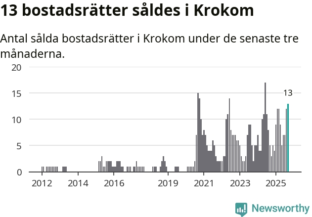 Mellan juli och september gjordes sammanlagt 13 affärer med bostadsrätter i Krokoms kommun. Det kan jämföras med fem vid motsvarande tid i fjol.