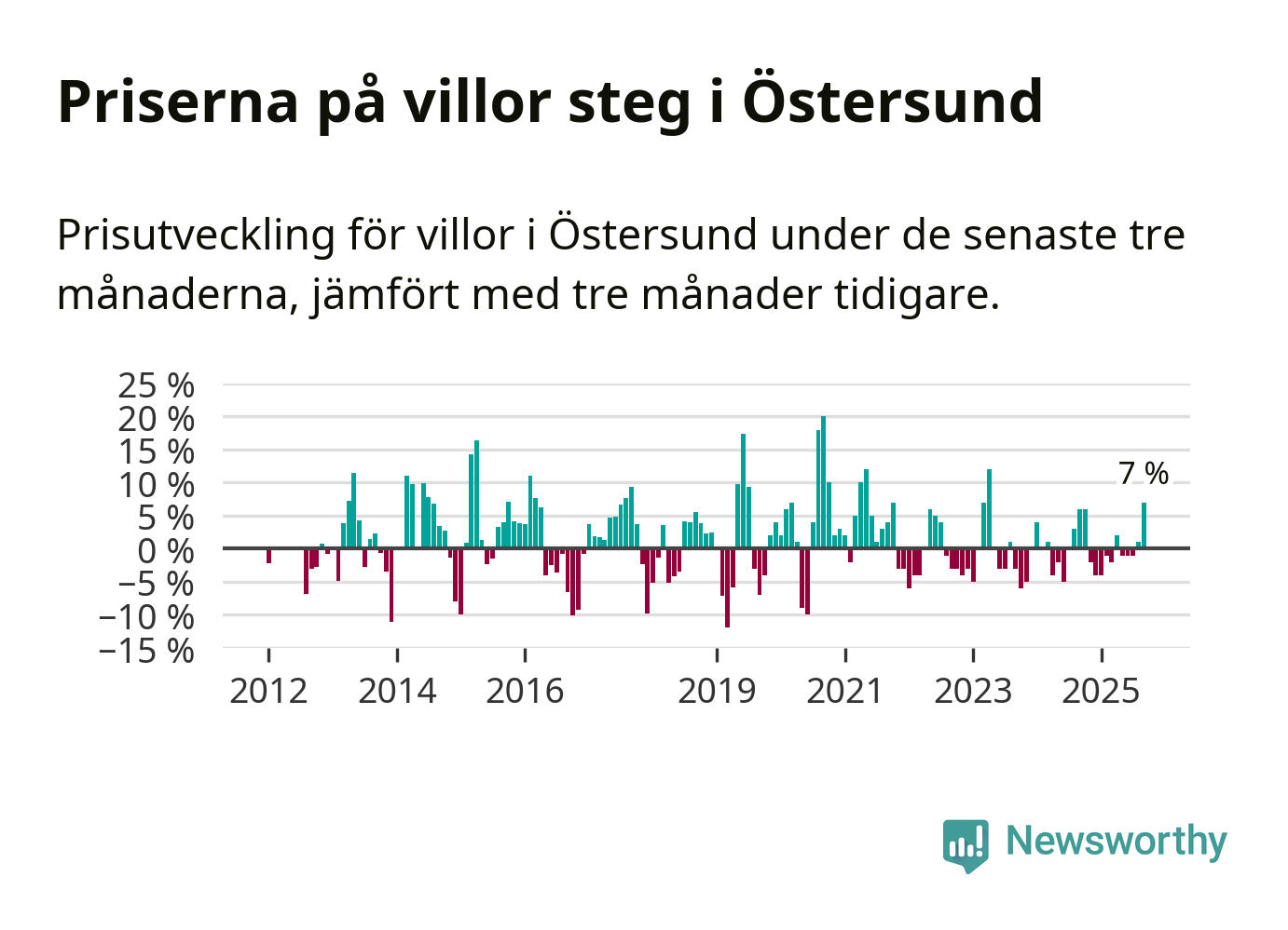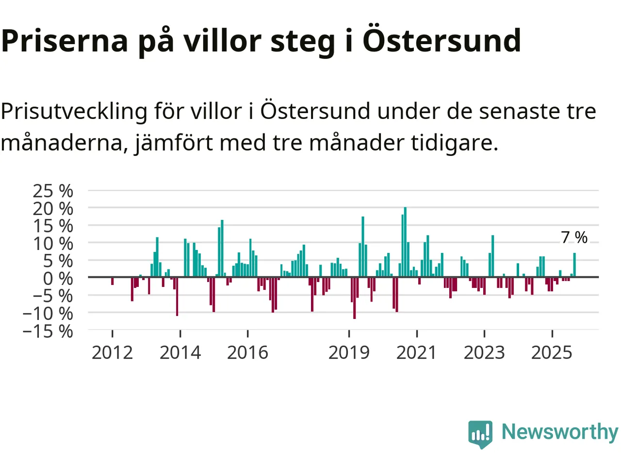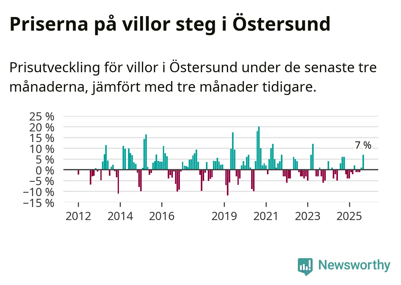 Villapriserna har gått upp i Östersunds kommun. Medelpriset på försäljningarna under de senaste tre månaderna visar på en uppgång med 7 procent.