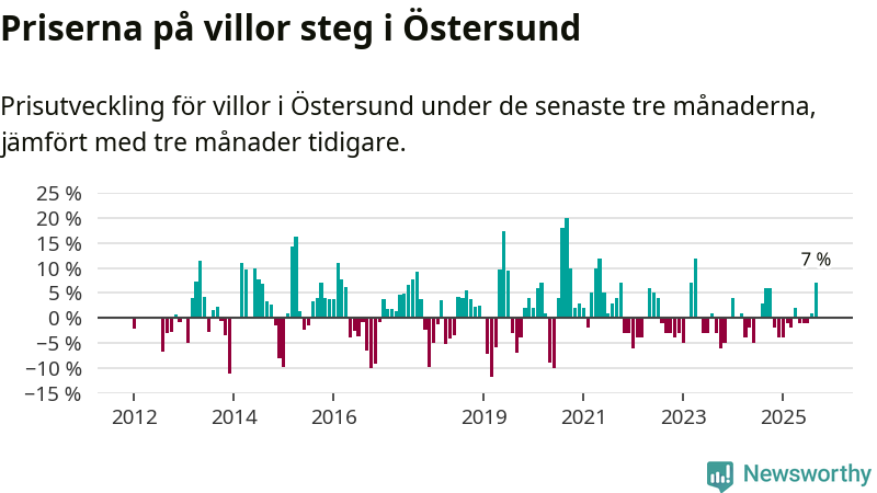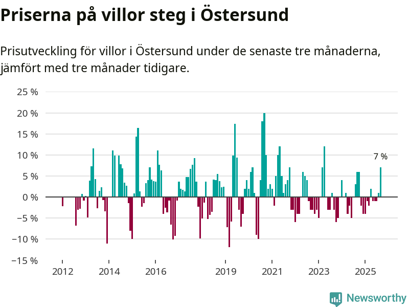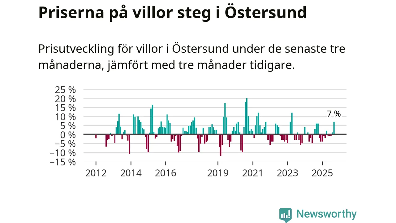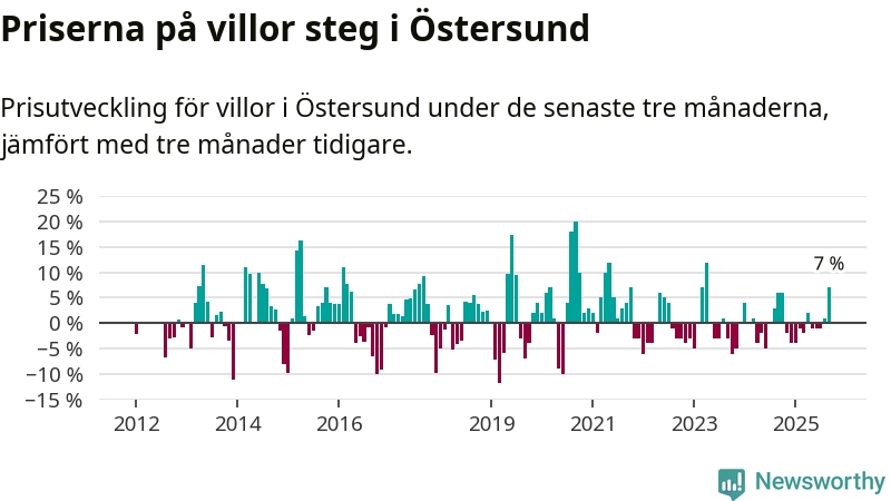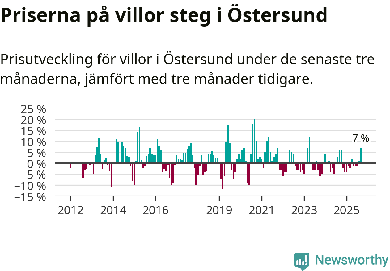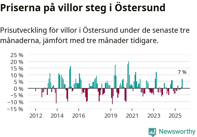 Villapriserna har gått upp i Östersunds kommun. Medelpriset på försäljningarna under de senaste tre månaderna visar på en uppgång med 7 procent.
