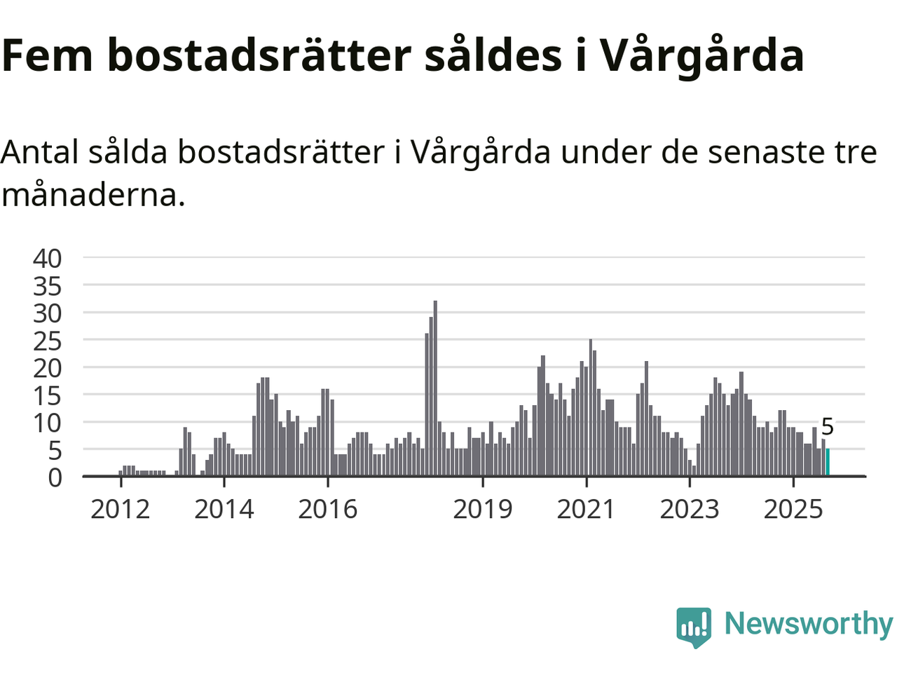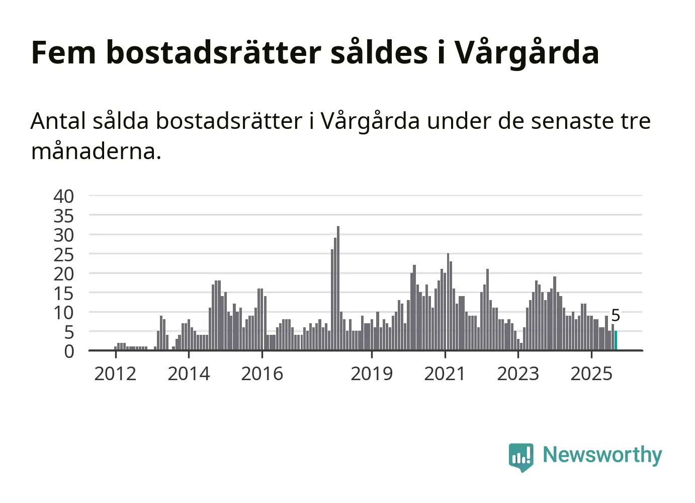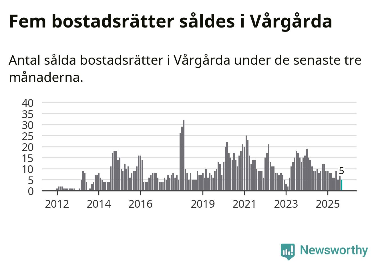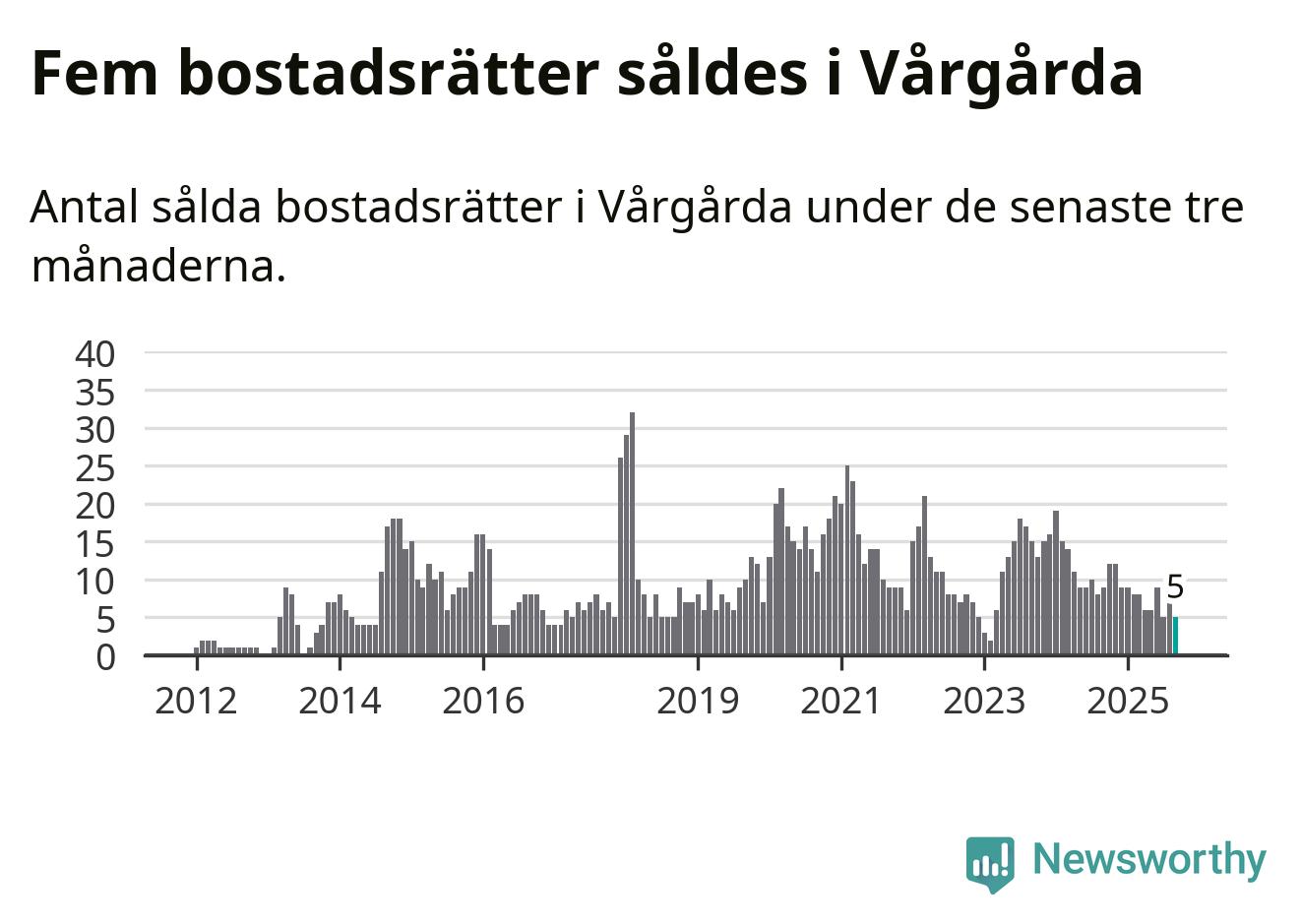 Mellan juli och september gjordes sammanlagt fem affärer med bostadsrätter i Vårgårda kommun. Det kan jämföras med nio vid motsvarande tid i fjol.
