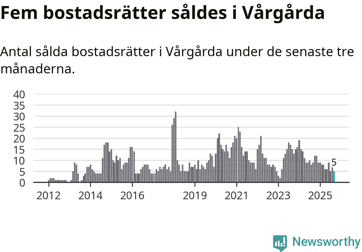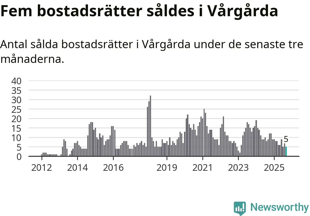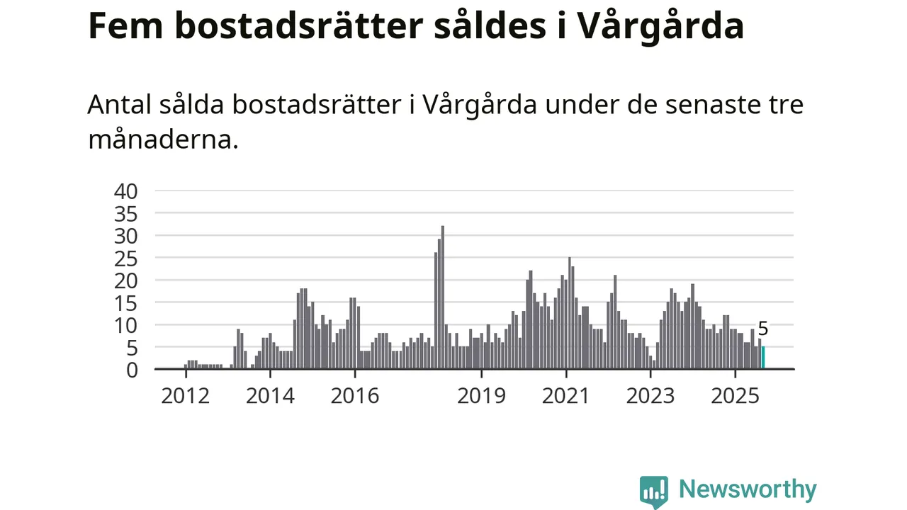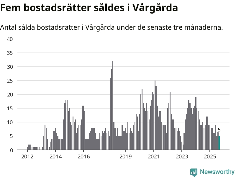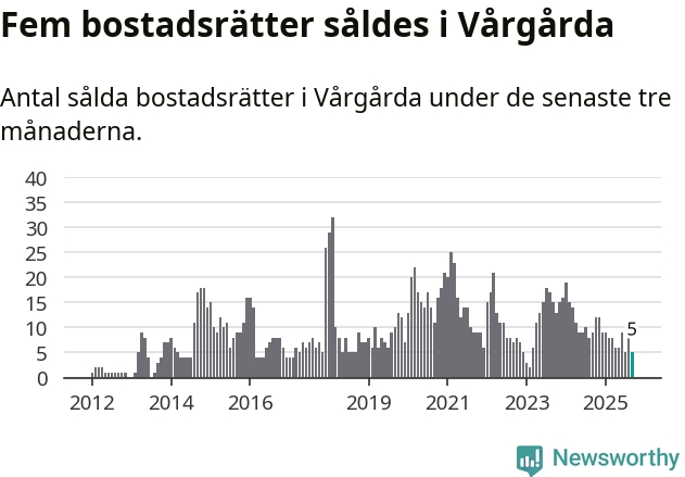 Mellan juli och september gjordes sammanlagt fem affärer med bostadsrätter i Vårgårda kommun. Det kan jämföras med nio vid motsvarande tid i fjol.