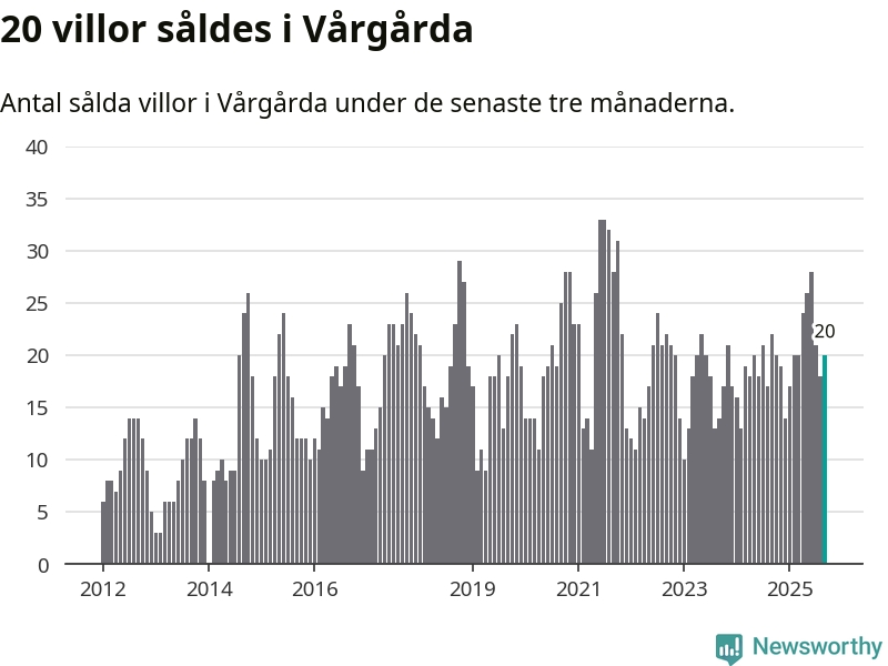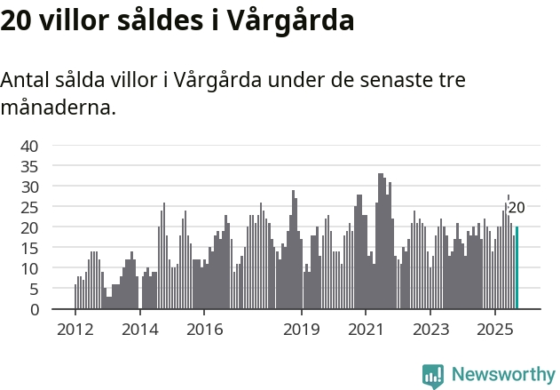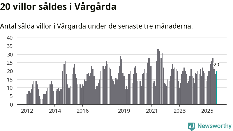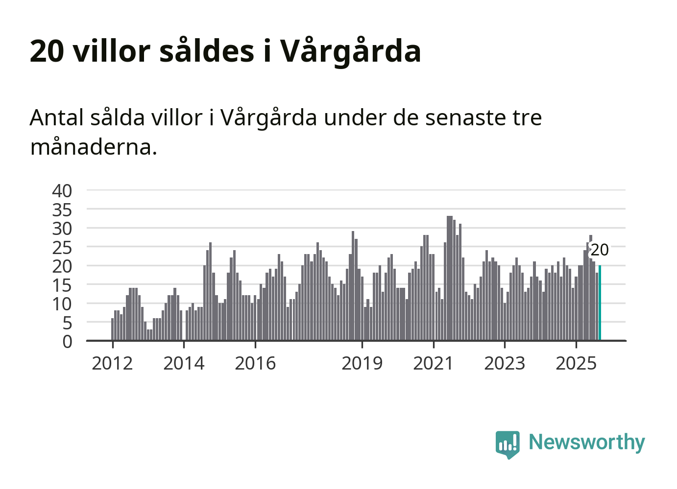 Mellan juli och september gjordes sammanlagt 20 affärer med villor i Vårgårda kommun. Det kan jämföras med 22 vid motsvarande tid i fjol.