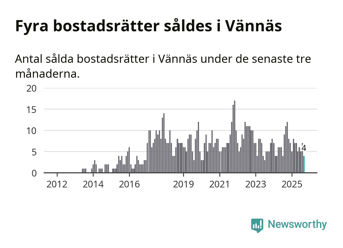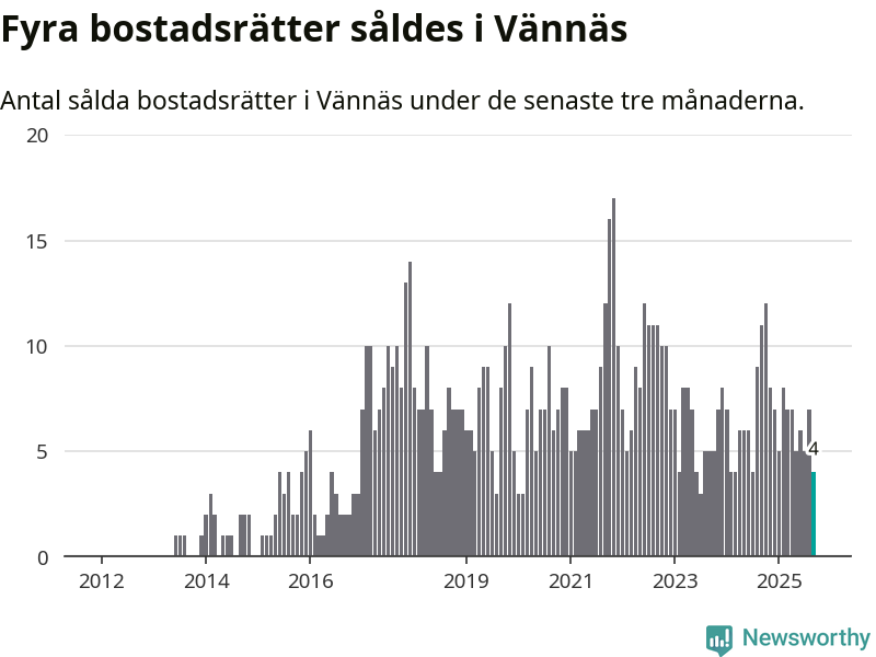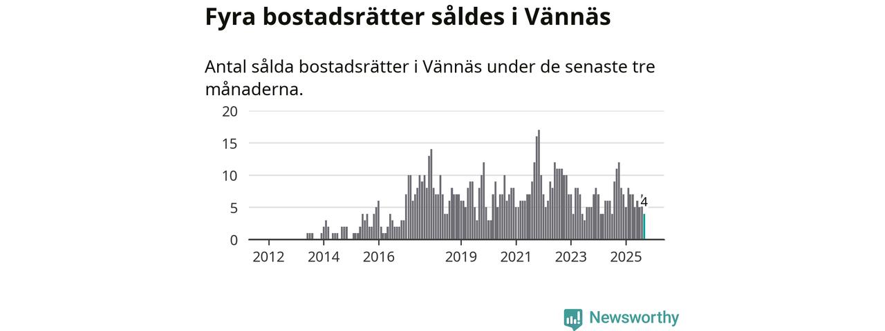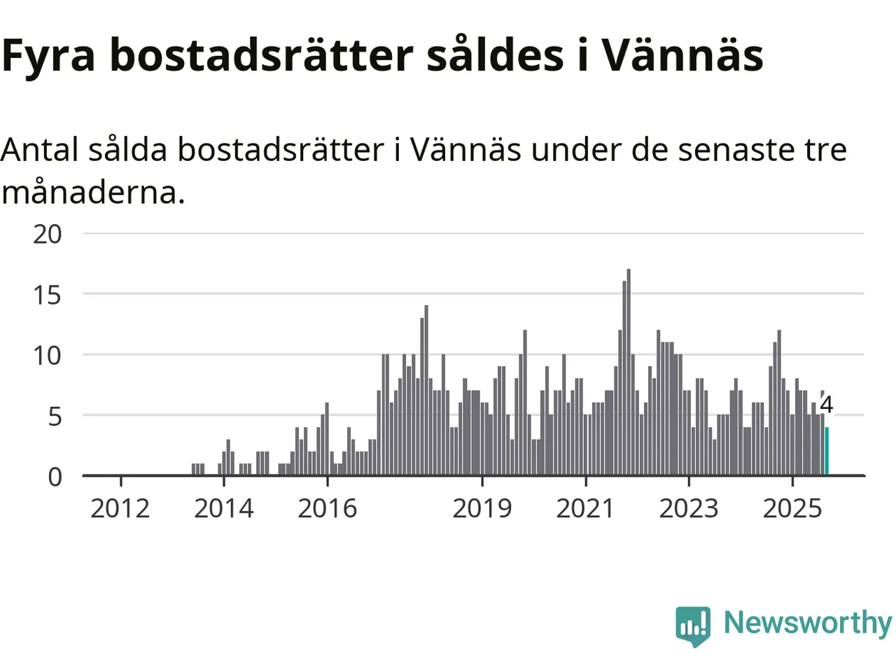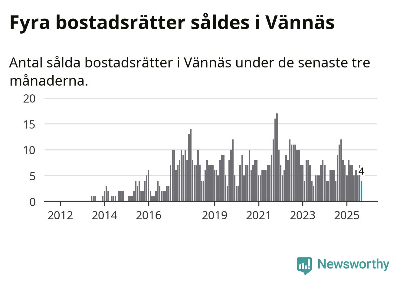 Mellan juli och september gjordes sammanlagt fyra affärer med bostadsrätter i Vännäs kommun. Det kan jämföras med elva vid motsvarande tid i fjol.