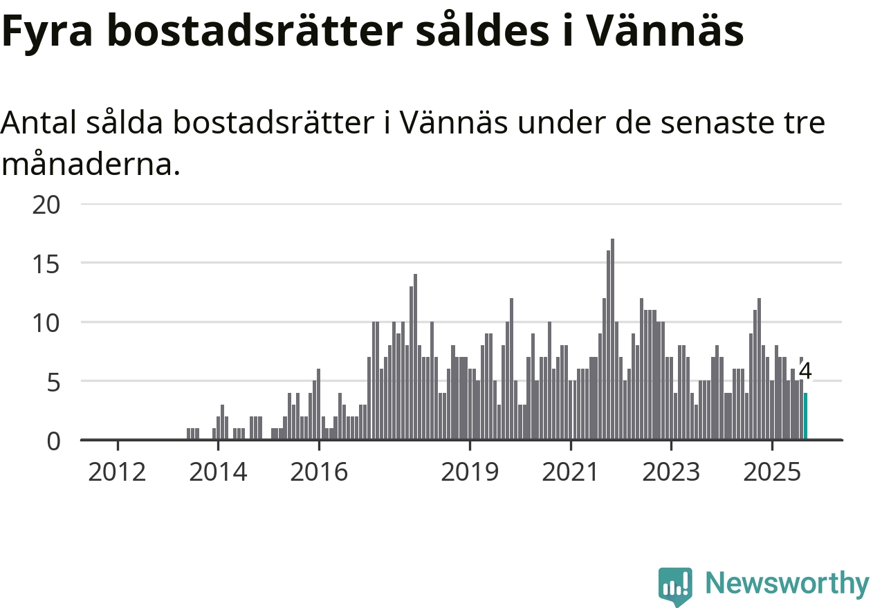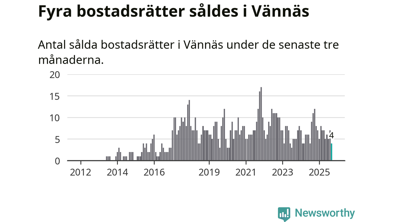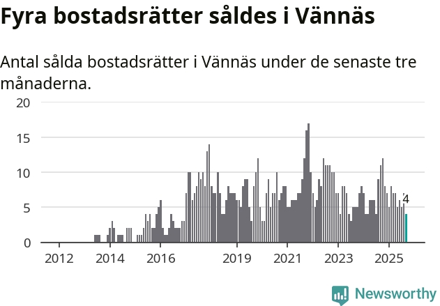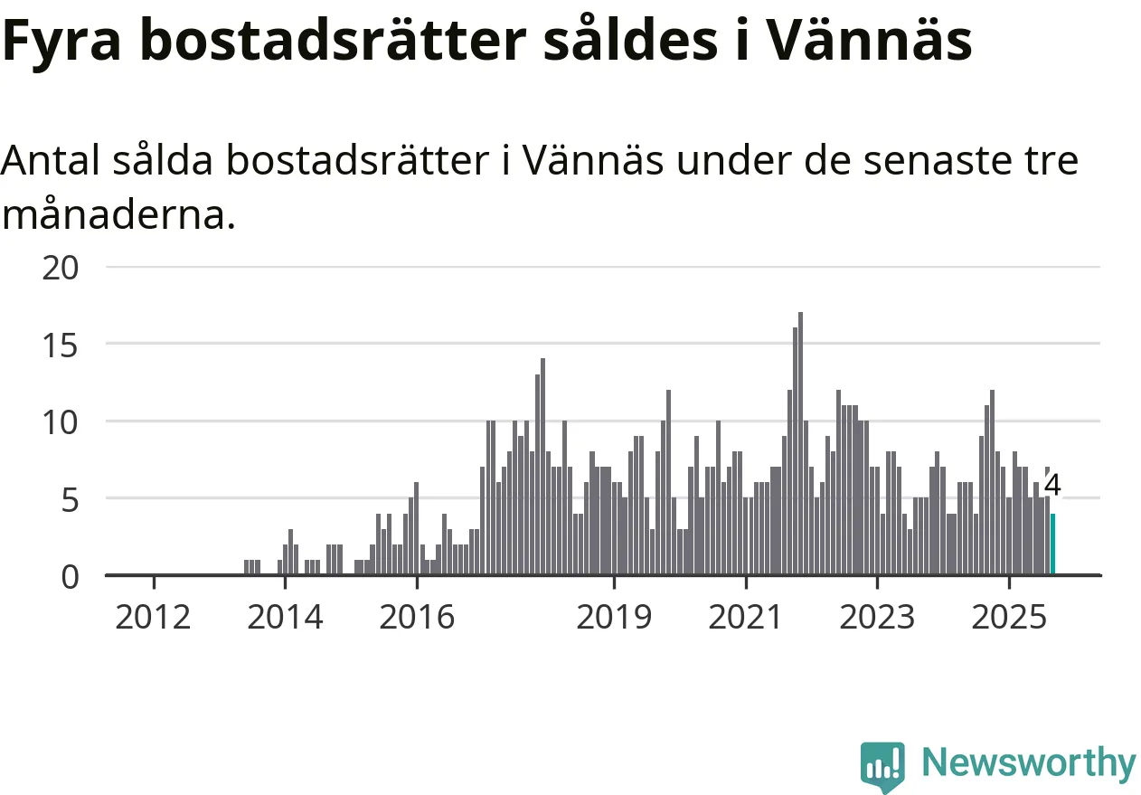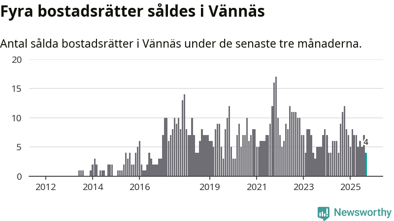 Mellan juli och september gjordes sammanlagt fyra affärer med bostadsrätter i Vännäs kommun. Det kan jämföras med elva vid motsvarande tid i fjol.