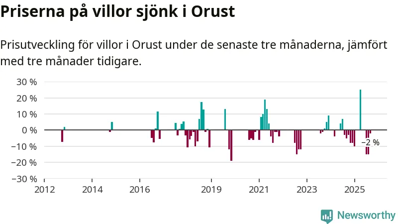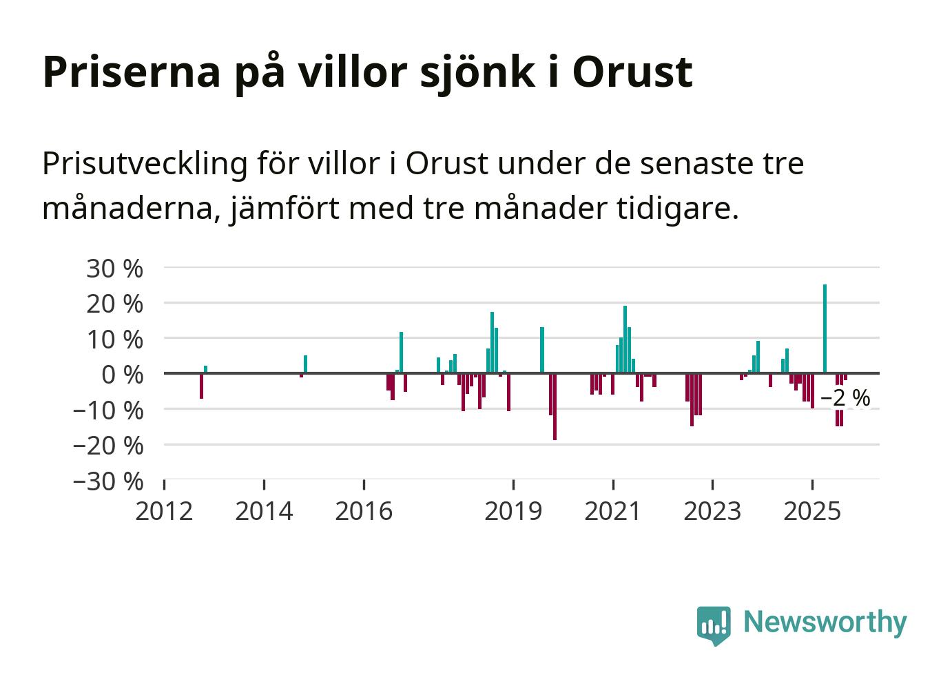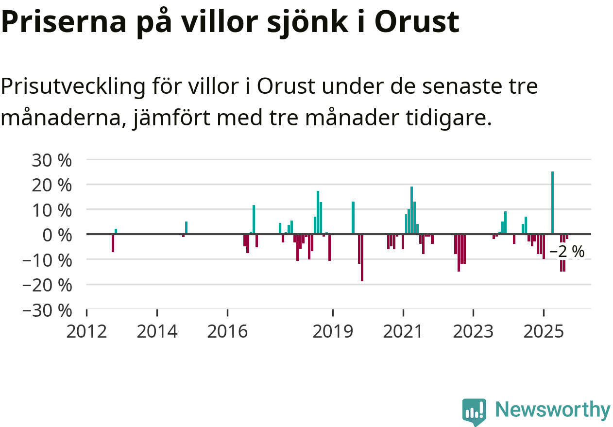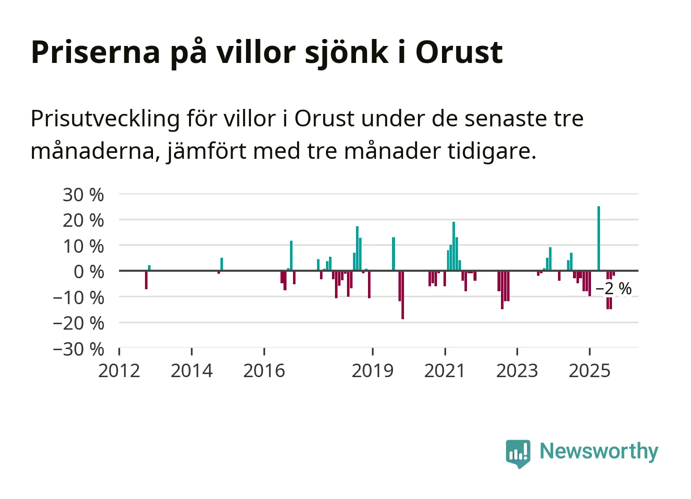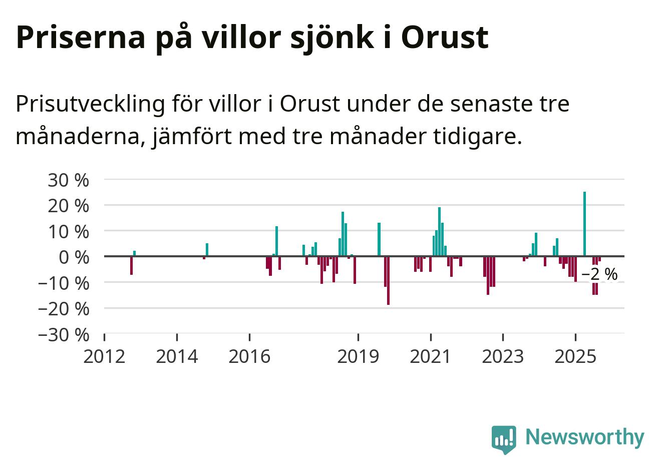 Statistiken visar även på en prisnedgång i Orusts kommun. Medelpriset på försäljningarna av villor i kommunen var 2 procent lägre än för tre månader sedan. I hela Västra Götaland däremot ligger villapriserna stilla.