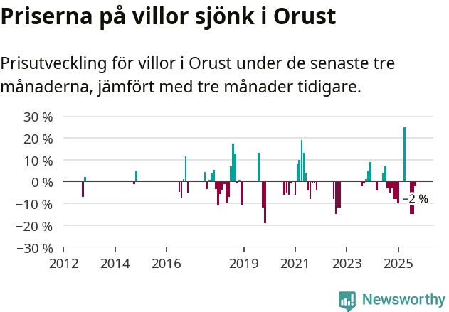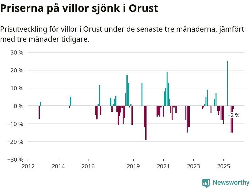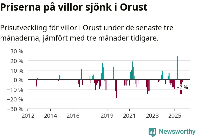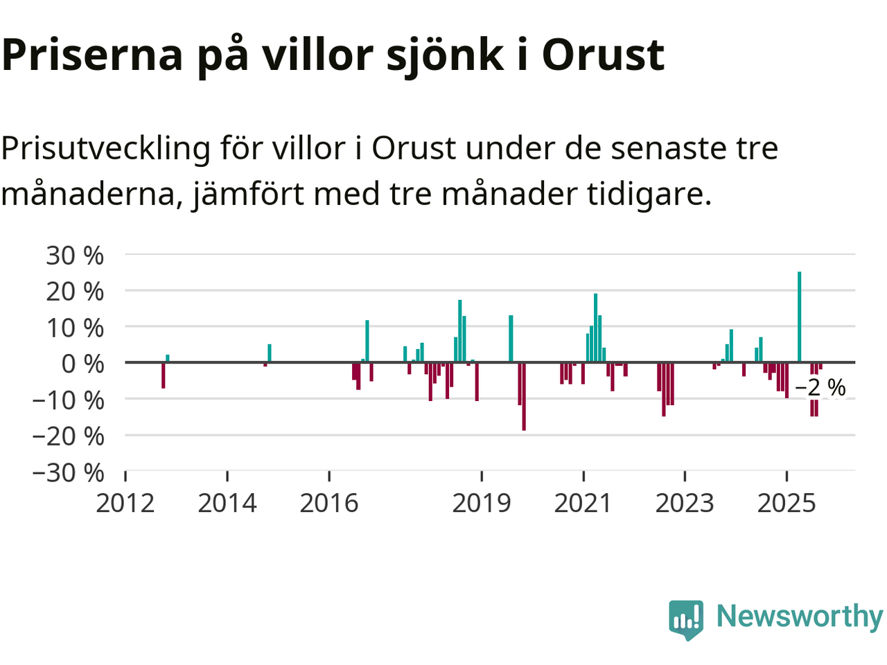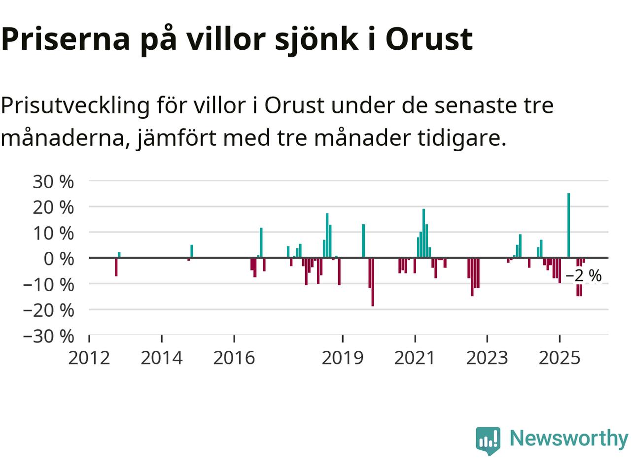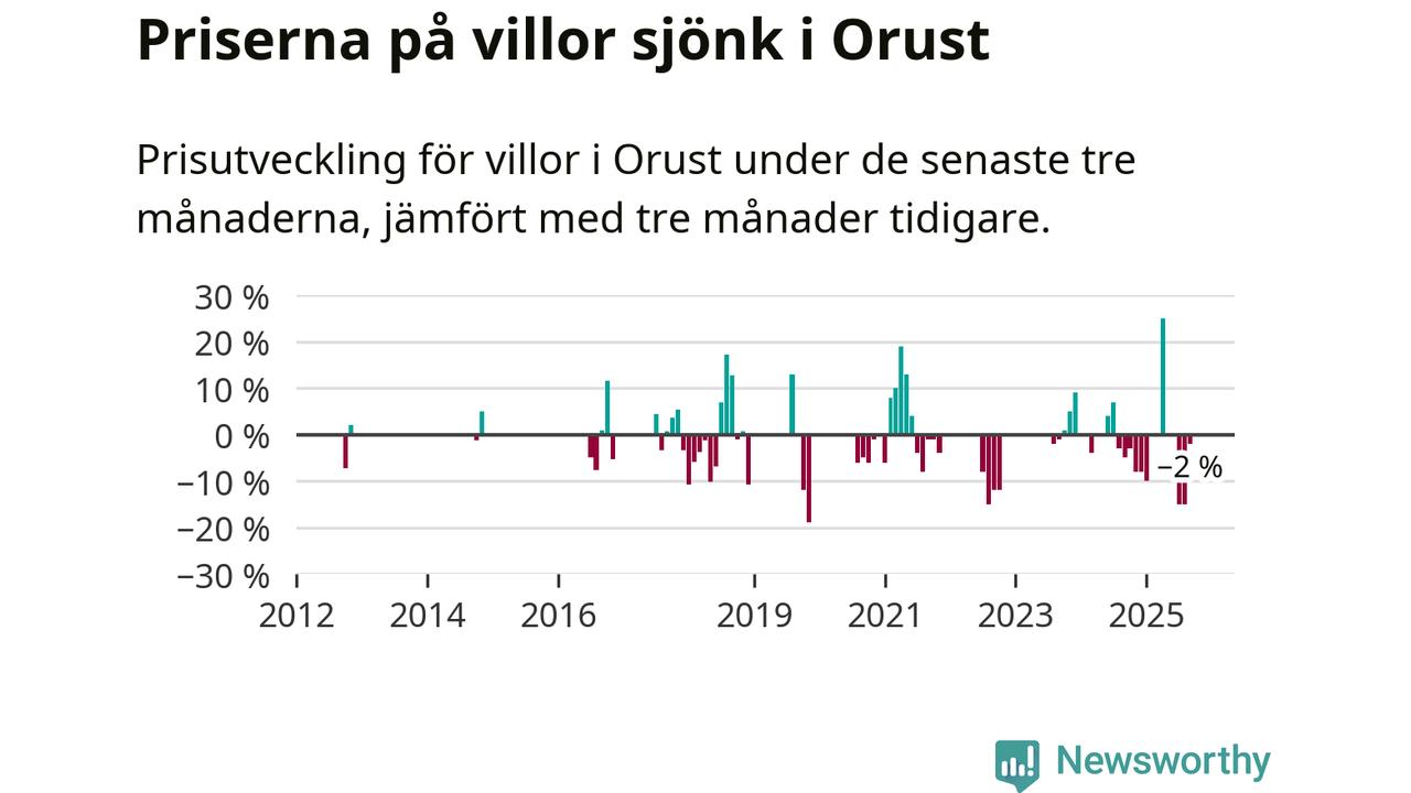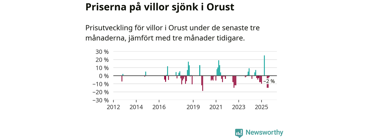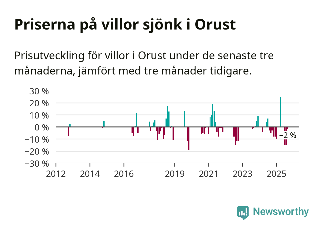 Statistiken visar även på en prisnedgång i Orusts kommun. Medelpriset på försäljningarna av villor i kommunen var 2 procent lägre än för tre månader sedan. I hela Västra Götaland däremot ligger villapriserna stilla.