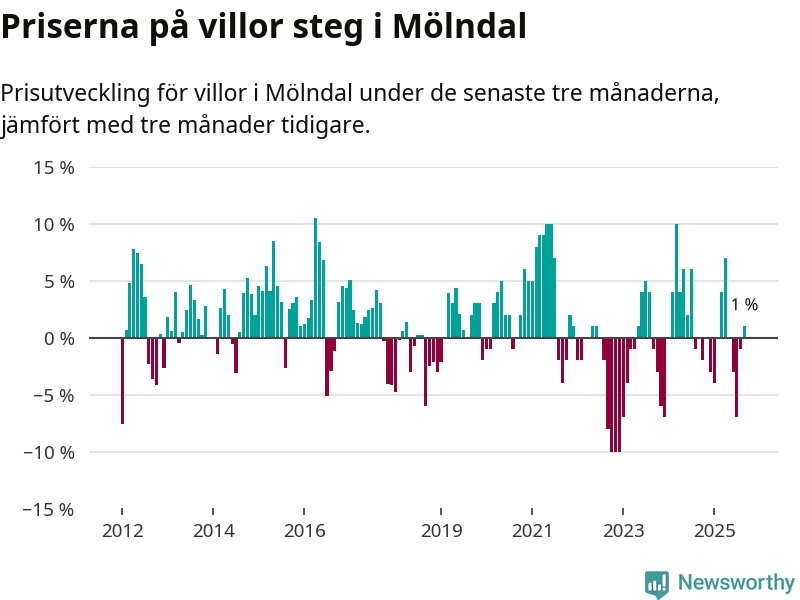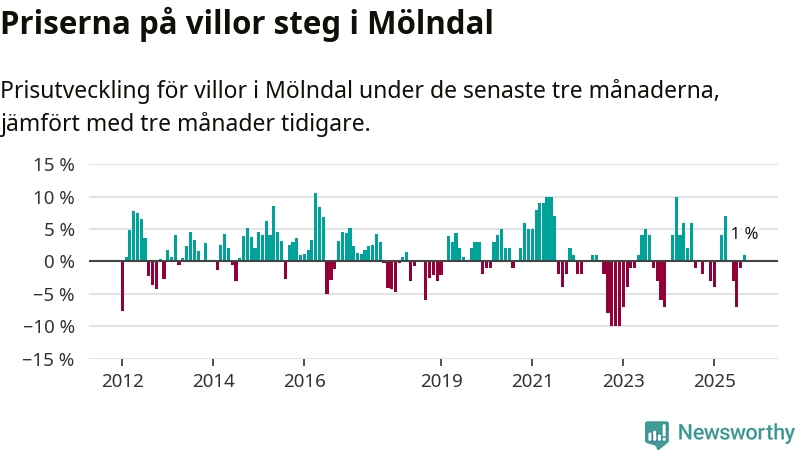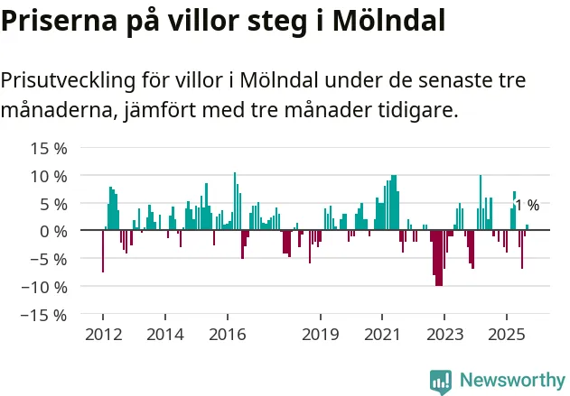 Villapriserna har gått upp i Mölndals kommun. Medelpriset på försäljningarna under de senaste tre månaderna visar på en uppgång med 1 procent.