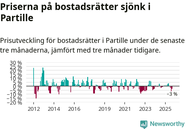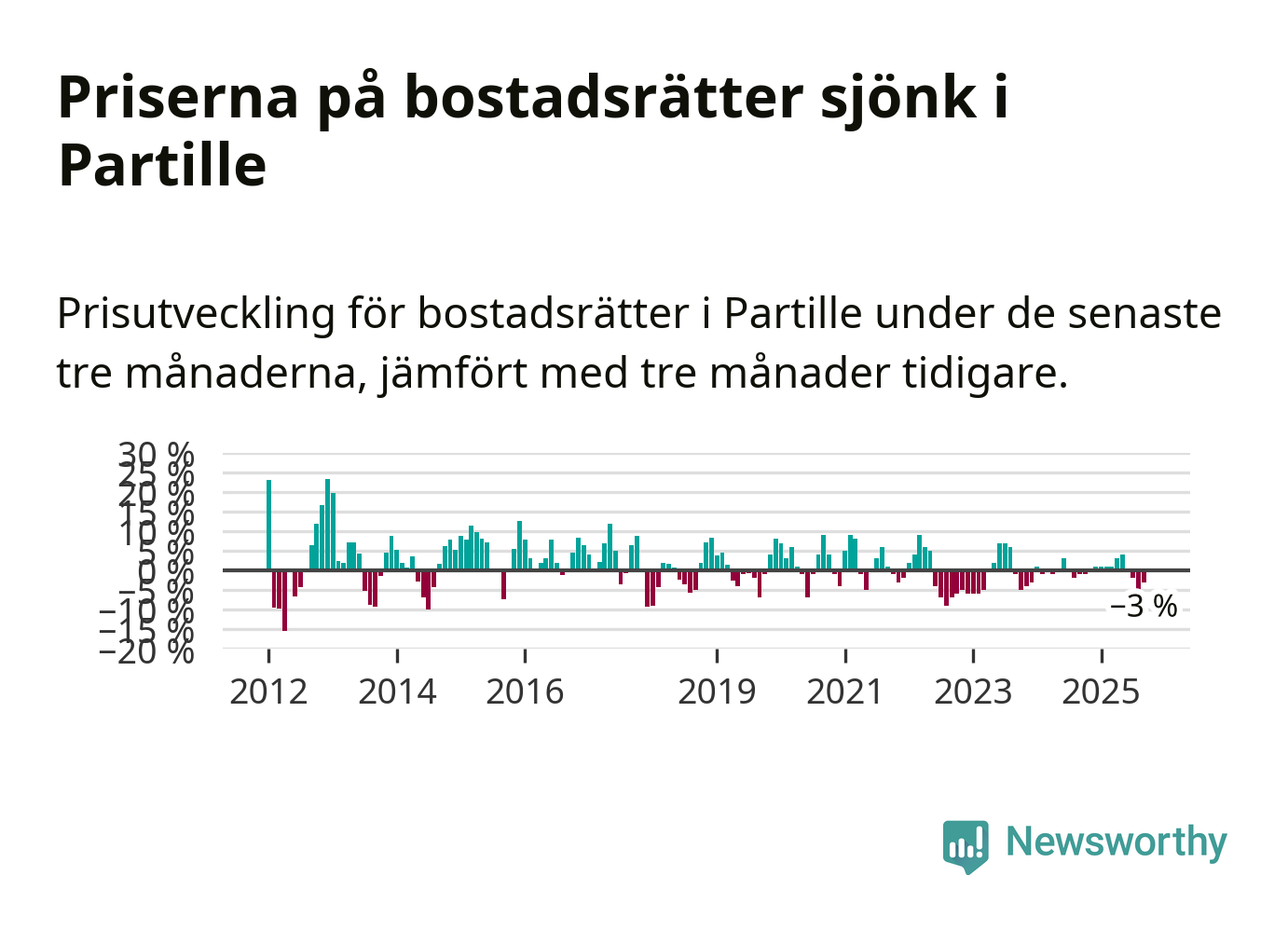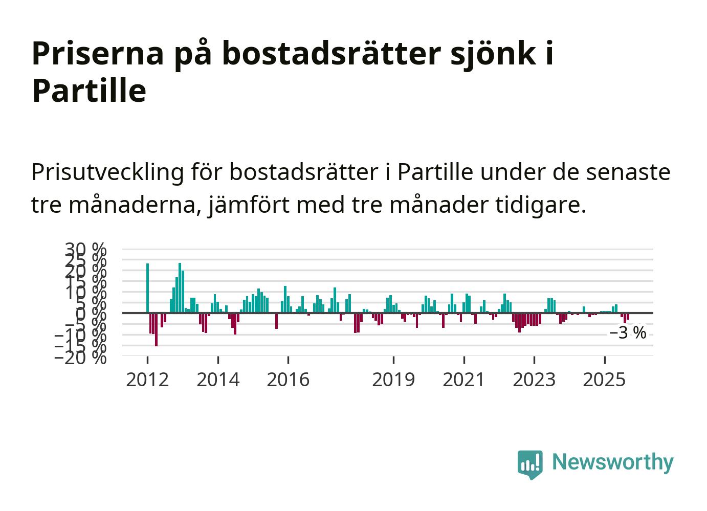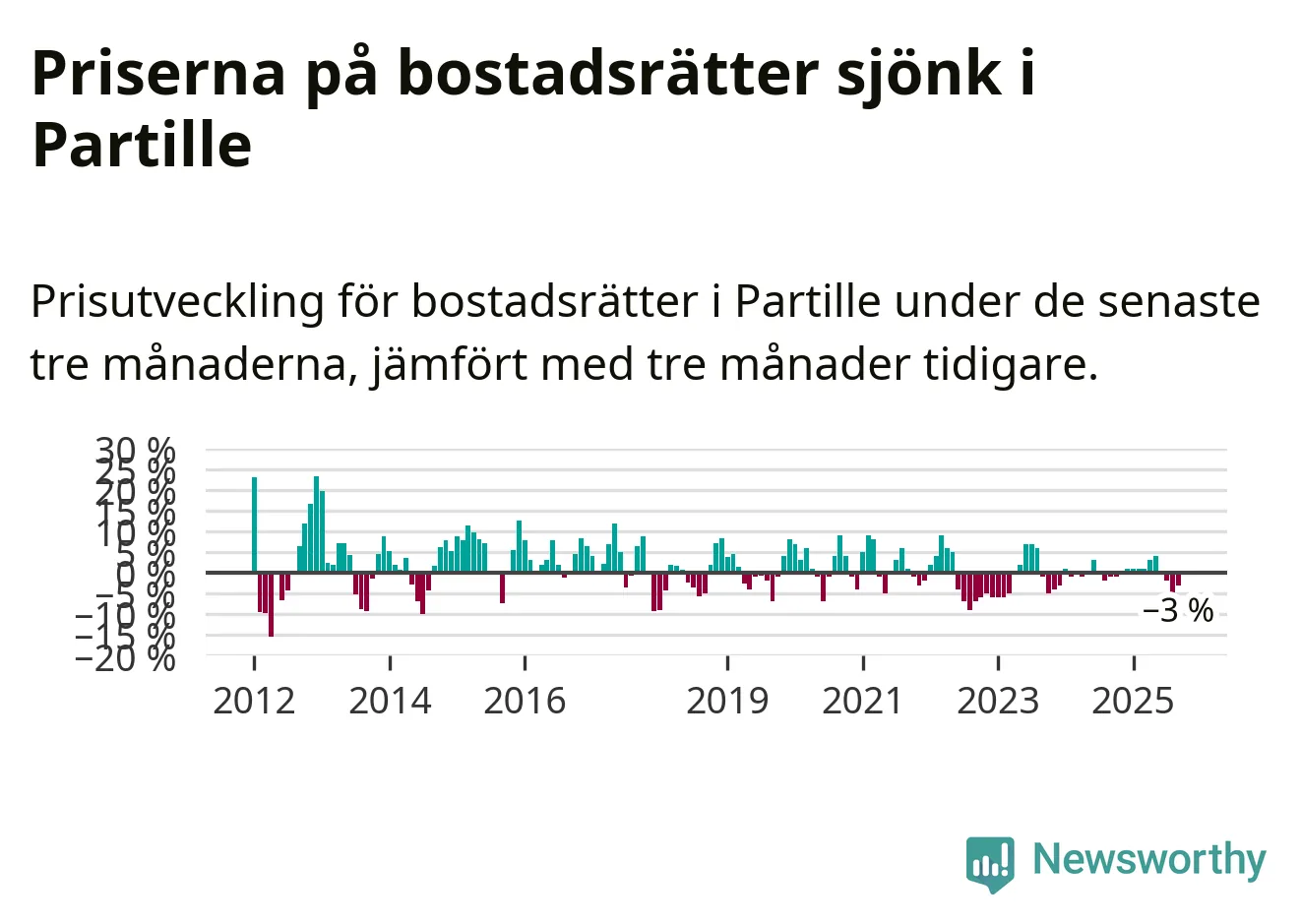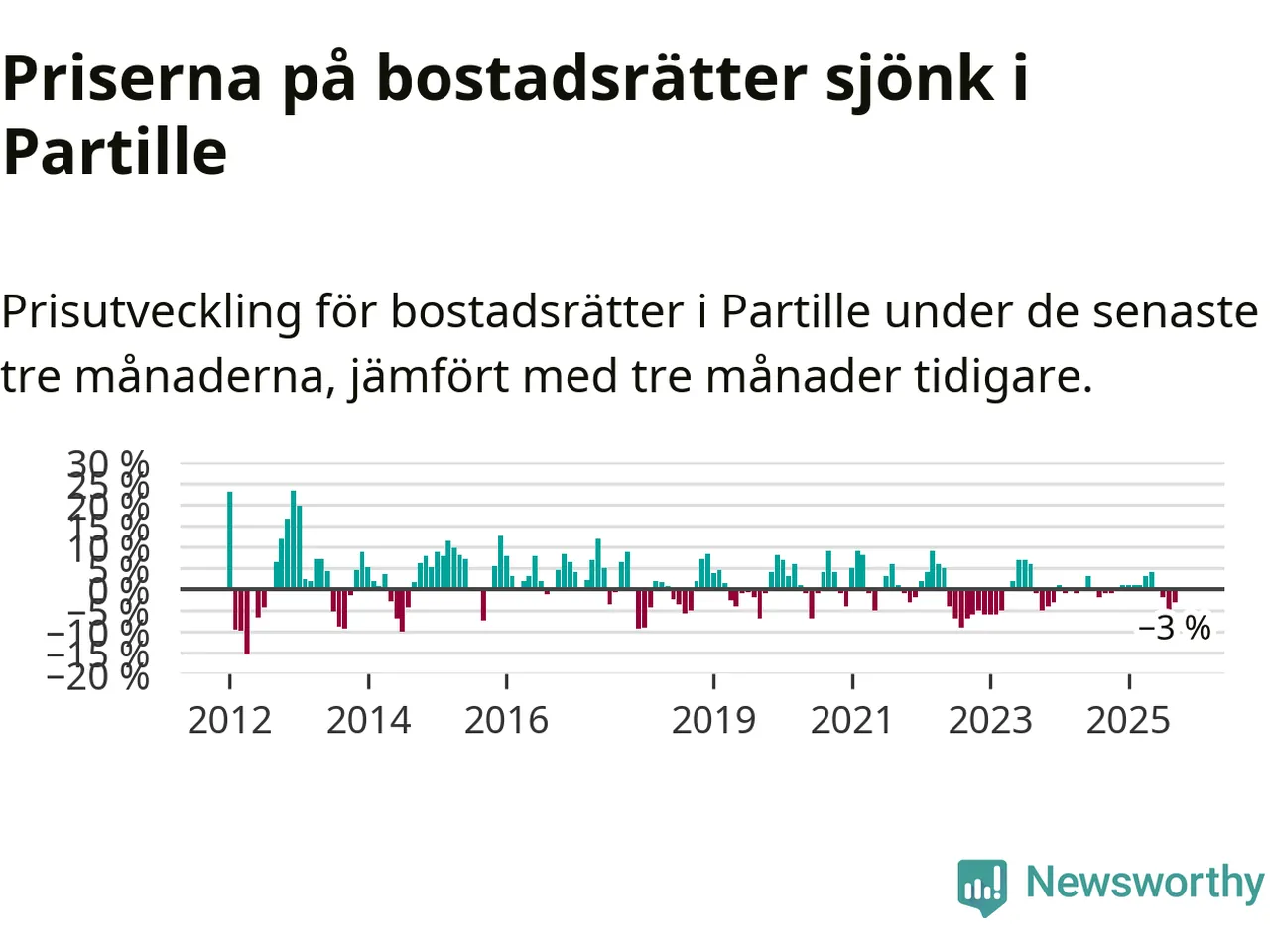 Priserna på bostadsrätter har gått ner i Partille kommun. Medelpriset på försäljningarna under de senaste tre månaderna visar på en nedgång med 3 procent.