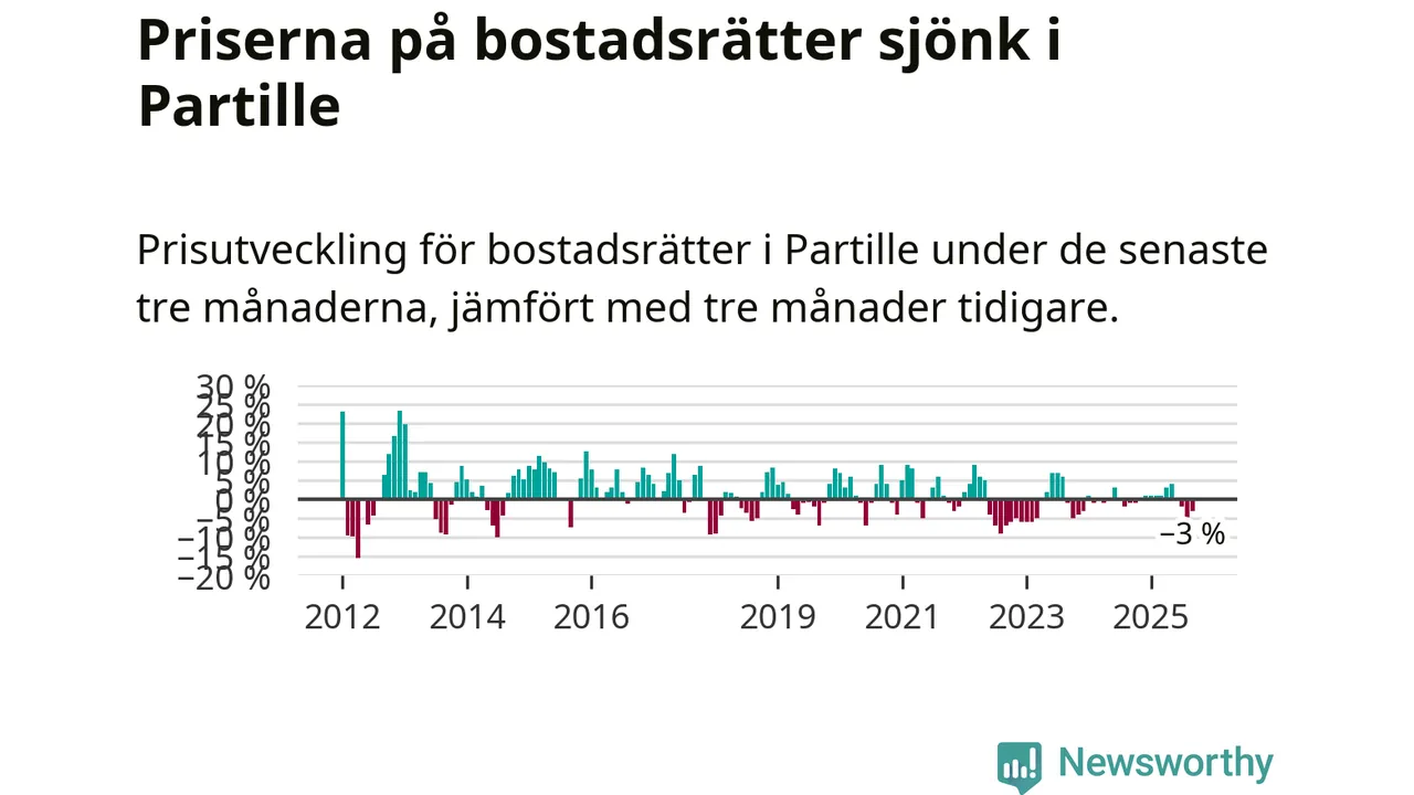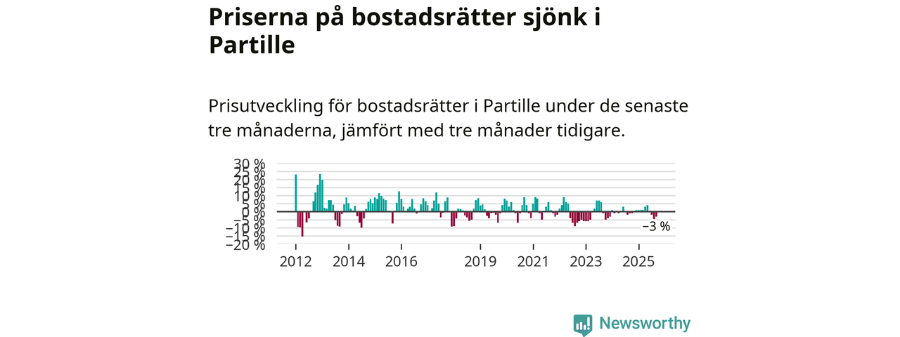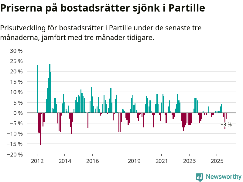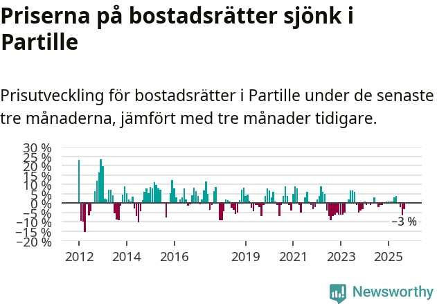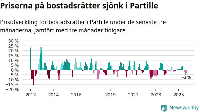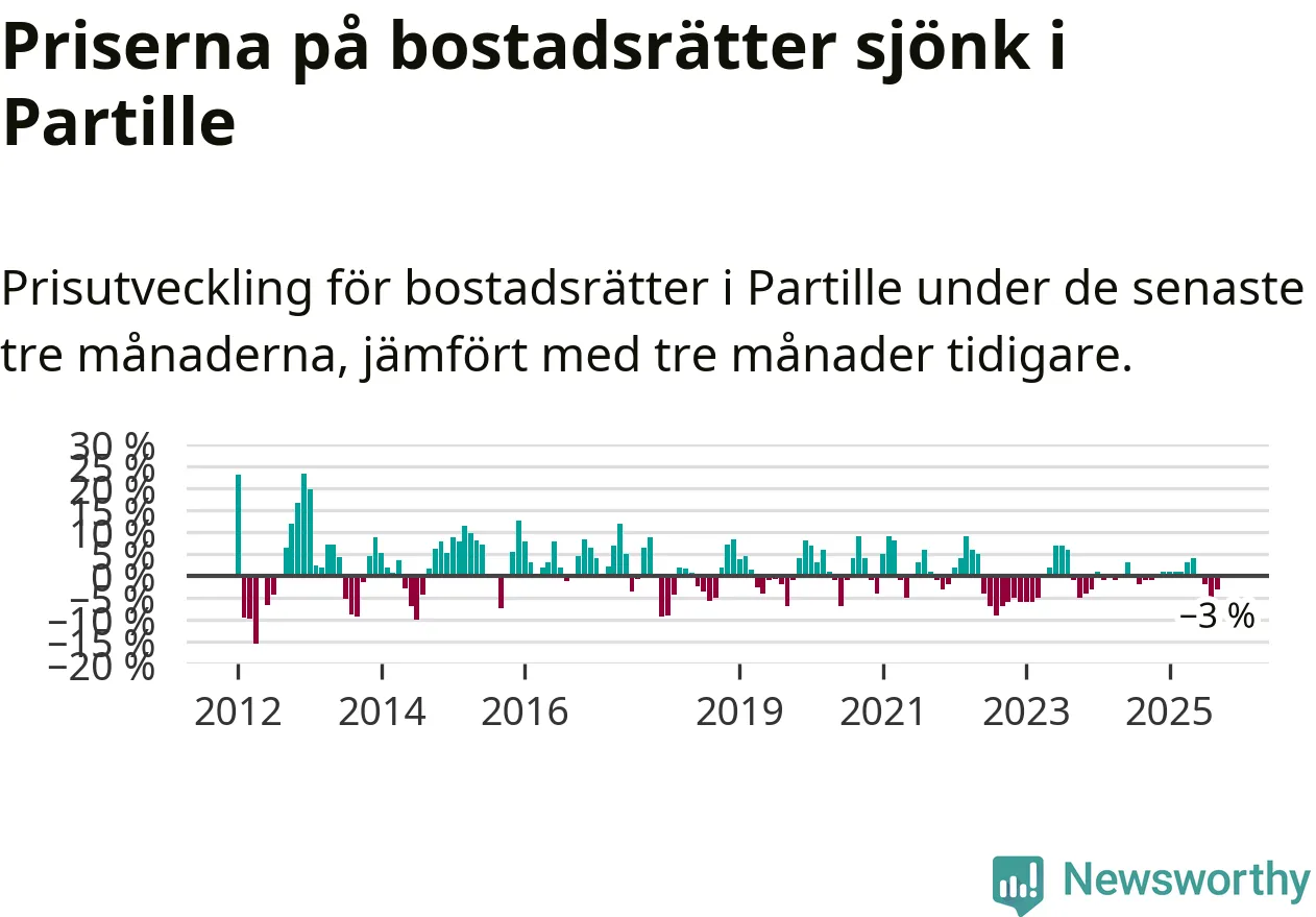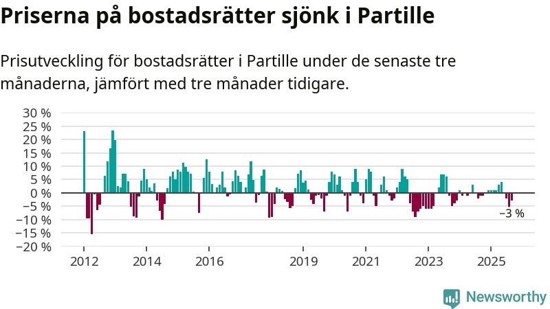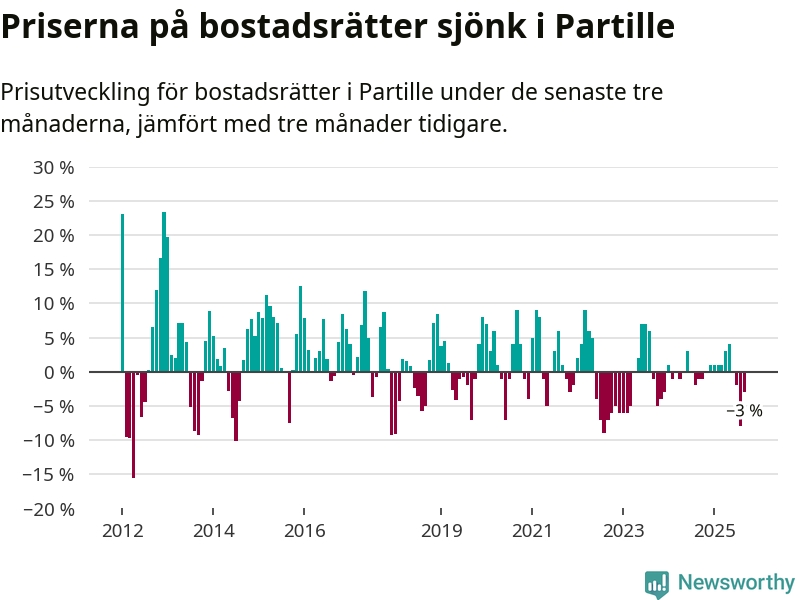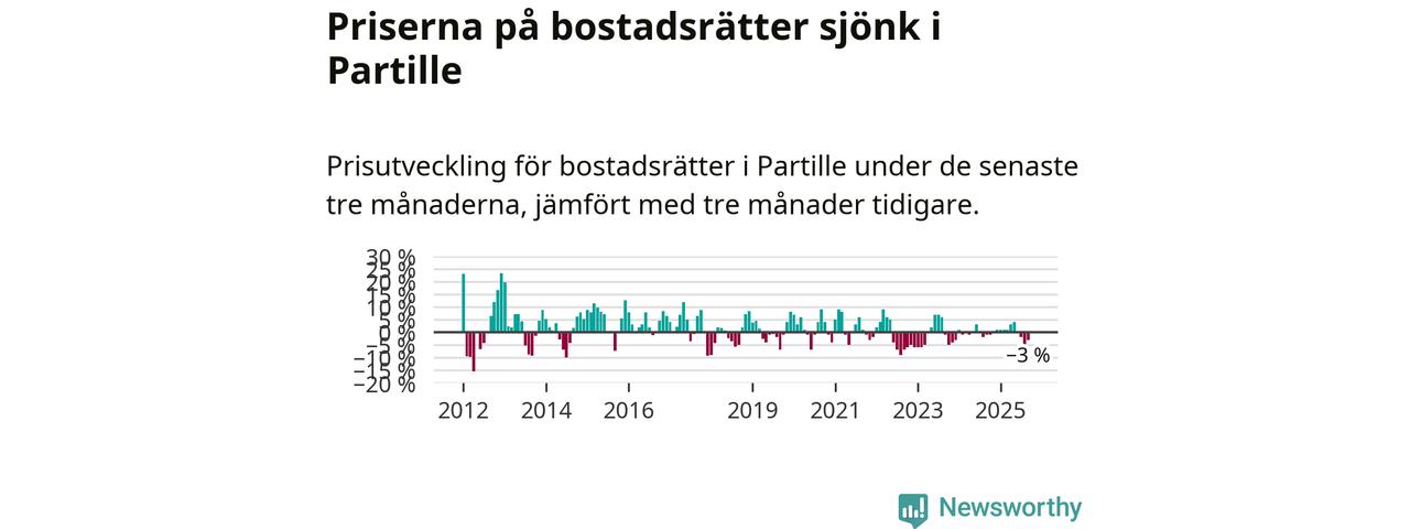 Priserna på bostadsrätter har gått ner i Partille kommun. Medelpriset på försäljningarna under de senaste tre månaderna visar på en nedgång med 3 procent.