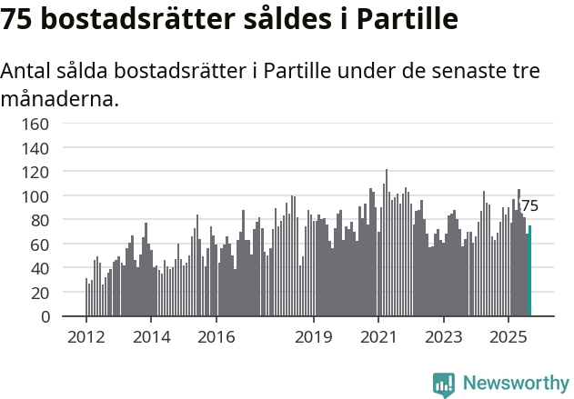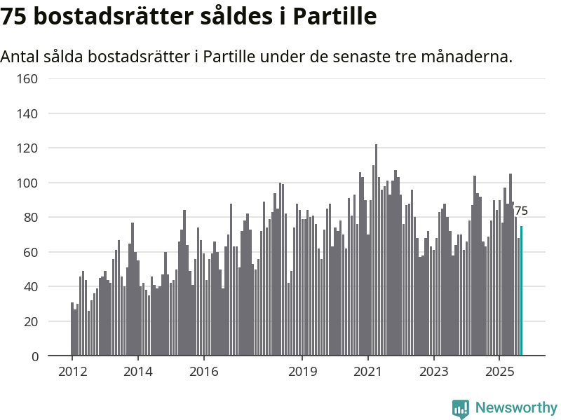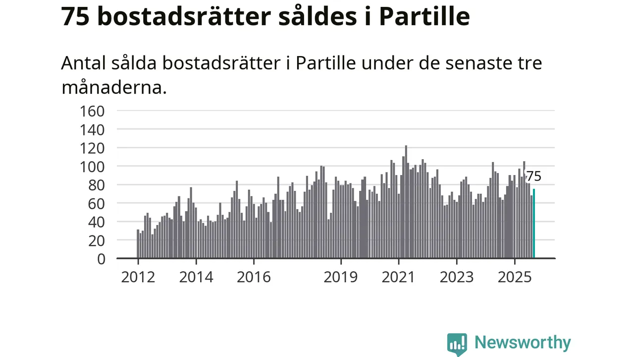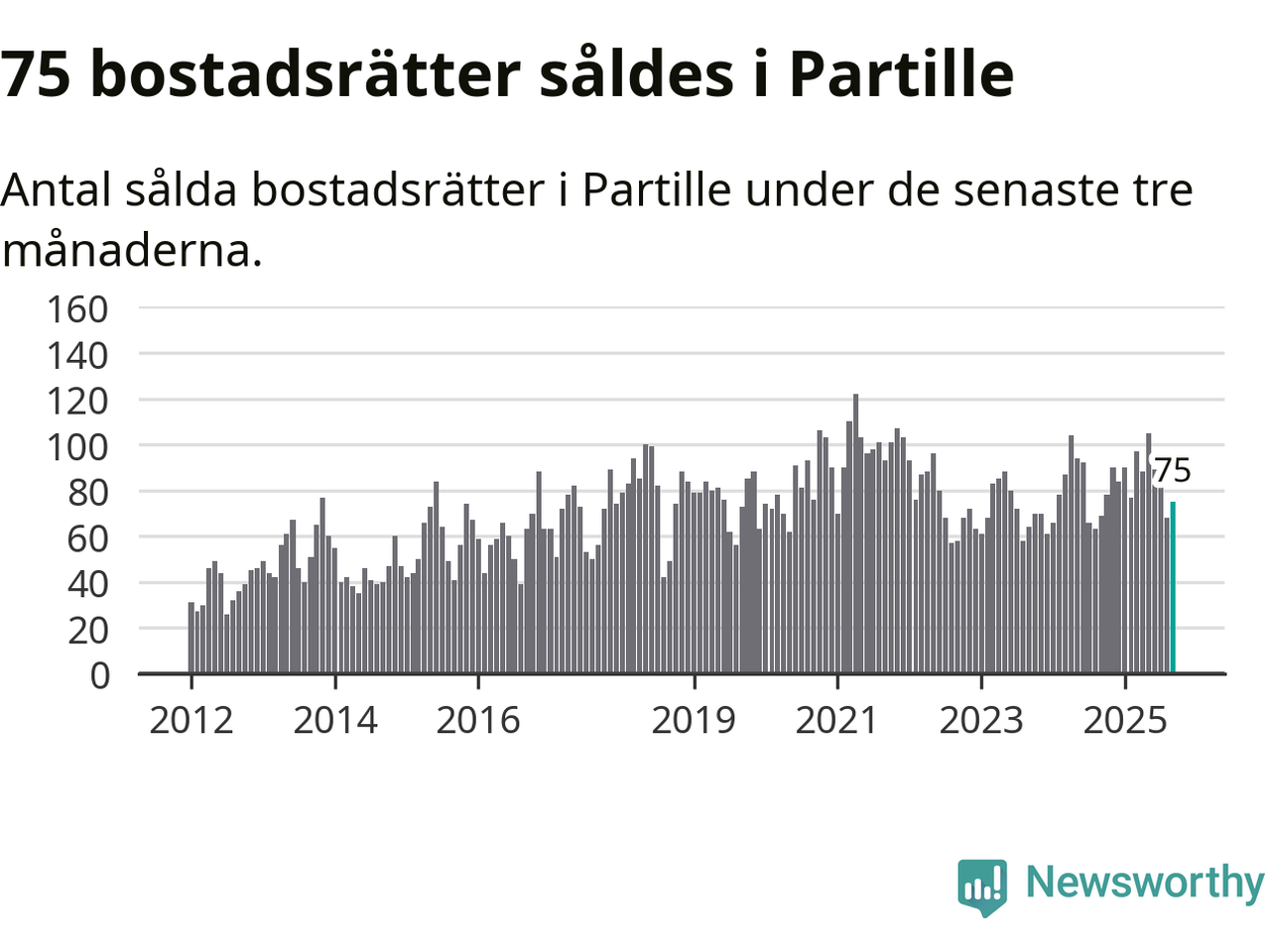 Sammanlagt såldes 75 bostadsrätter i Partille kommun mellan juli och september till ett genomsnittligt pris på 2,7 miljoner kronor. I fjol gjordes 69 affärer vid den här tiden på året.