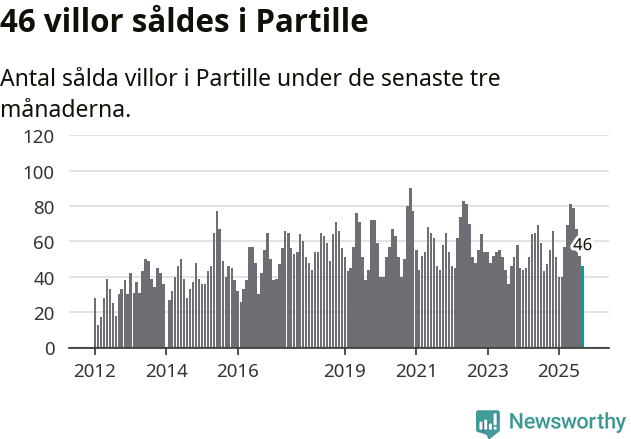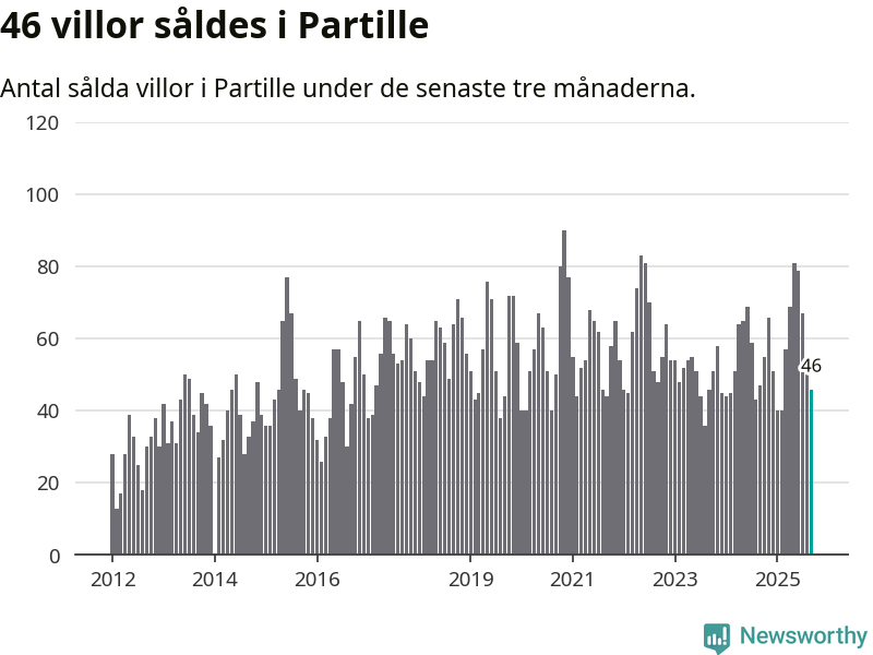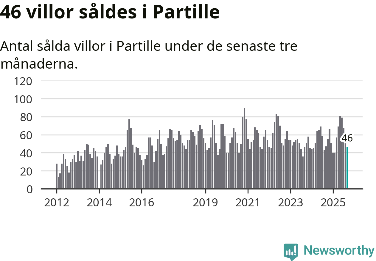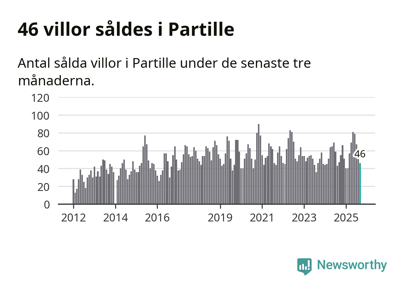Sammanlagt såldes 46 villor i Partille kommun mellan juli och september till ett genomsnittligt pris på 6,3 miljoner kronor. I fjol gjordes 47 affärer vid den här tiden på året.
