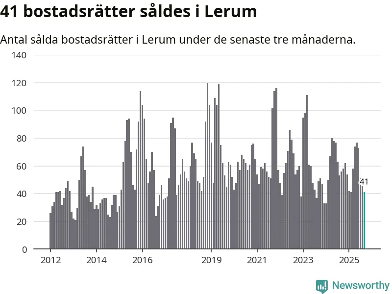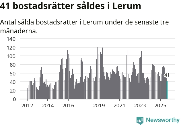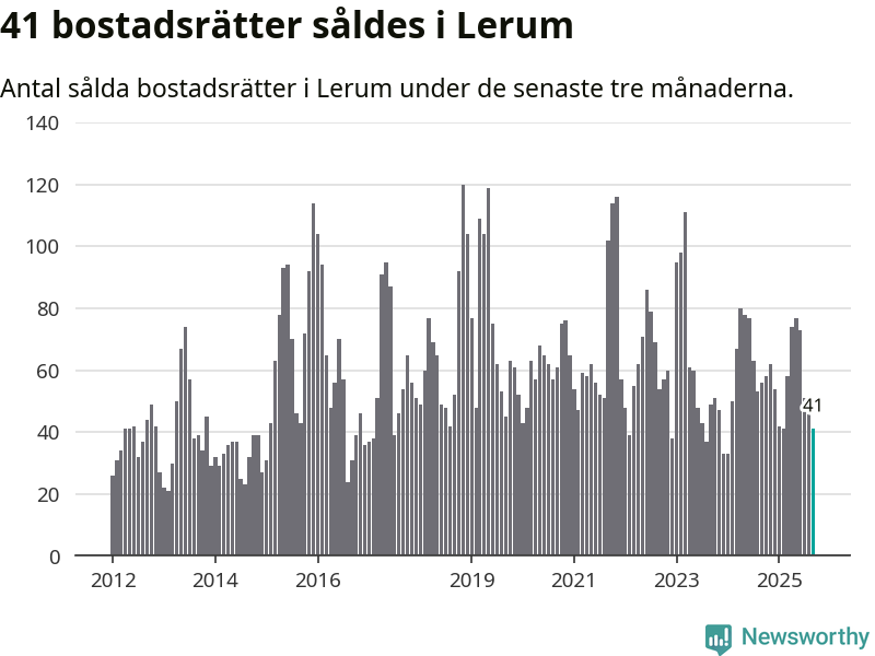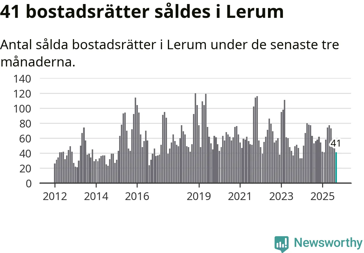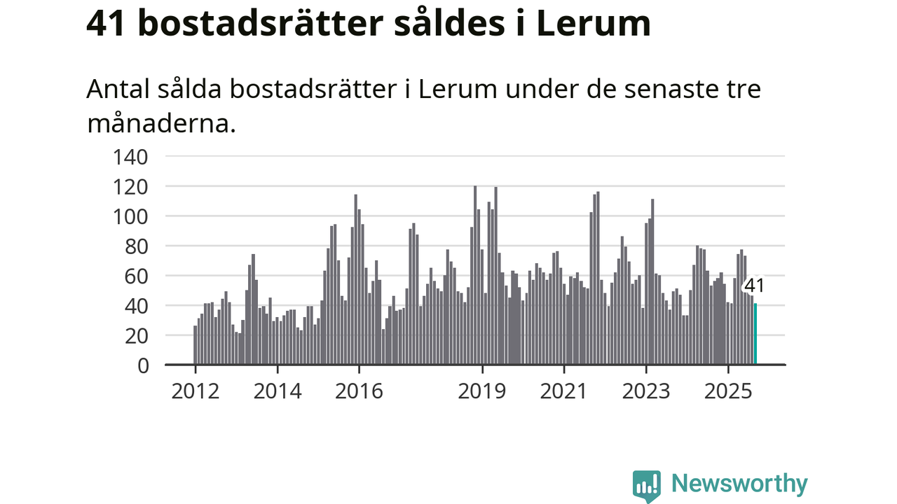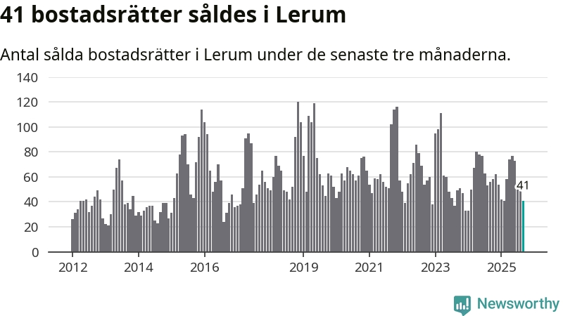 Sammanlagt såldes 41 bostadsrätter i Lerums kommun mellan juli och september till ett genomsnittligt pris på 2,3 miljoner kronor. I fjol gjordes 56 affärer vid den här tiden på året.
