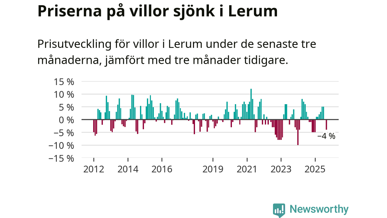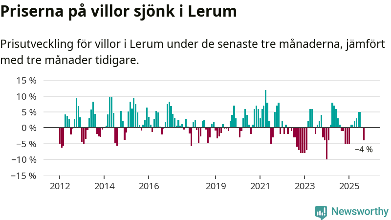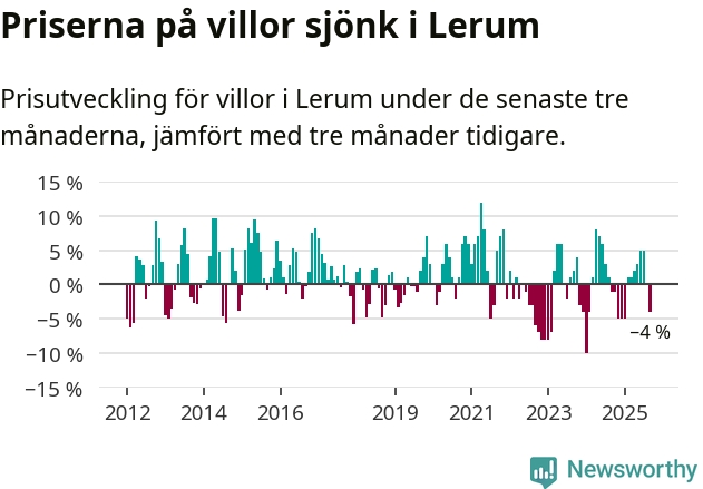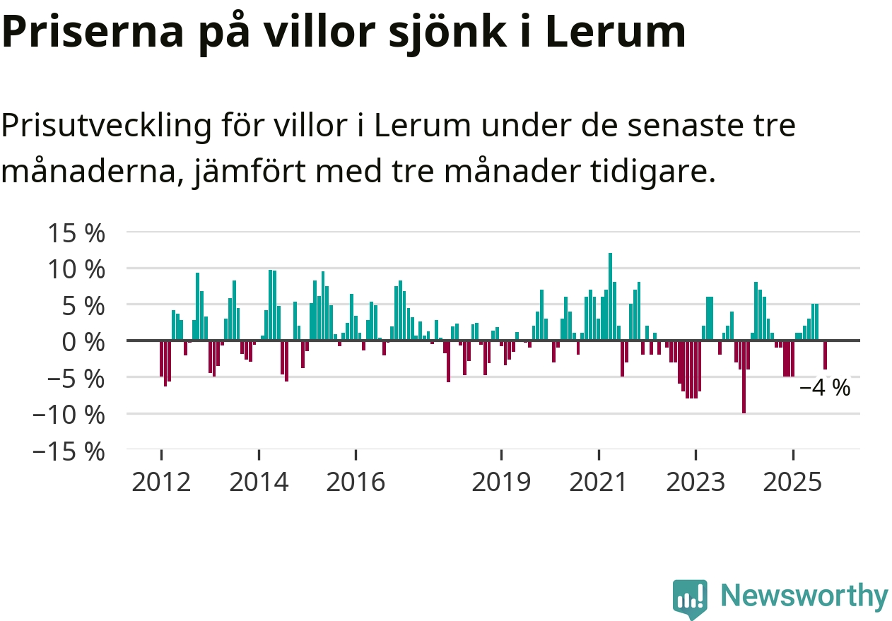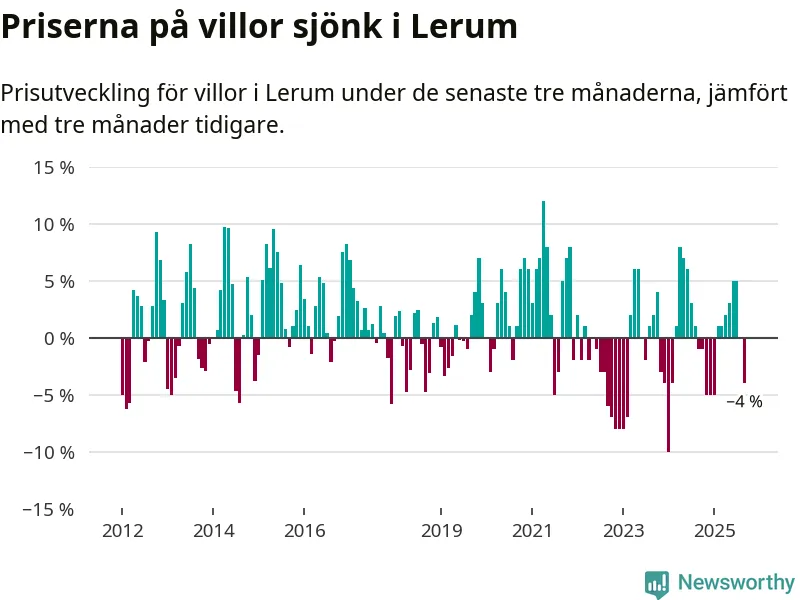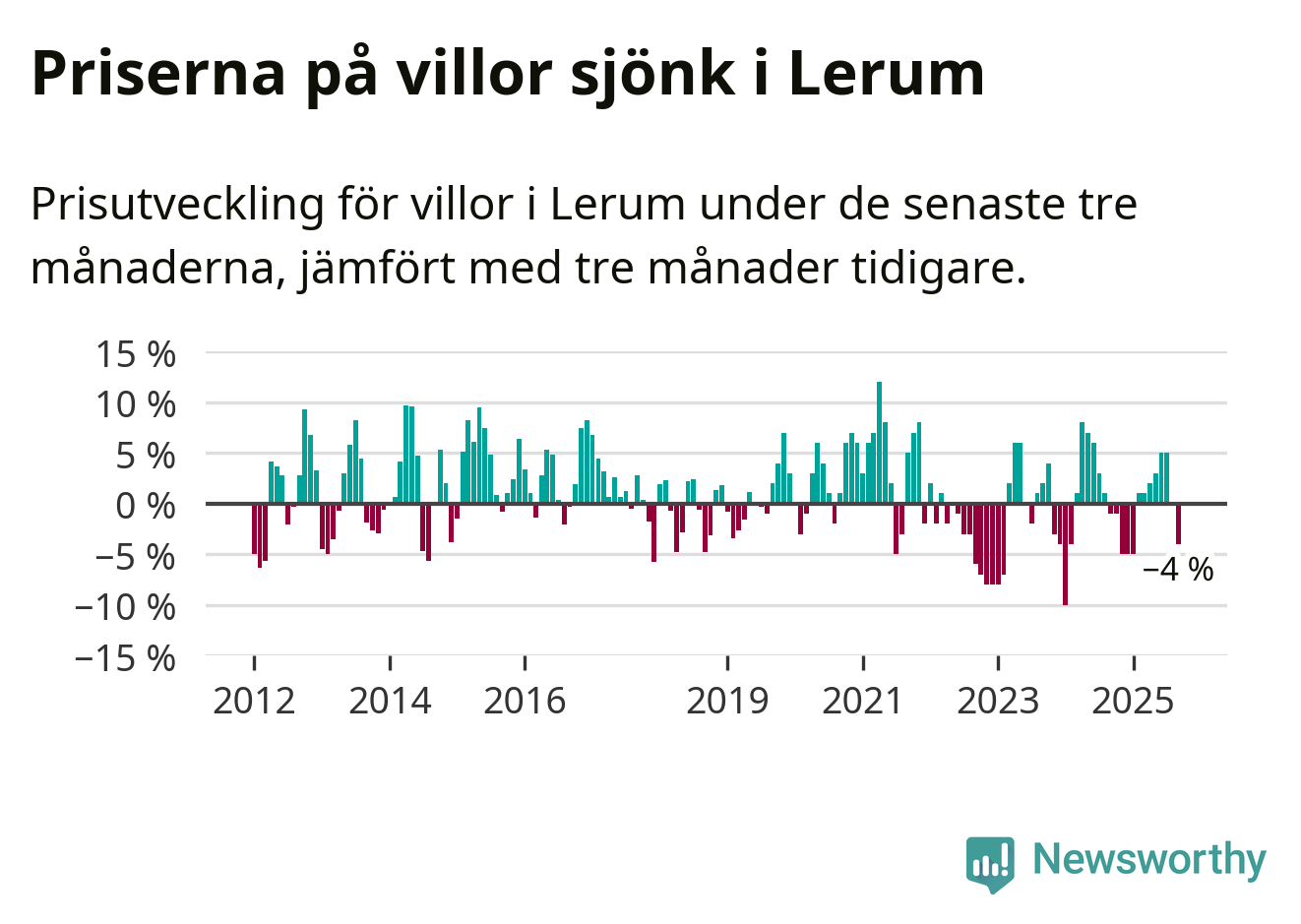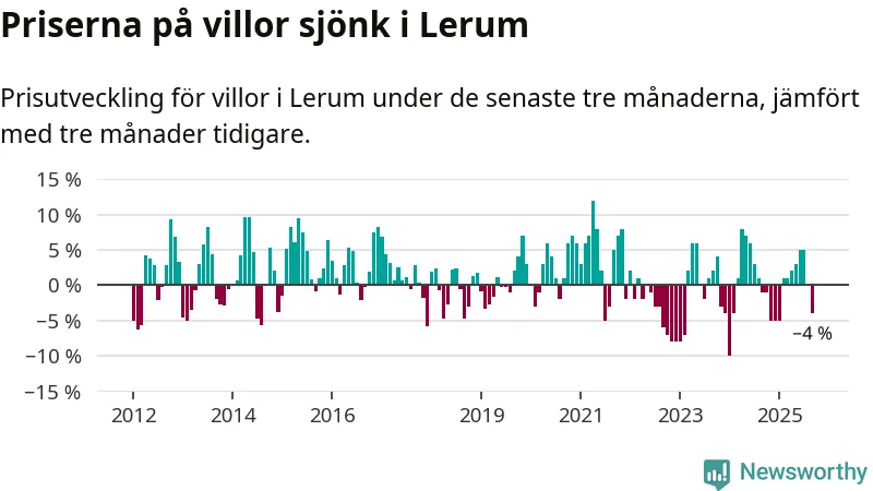 Villapriserna har gått ner i Lerums kommun. Medelpriset på försäljningarna under de senaste tre månaderna visar på en nedgång med 4 procent.