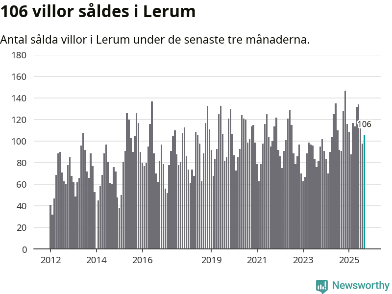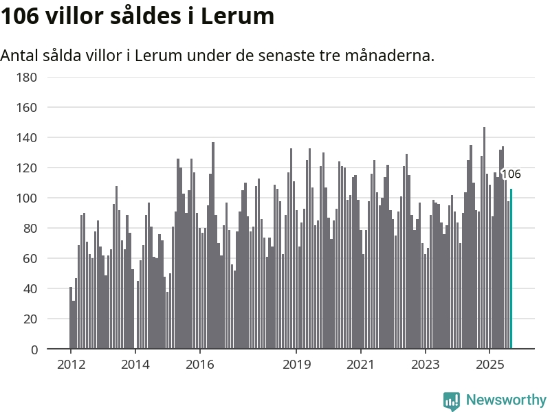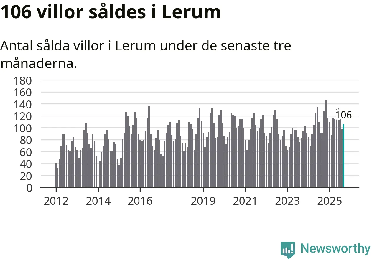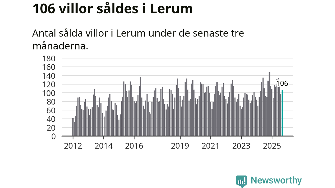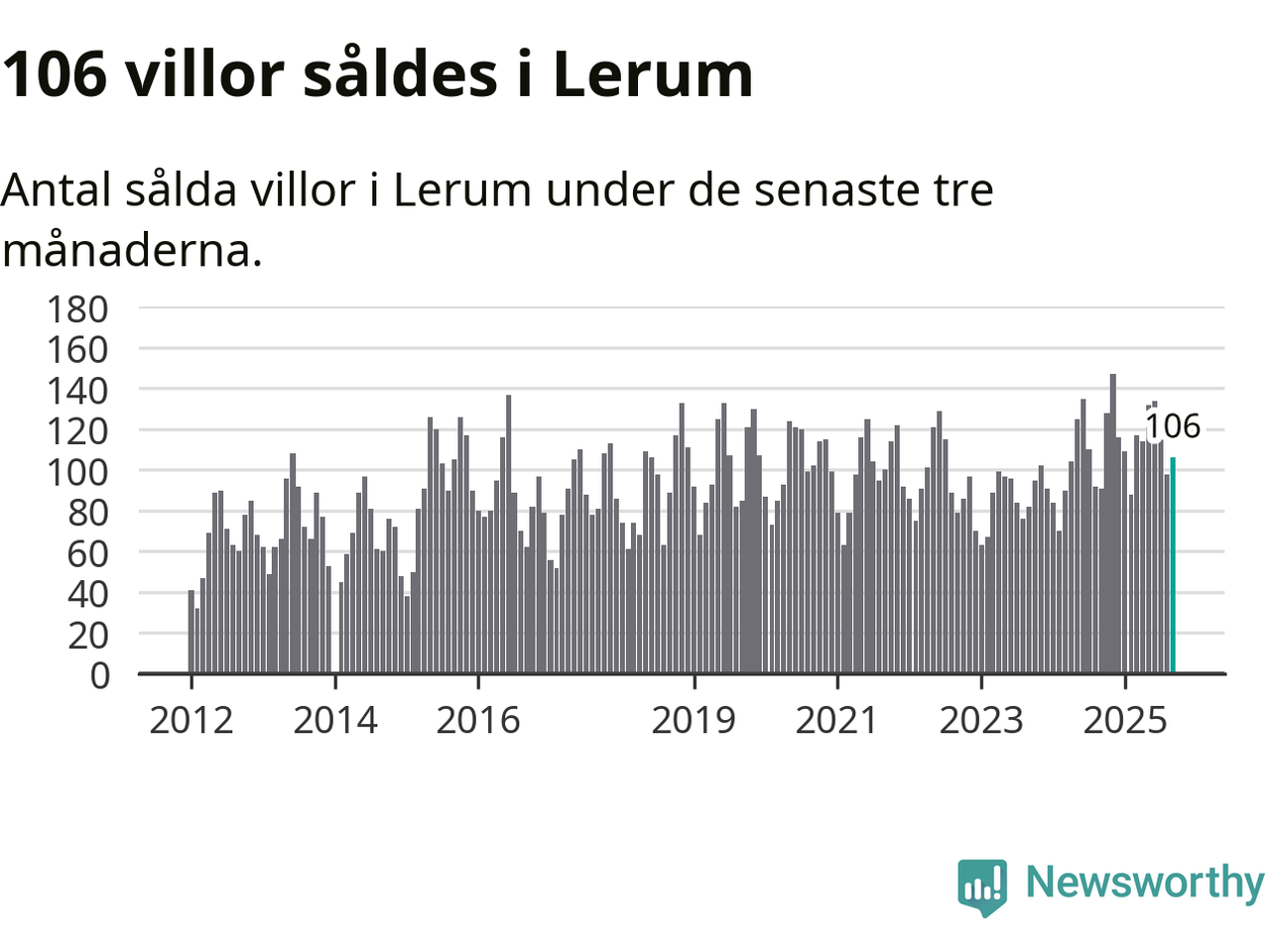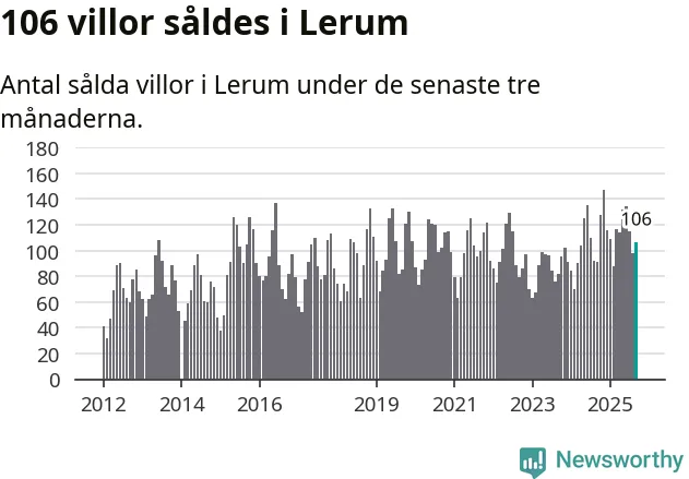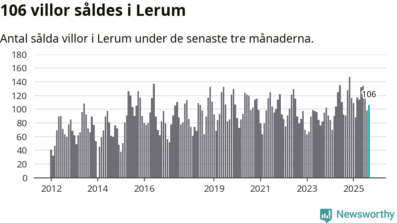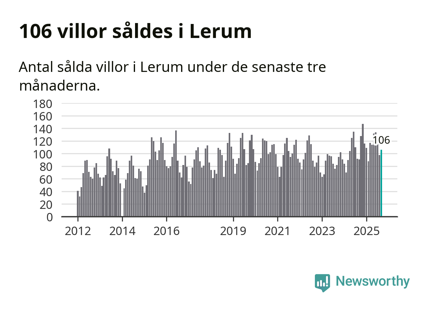 Sammanlagt såldes 106 villor i Lerums kommun mellan juli och september till ett genomsnittligt pris på 4,8 miljoner kronor. I fjol gjordes 91 affärer vid den här tiden på året.