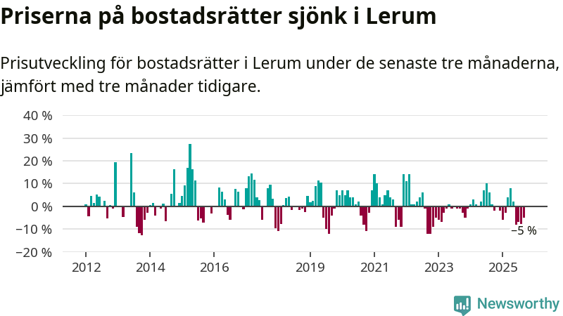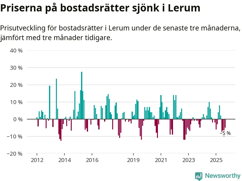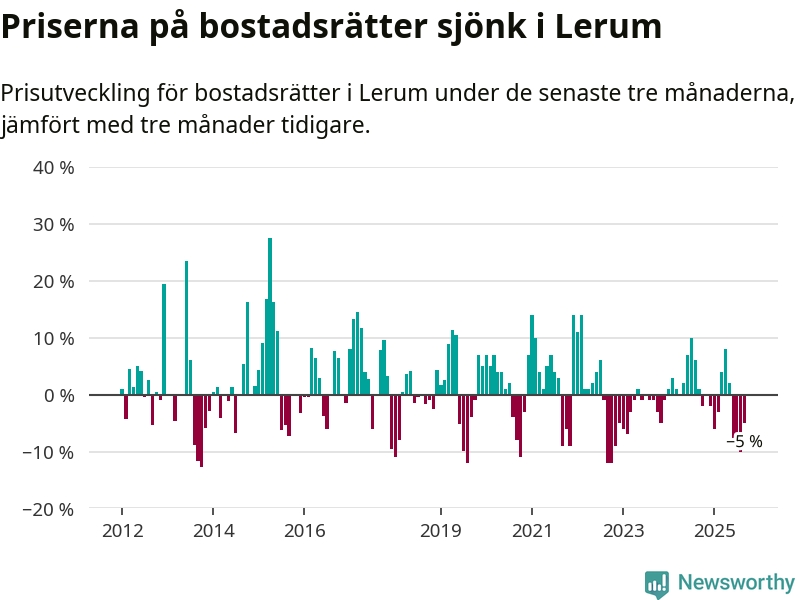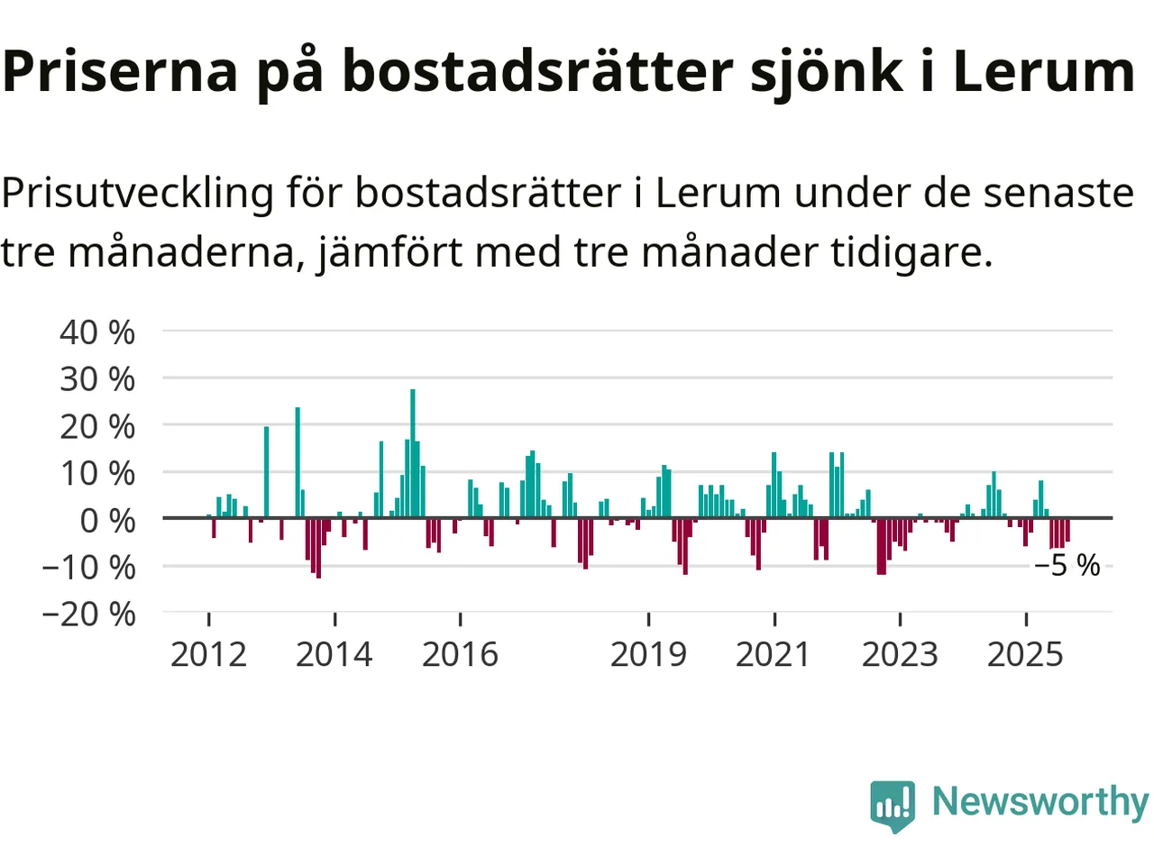 Priserna på bostadsrätter har gått ner i Lerums kommun. Medelpriset på försäljningarna under de senaste tre månaderna visar på en nedgång med 5 procent.
