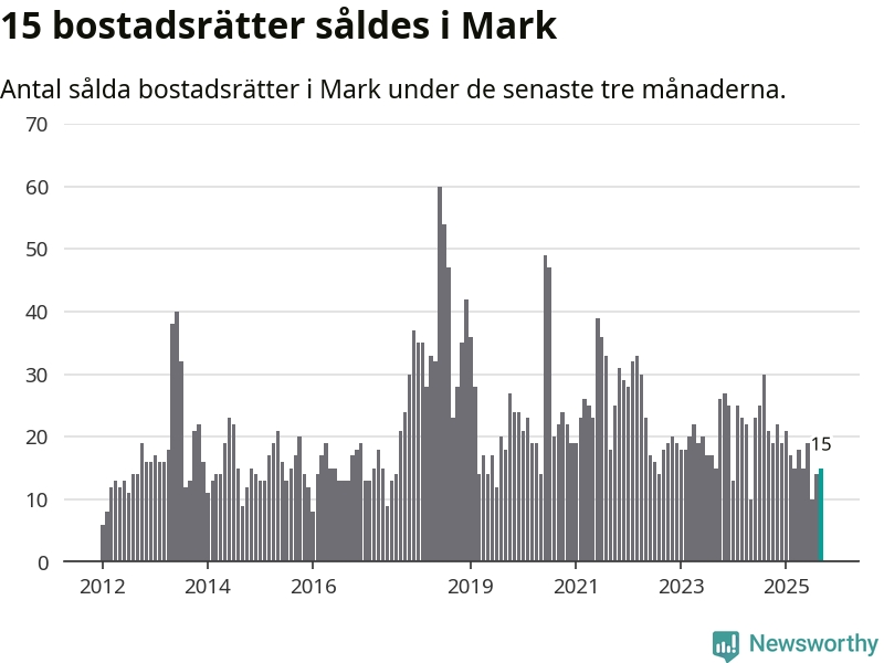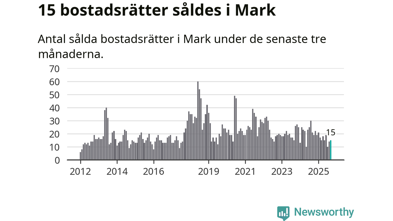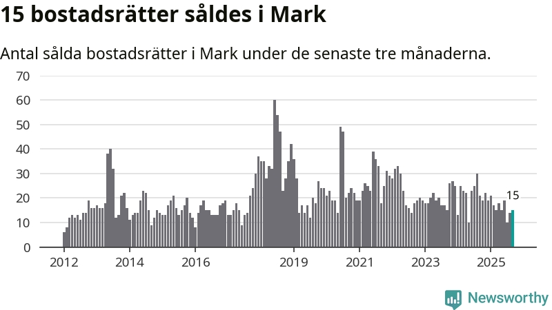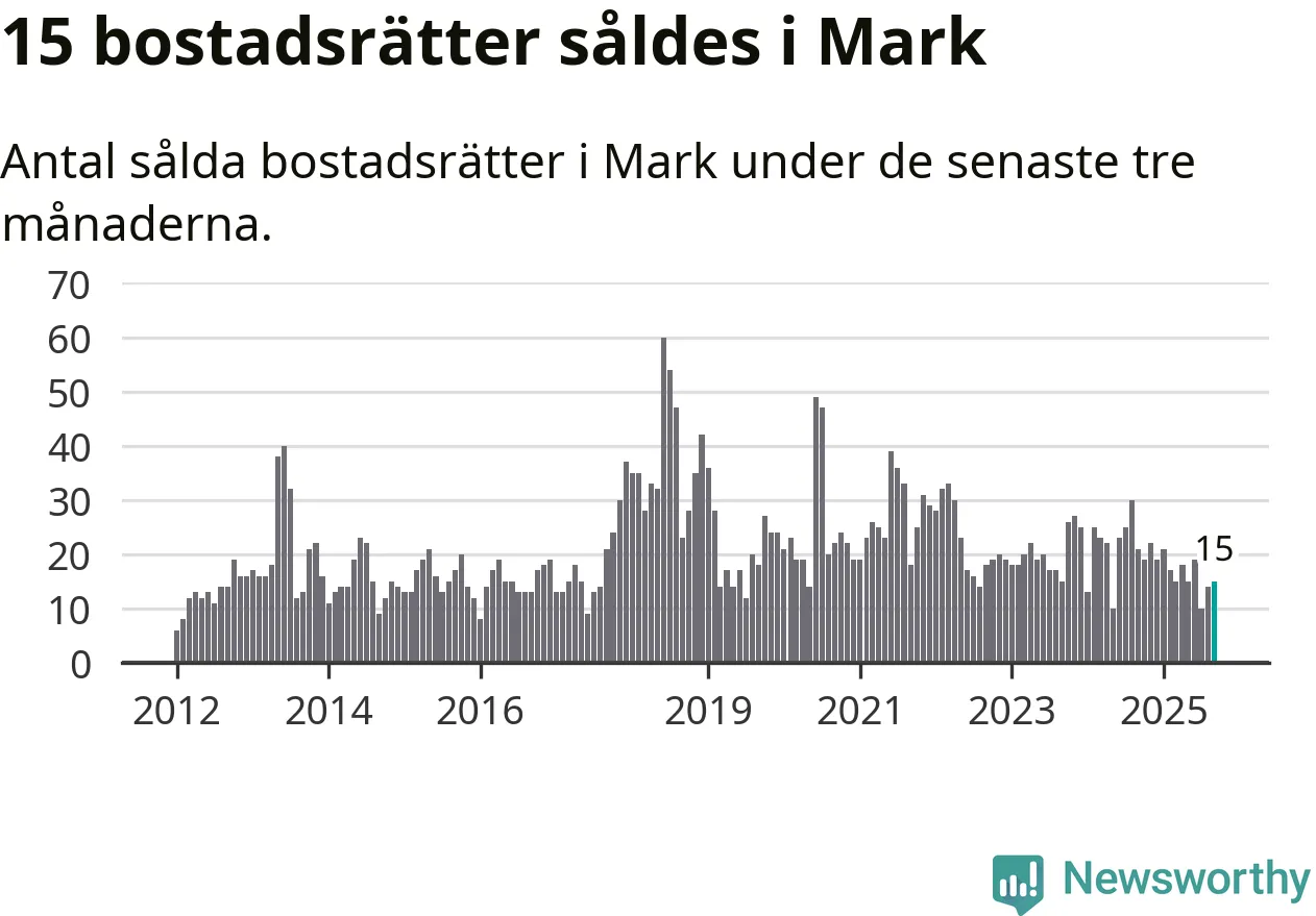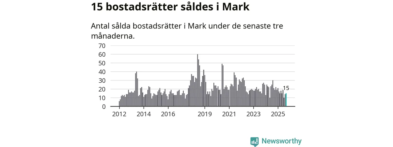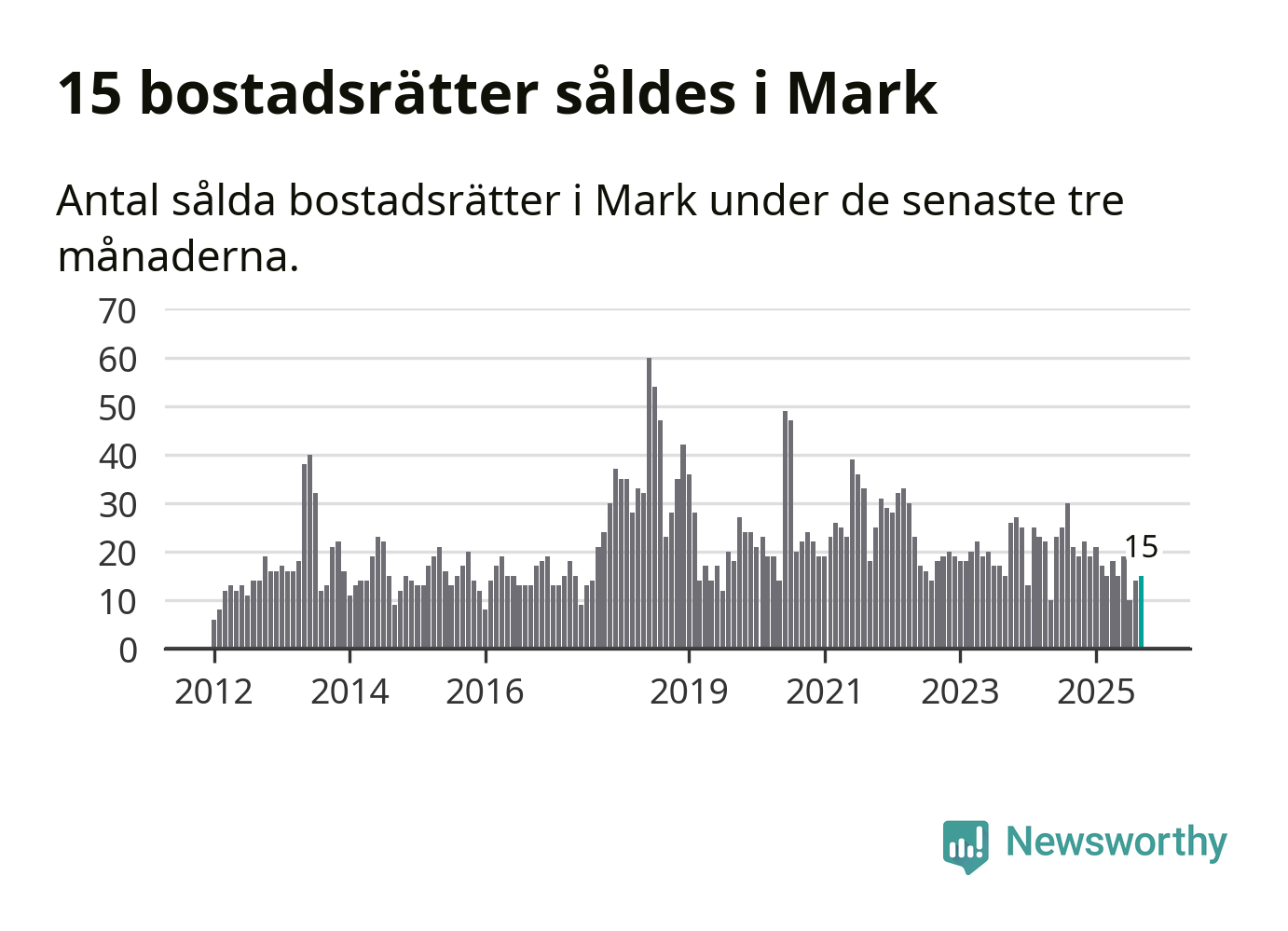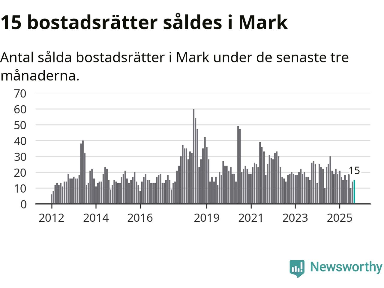 Mellan juli och september gjordes sammanlagt 15 affärer med bostadsrätter i Marks kommun. Det kan jämföras med 21 vid motsvarande tid i fjol.