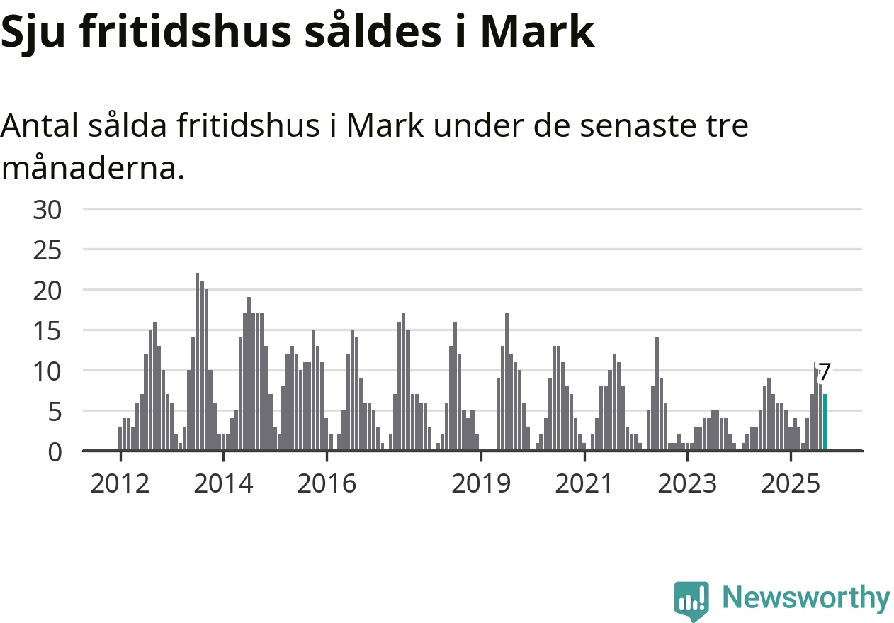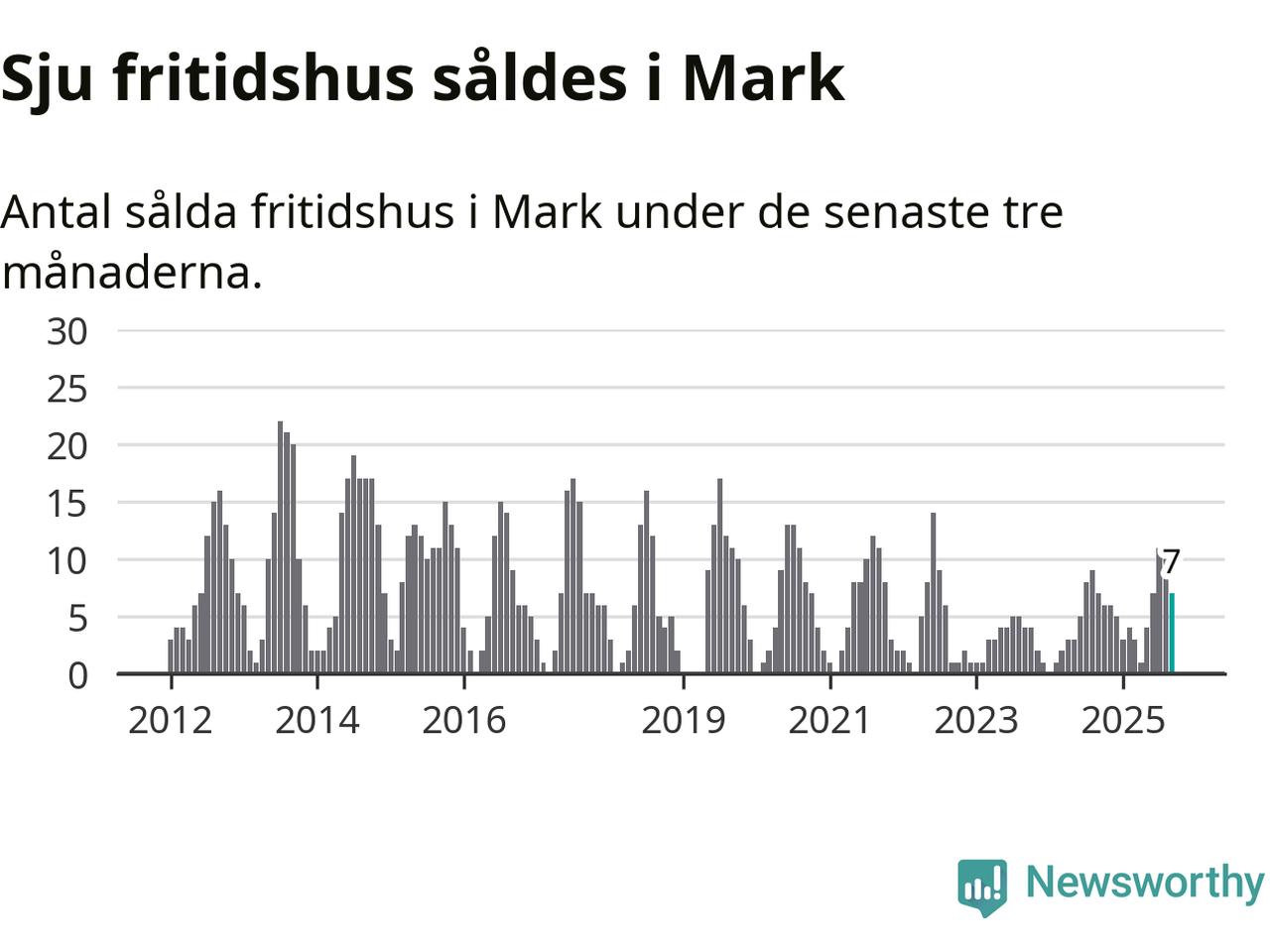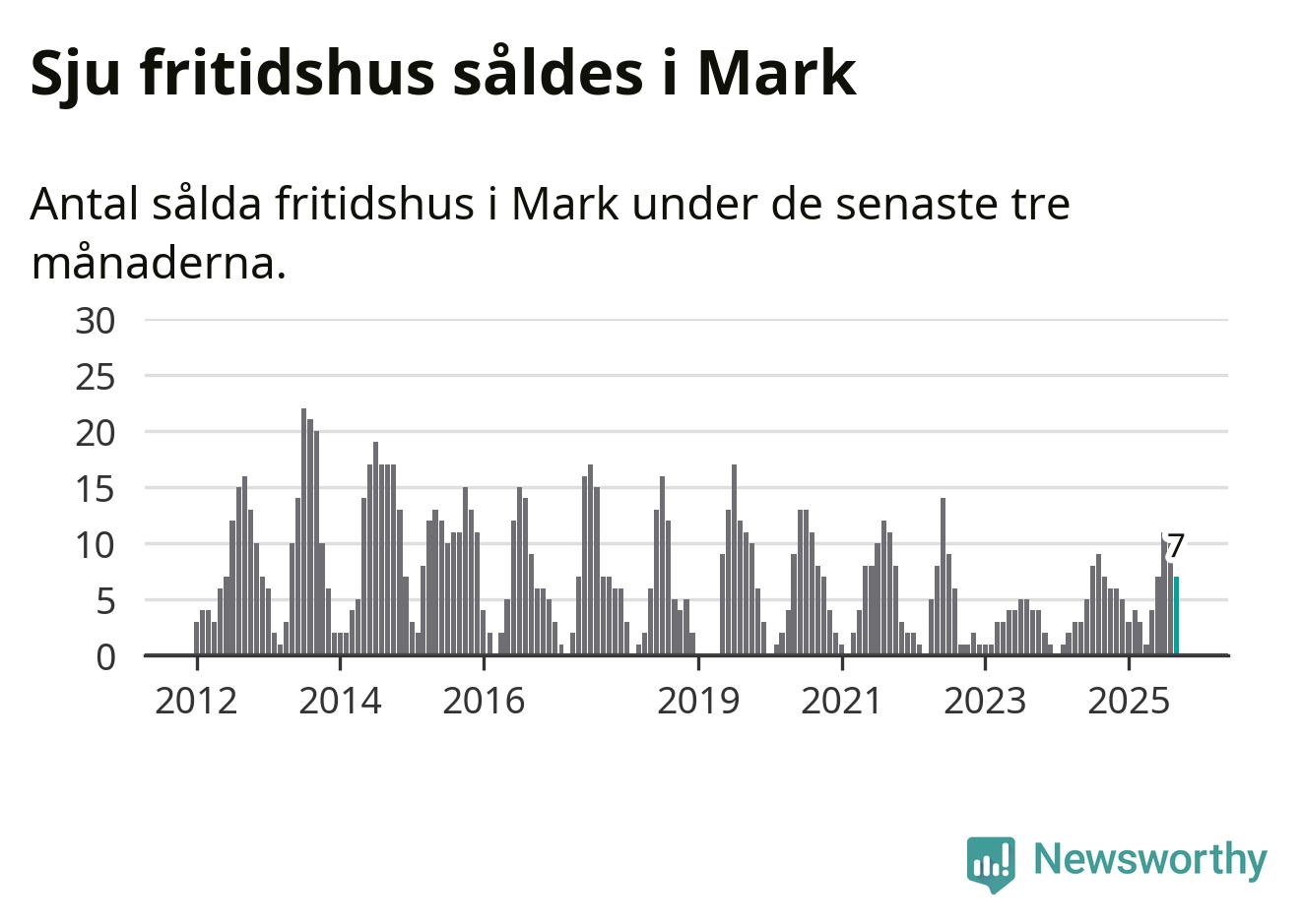 Mellan juli och september gjordes sammanlagt sju affärer med fritidshus i Marks kommun. Det är lika många affärer som vid motsvarande tid i fjol.
