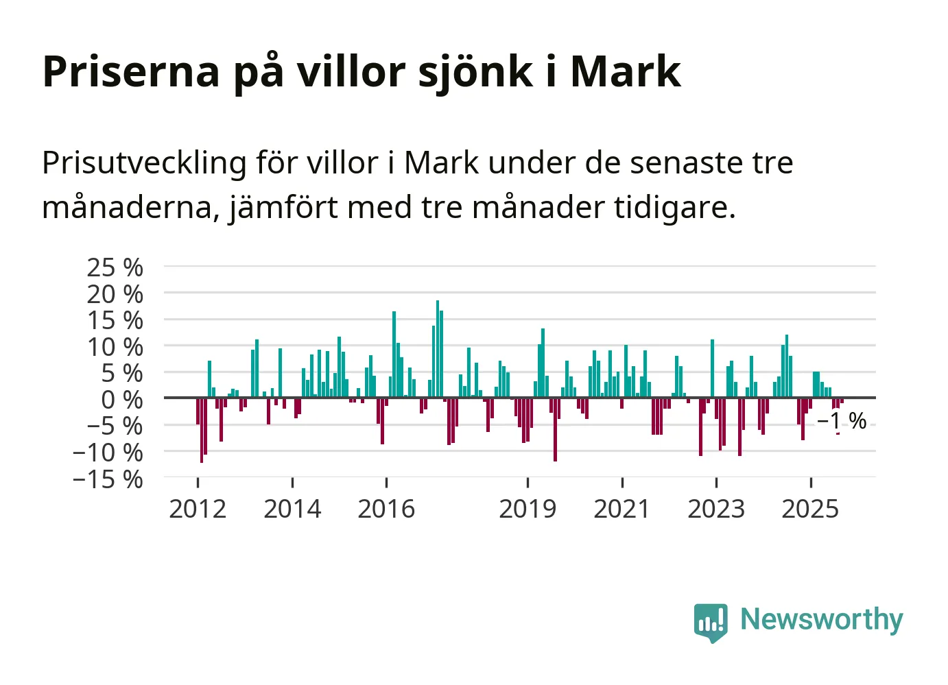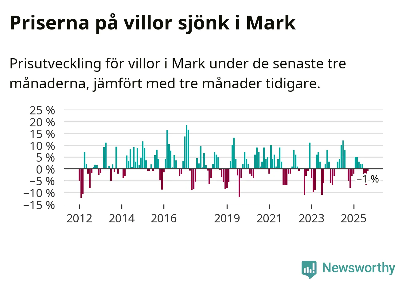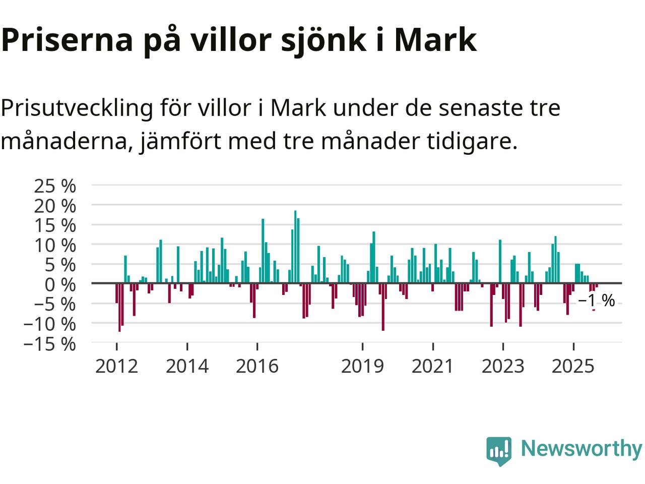 Statistiken visar även på en prisnedgång i Marks kommun. Medelpriset på försäljningarna av villor i kommunen var 1 procent lägre än för tre månader sedan. I hela Västra Götaland däremot ligger villapriserna stilla.