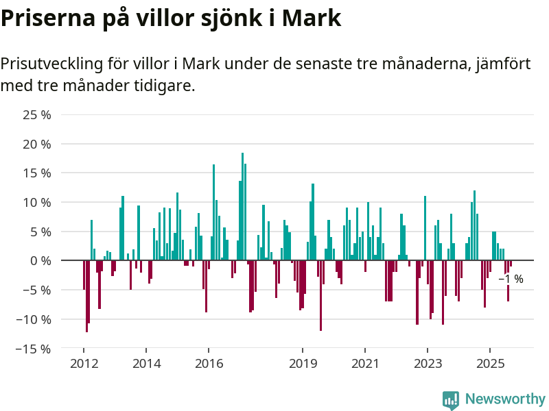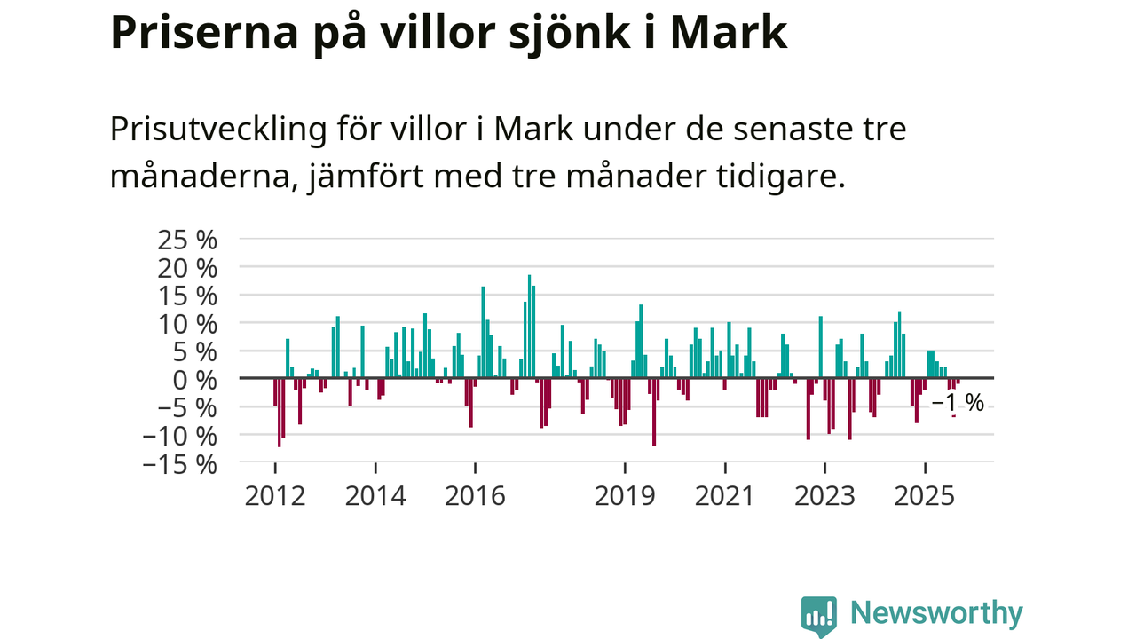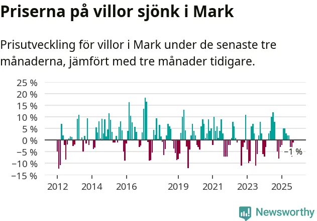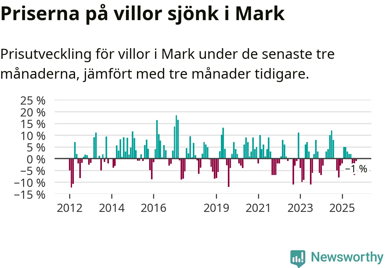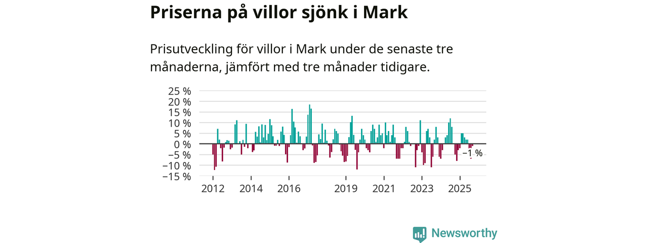 Statistiken visar även på en prisnedgång i Marks kommun. Medelpriset på försäljningarna av villor i kommunen var 1 procent lägre än för tre månader sedan. I hela Västra Götaland däremot ligger villapriserna stilla.