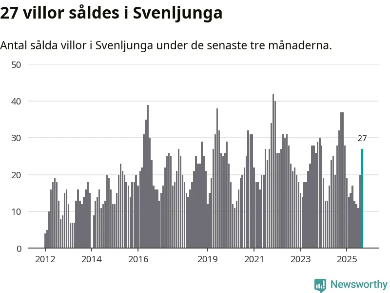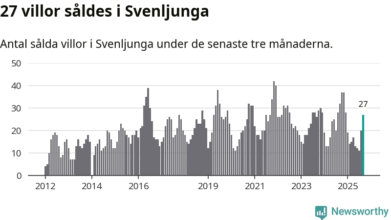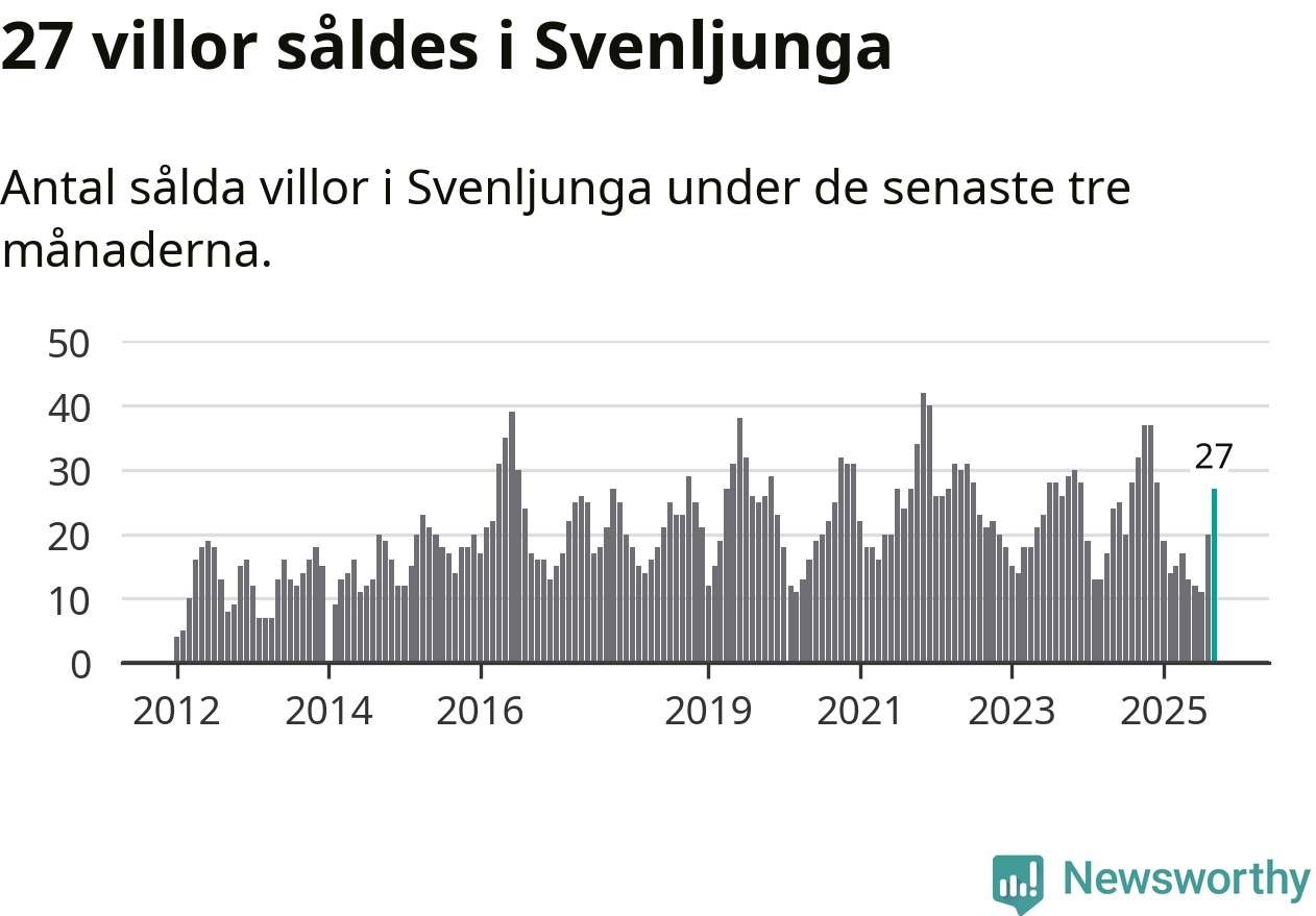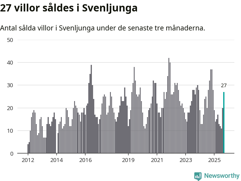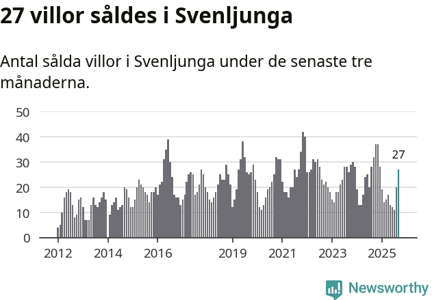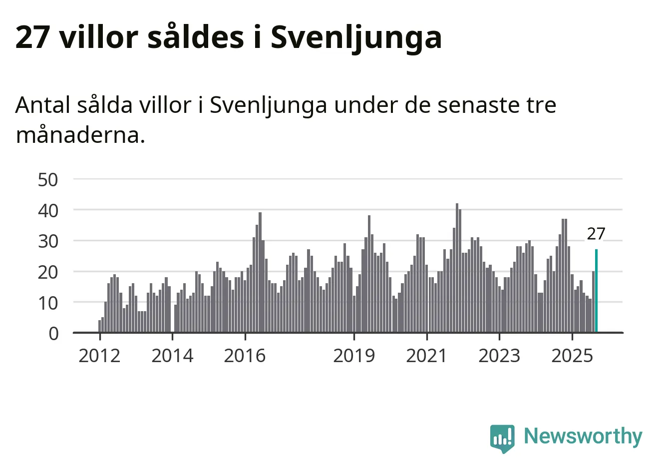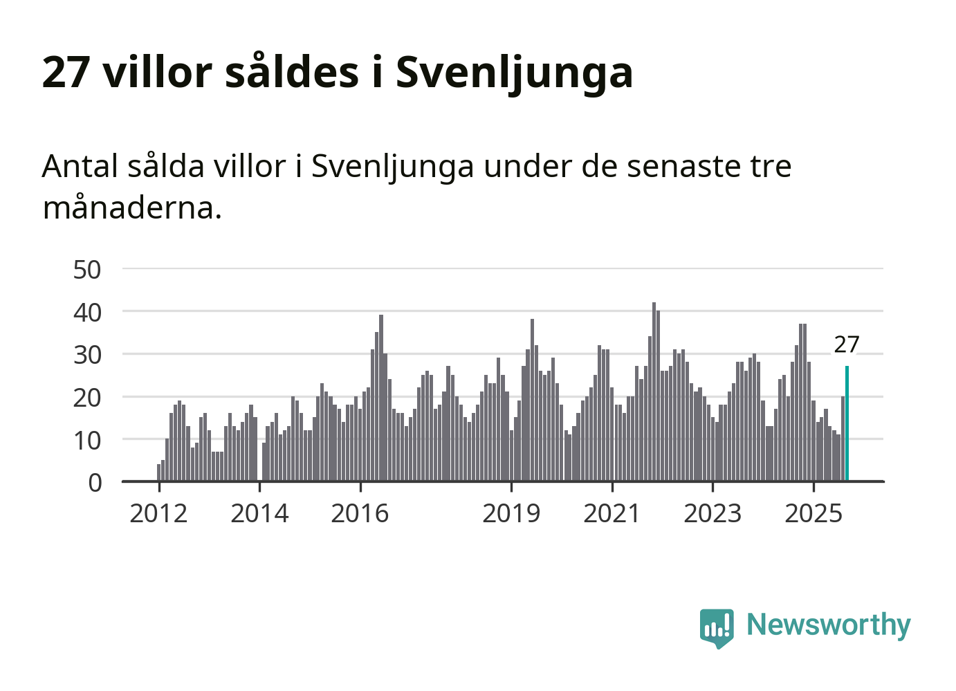 Mellan juli och september gjordes sammanlagt 27 affärer med villor i Svenljunga kommun. Det kan jämföras med 32 vid motsvarande tid i fjol.