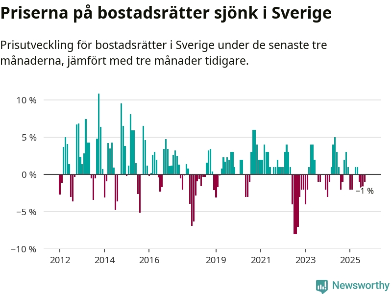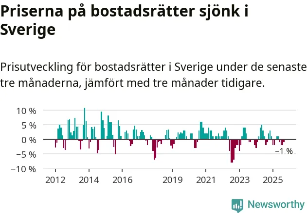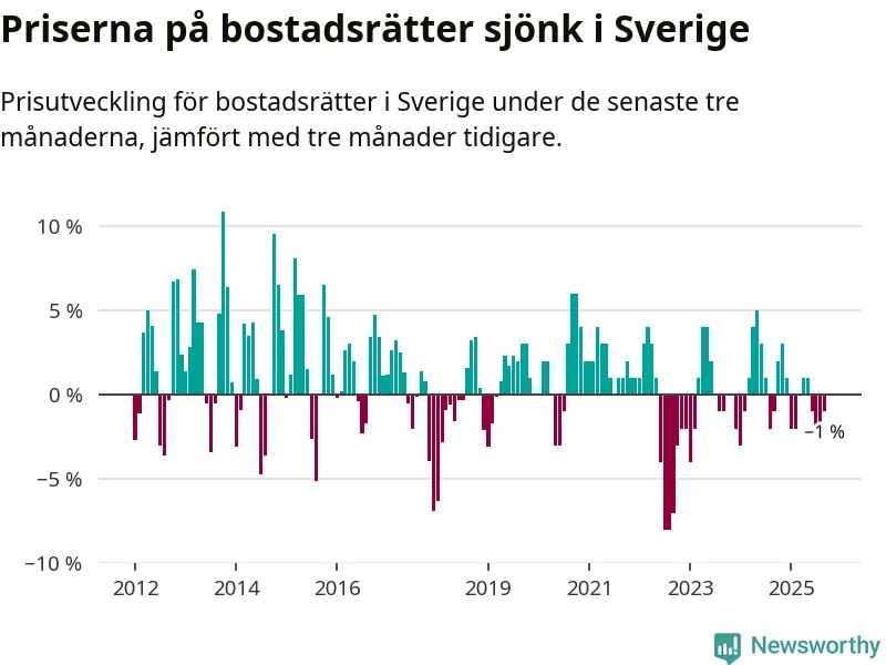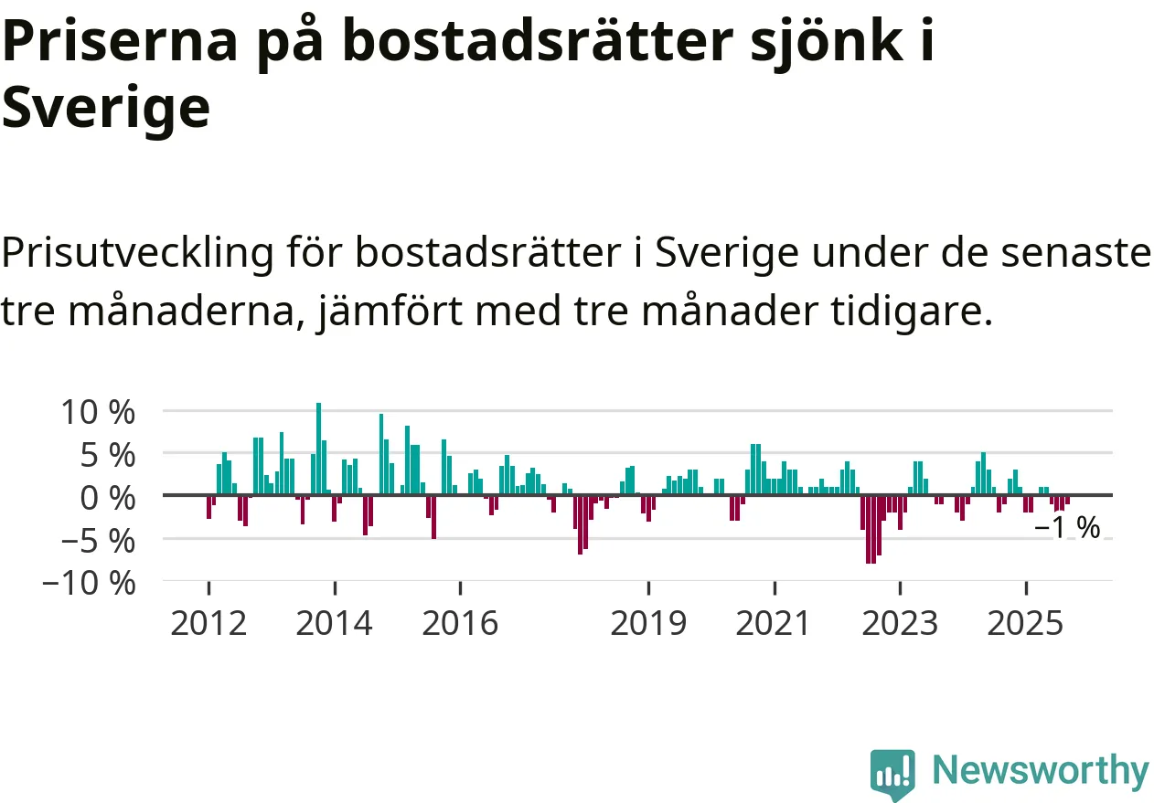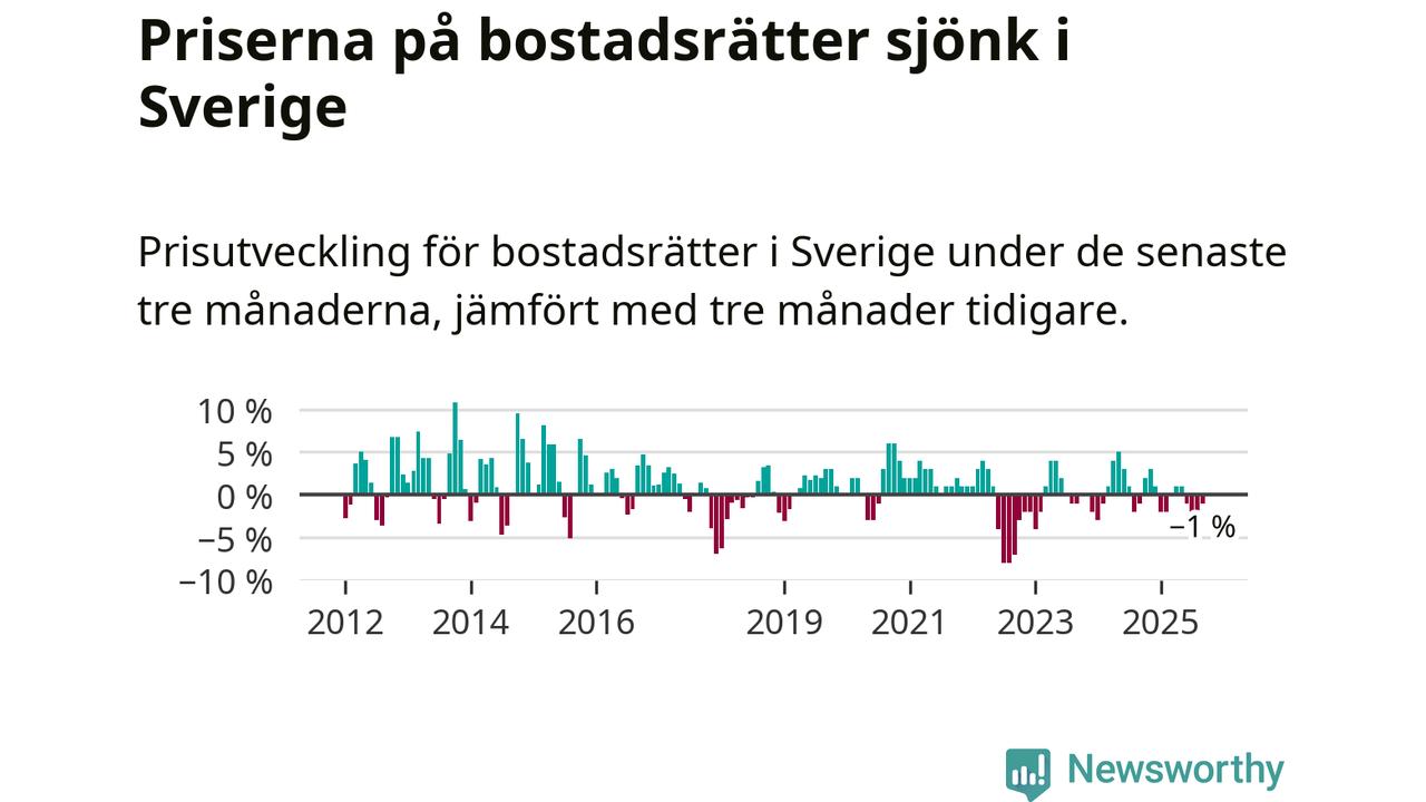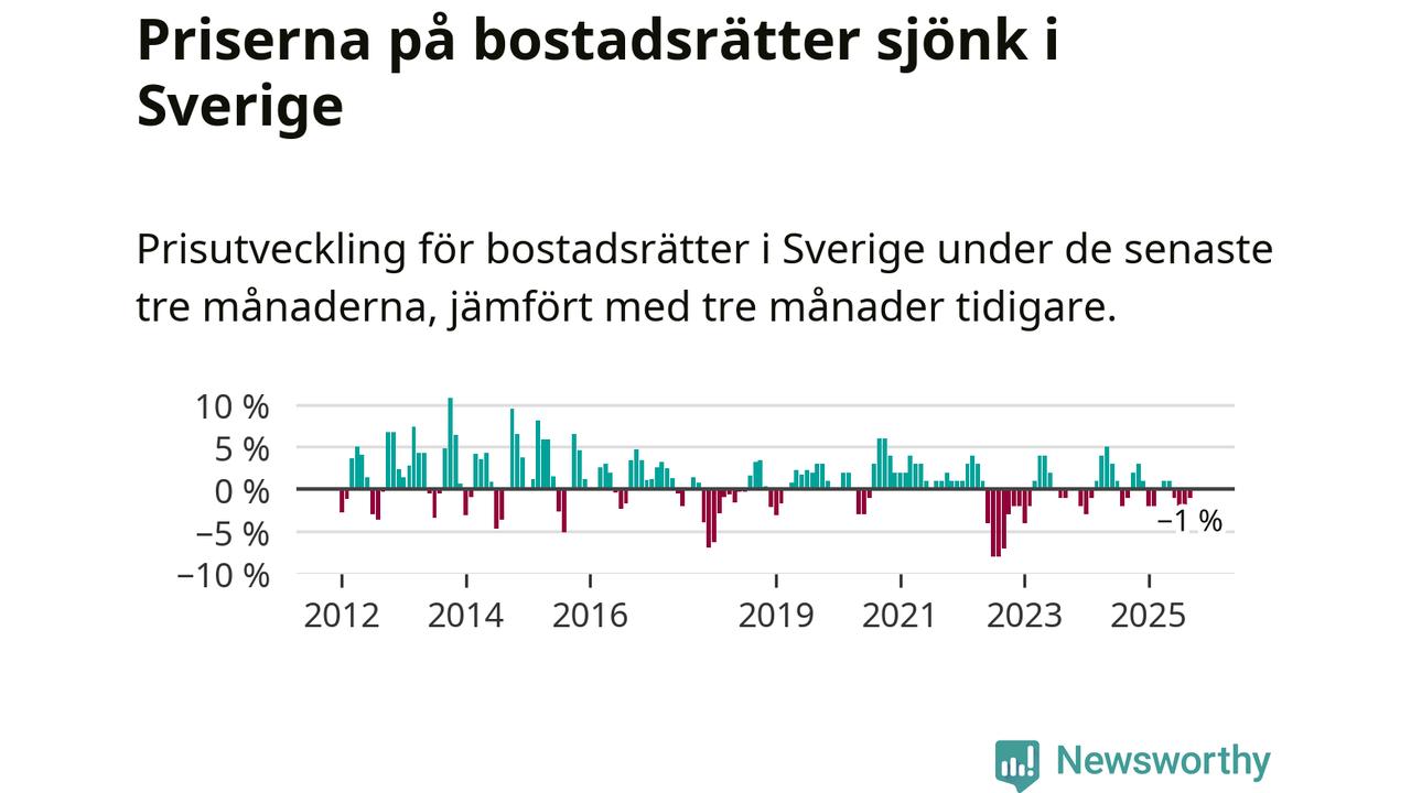 Priserna på bostadsrätter har gått ner i Sverige. Medelpriset på försäljningarna under de senaste tre månaderna visar på en nedgång med 1 procent.