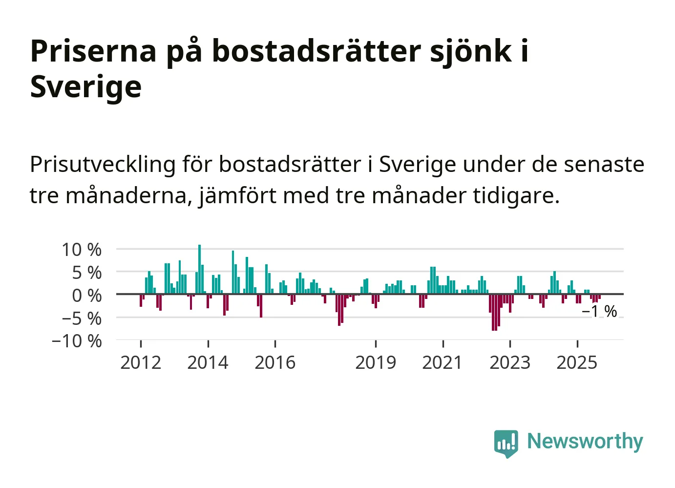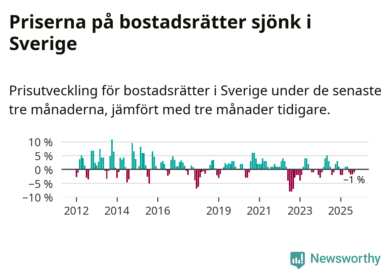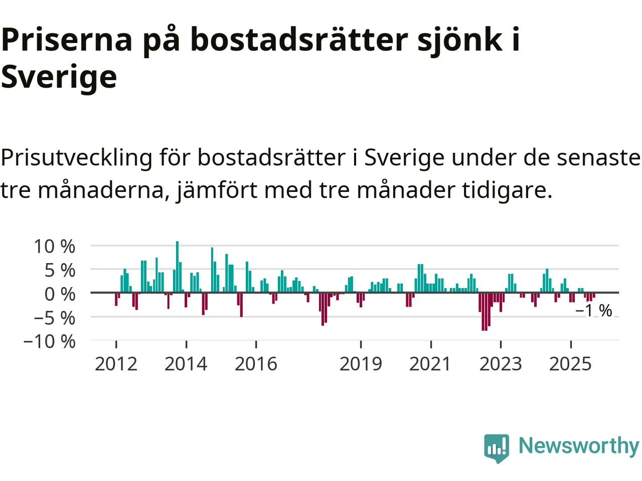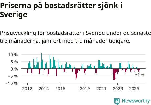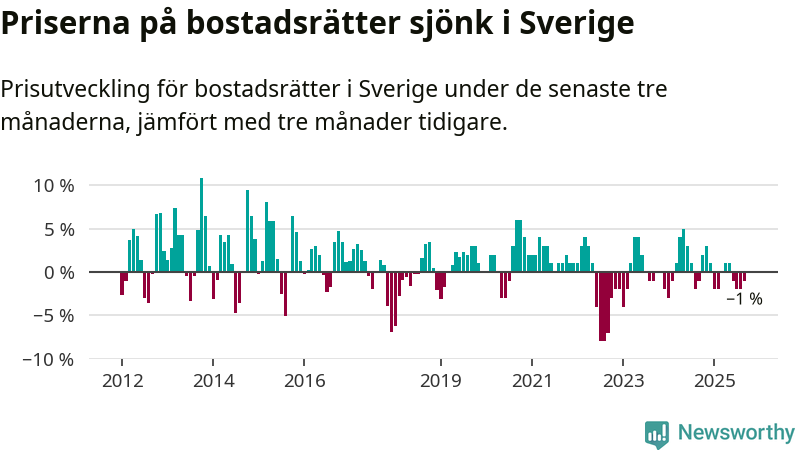 Priserna på bostadsrätter har gått ner i Sverige. Medelpriset på försäljningarna under de senaste tre månaderna visar på en nedgång med 1 procent.