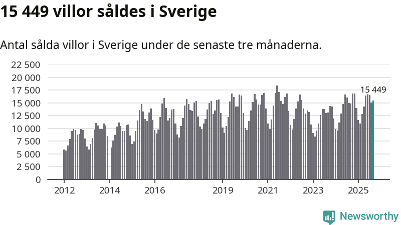 Sammanlagt såldes 15 449 villor i Sverige mellan juli och september till ett genomsnittligt pris på 3,9 miljoner kronor. I fjol gjordes 14 833 affärer vid den här tiden på året.